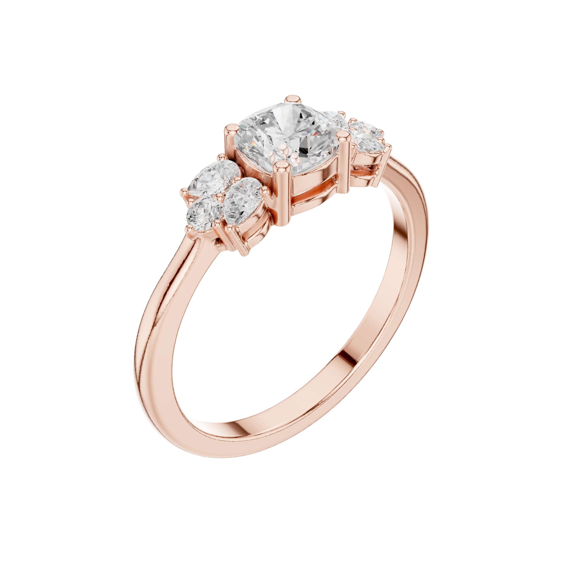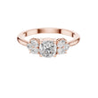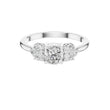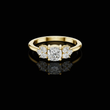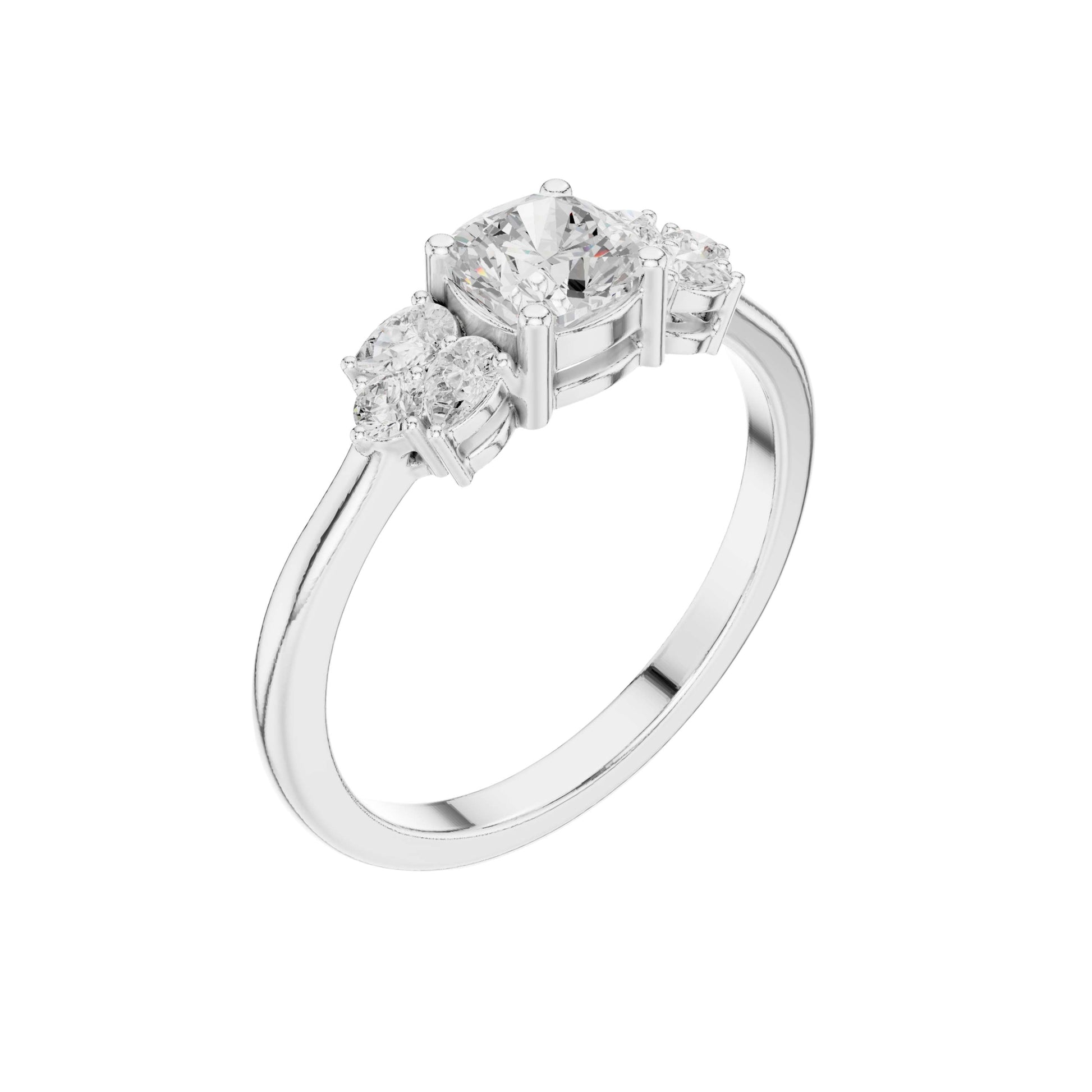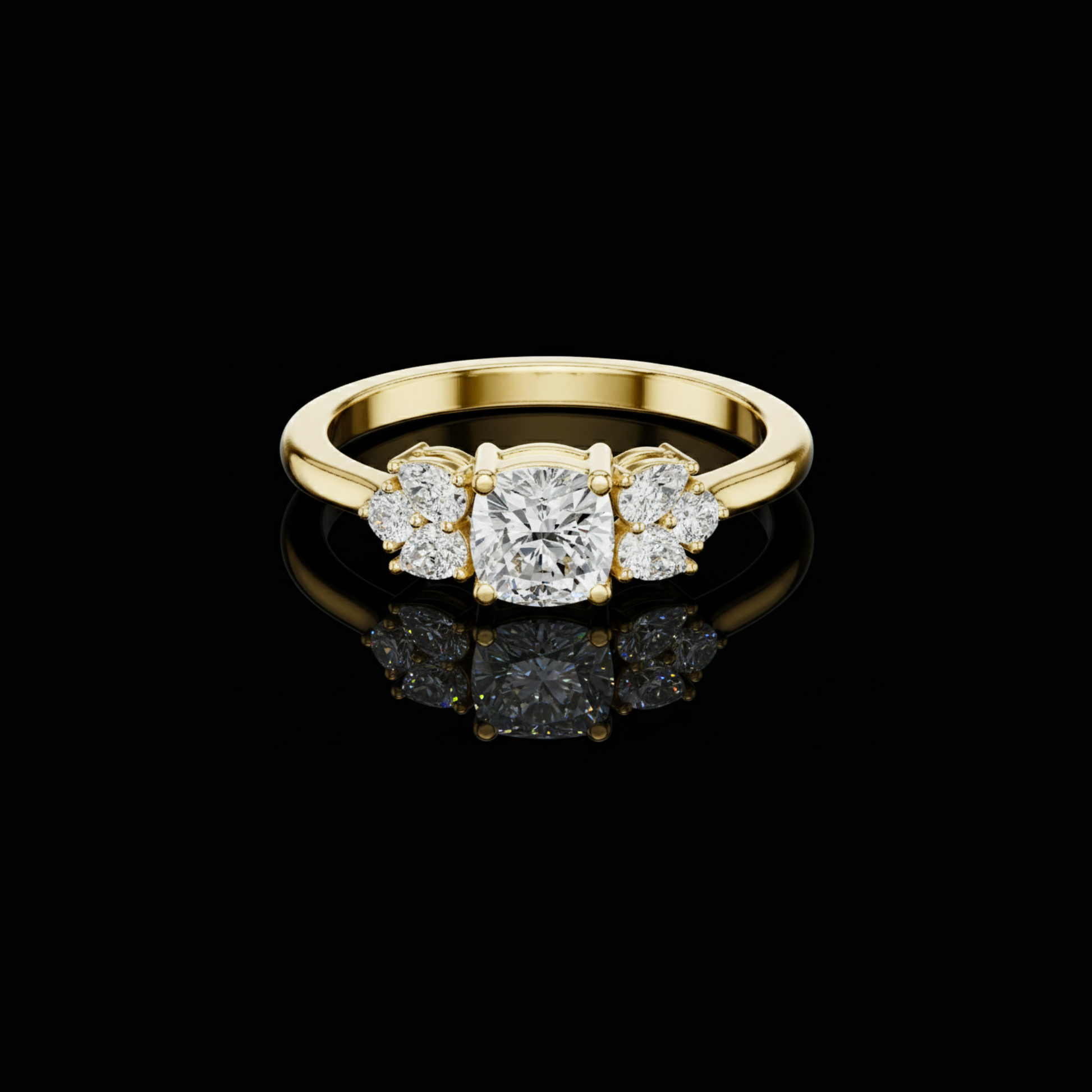 This refined ring features a luminous cushion-cut center diamond set in polished gold, beautifully complemented by petite pear and round diamond clusters on each side that create a soft floral-inspired silhouette. The balanced design enhances the brilliance of the center stone while adding depth and sparkle through its elegant side accents. With its classic proportions and romantic detailing, this ring offers a timeless yet distinctive look—perfect for an engagement, anniversary, or a meaningful statement of enduring elegance.