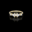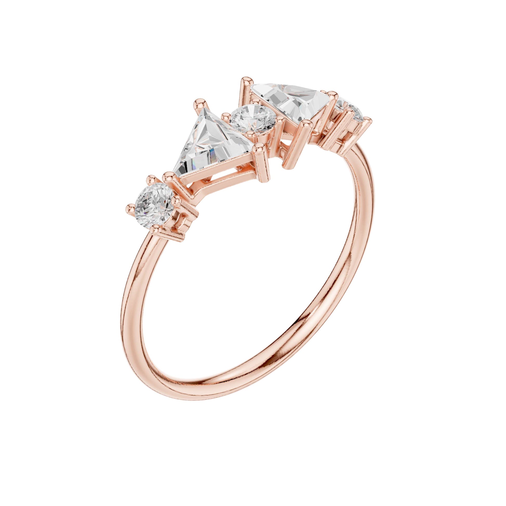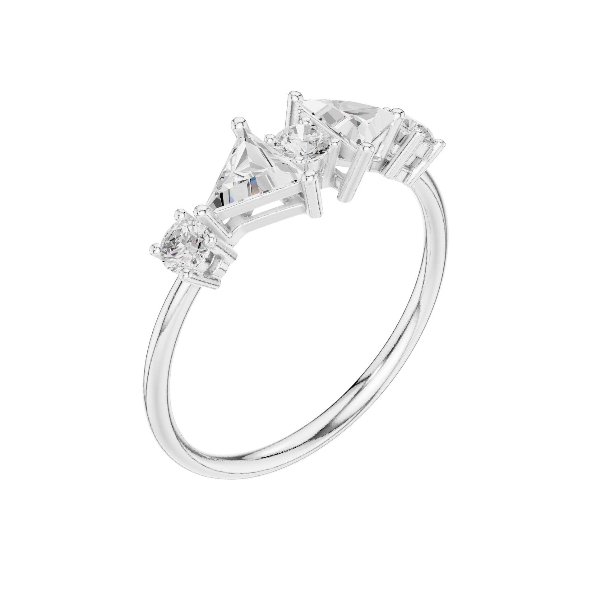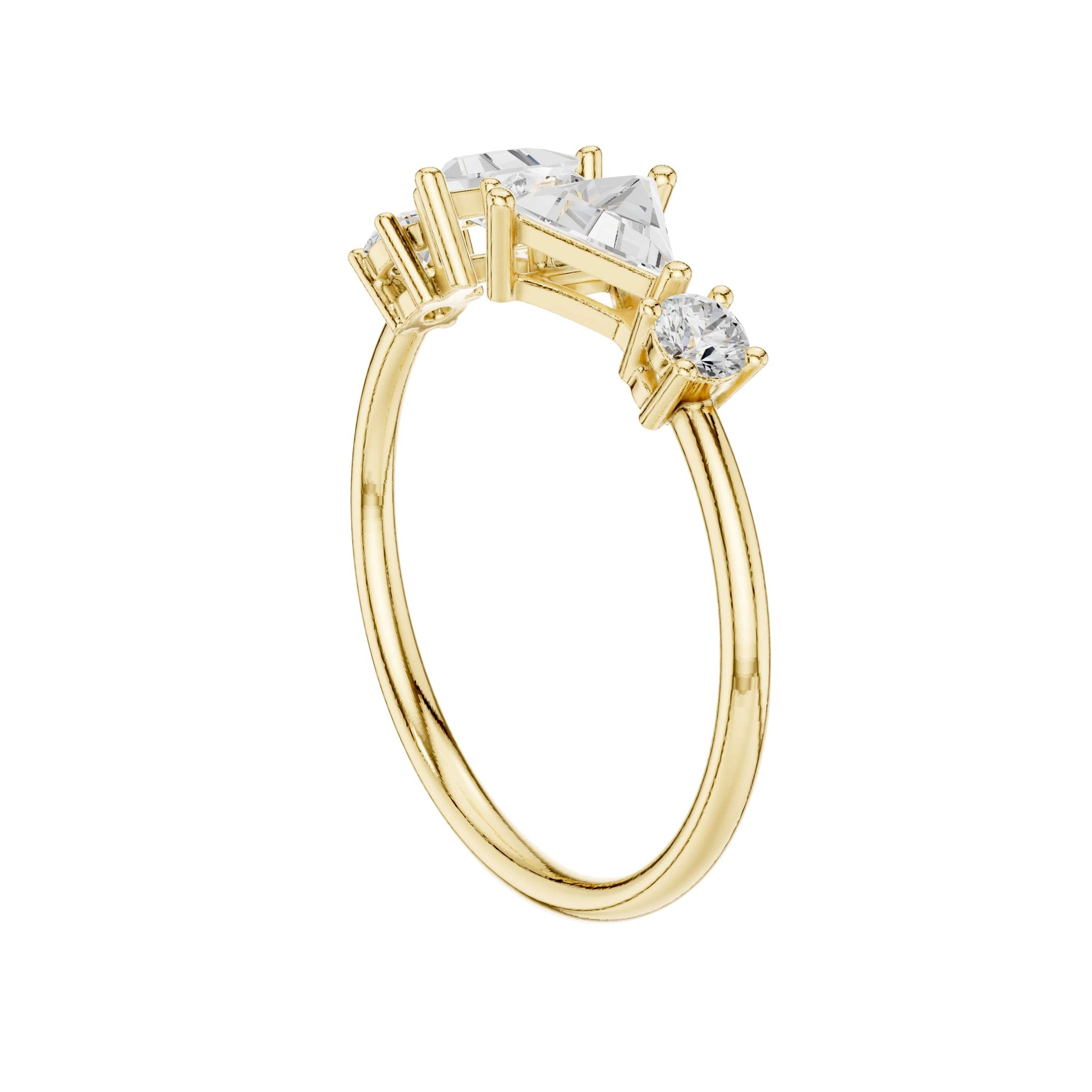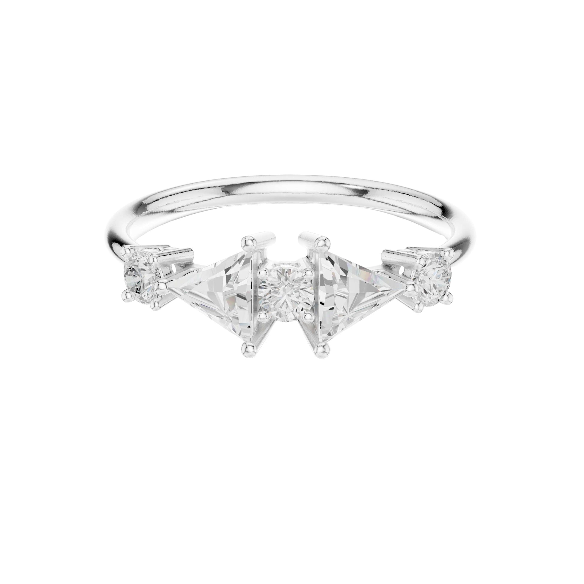 This stunning gold ring features a dazzling central round brilliant diamond flanked by two striking triangle cut diamonds on each side, creating a harmonious geometric balance. The delicate band enhances the eye-catching trio of stones, highlighting the unique blend of classic round brilliance and modern triangular facets. Ideal for those seeking a sophisticated and contemporary statement piece, this ring effortlessly combines elegance with bold design.