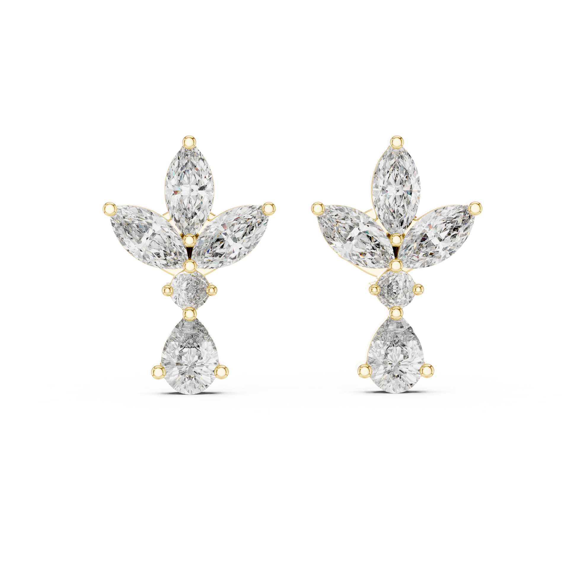 The Bloom Grace Diamond Drop Earrings are inspired by the delicate beauty of a flower in bloom. Designed with marquise-cut diamonds arranged as petals, each earring forms a radiant floral silhouette accented by a brilliant round diamond center and finished with a pear-cut diamond drop that adds movement and elegance.Crafted in high, the refined prong settings enhance brilliance while maintaining a lightweight, airy feel. Perfect for bridal wear, romantic evenings, and special celebrations, these earrings embody a balance of nature-inspired artistry and fine jewelry craftsmanship.
