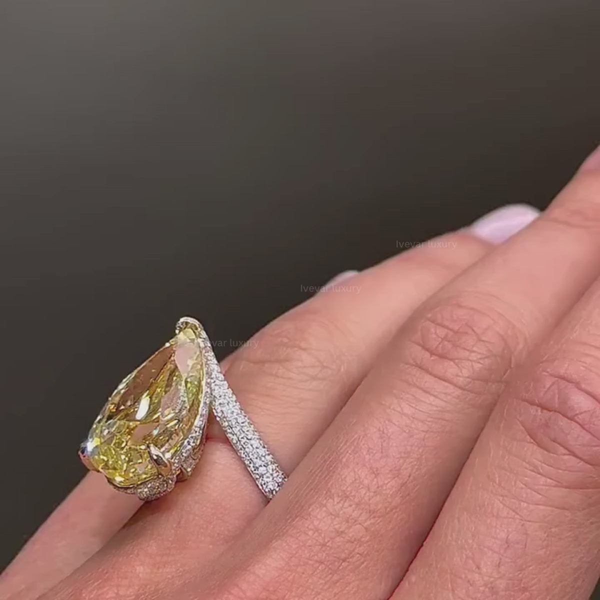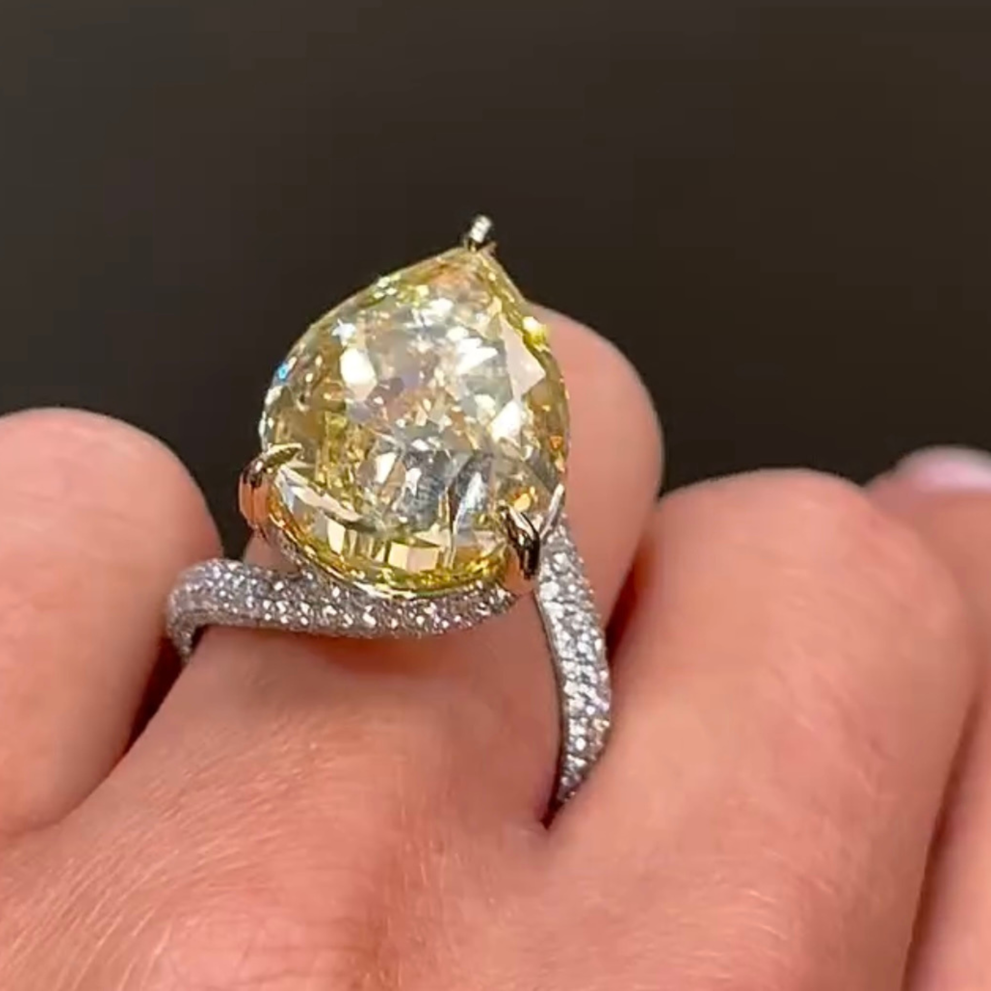 Commanding attention with effortless grace, Aurora Pear showcases a magnificent pear-cut diamond, glowing with warm golden fire and natural depth. Set in refined prongs Set and paired with a shimmering diamond pavé band, the design balances bold presence with exquisite detail.The elongated pear shape enhances the stone’s brilliance while creating a flattering, elegant silhouette on the hand. Each facet reflects light like captured sunlight, making this ring a powerful symbol of confidence, commitment, and individuality.