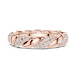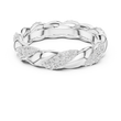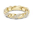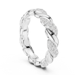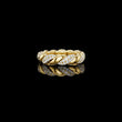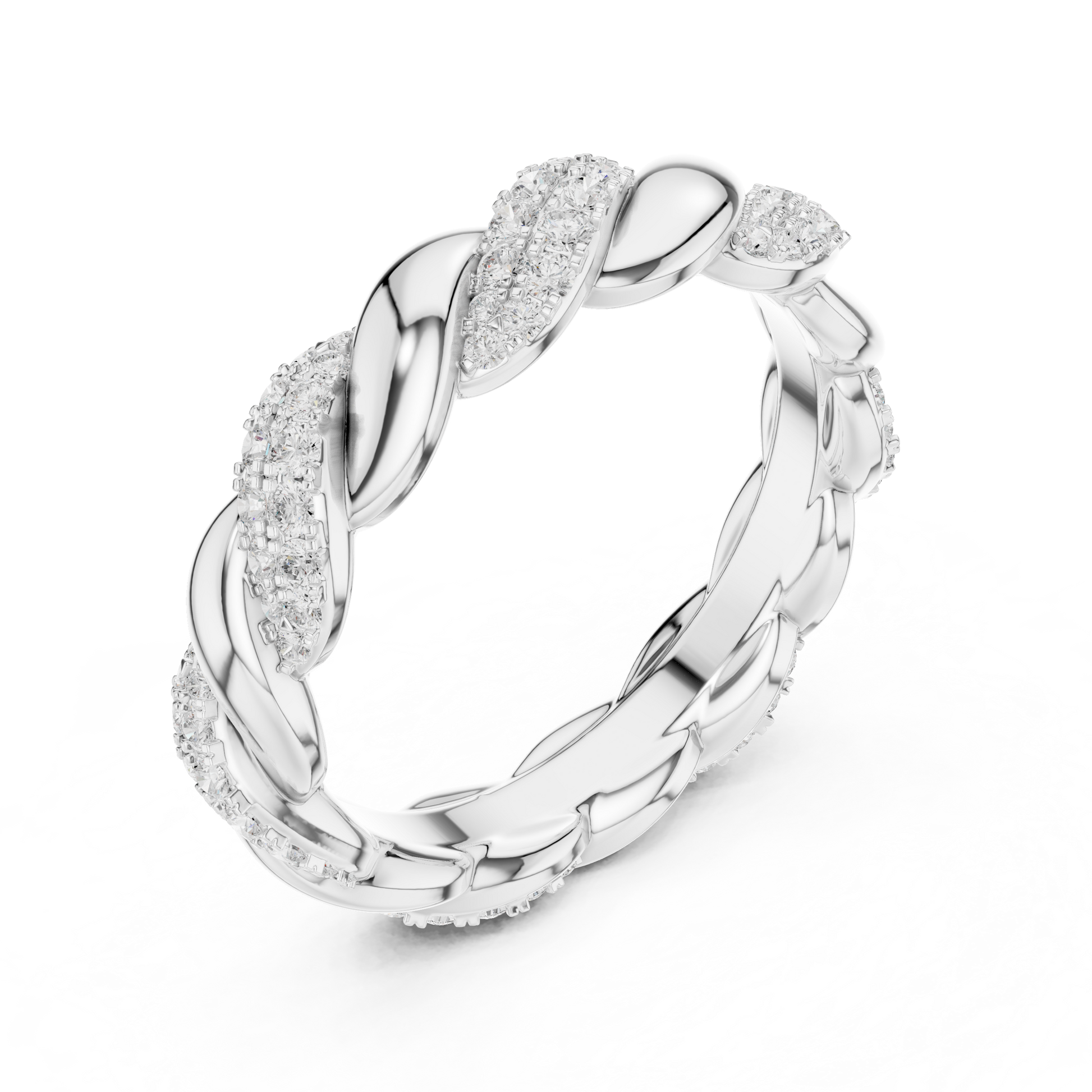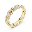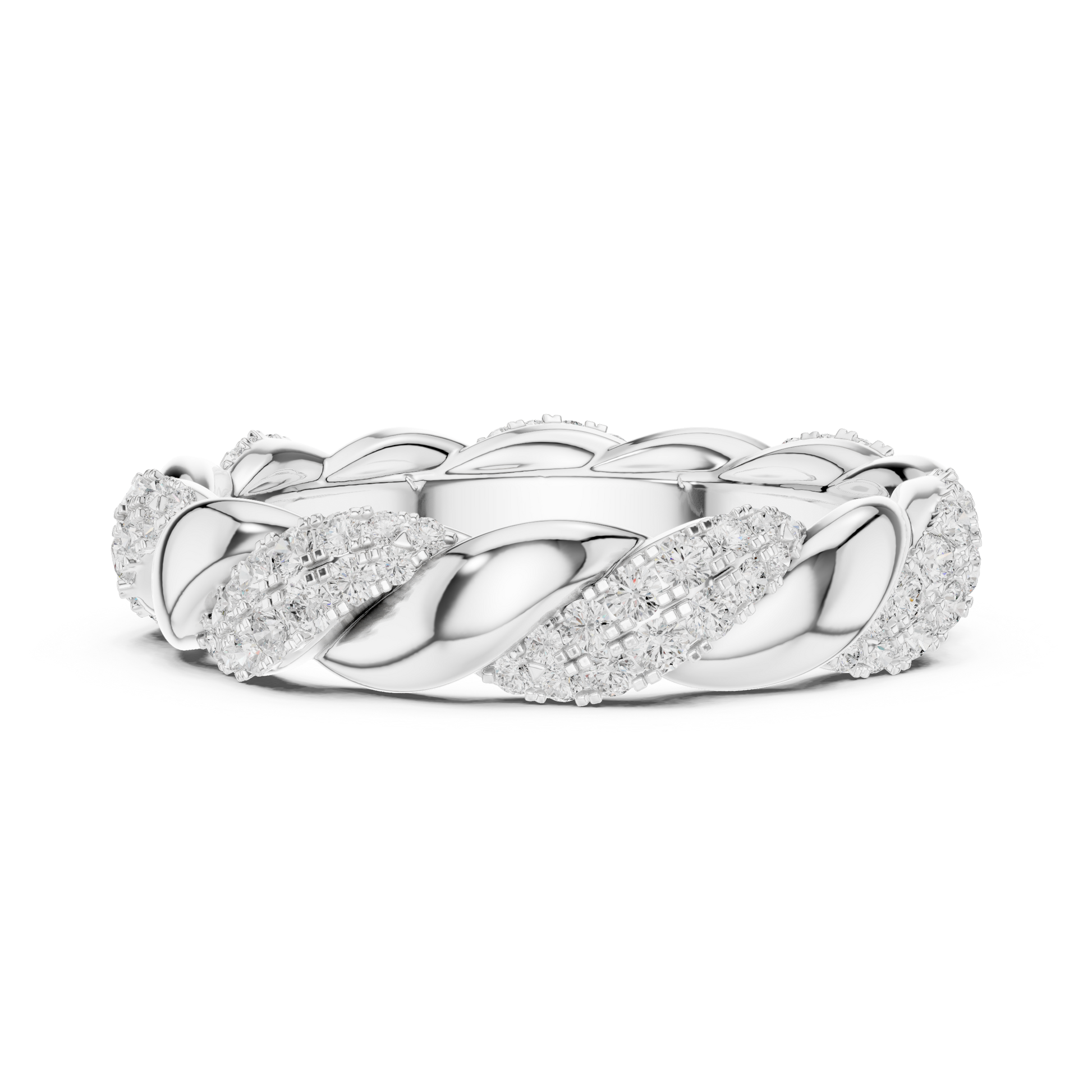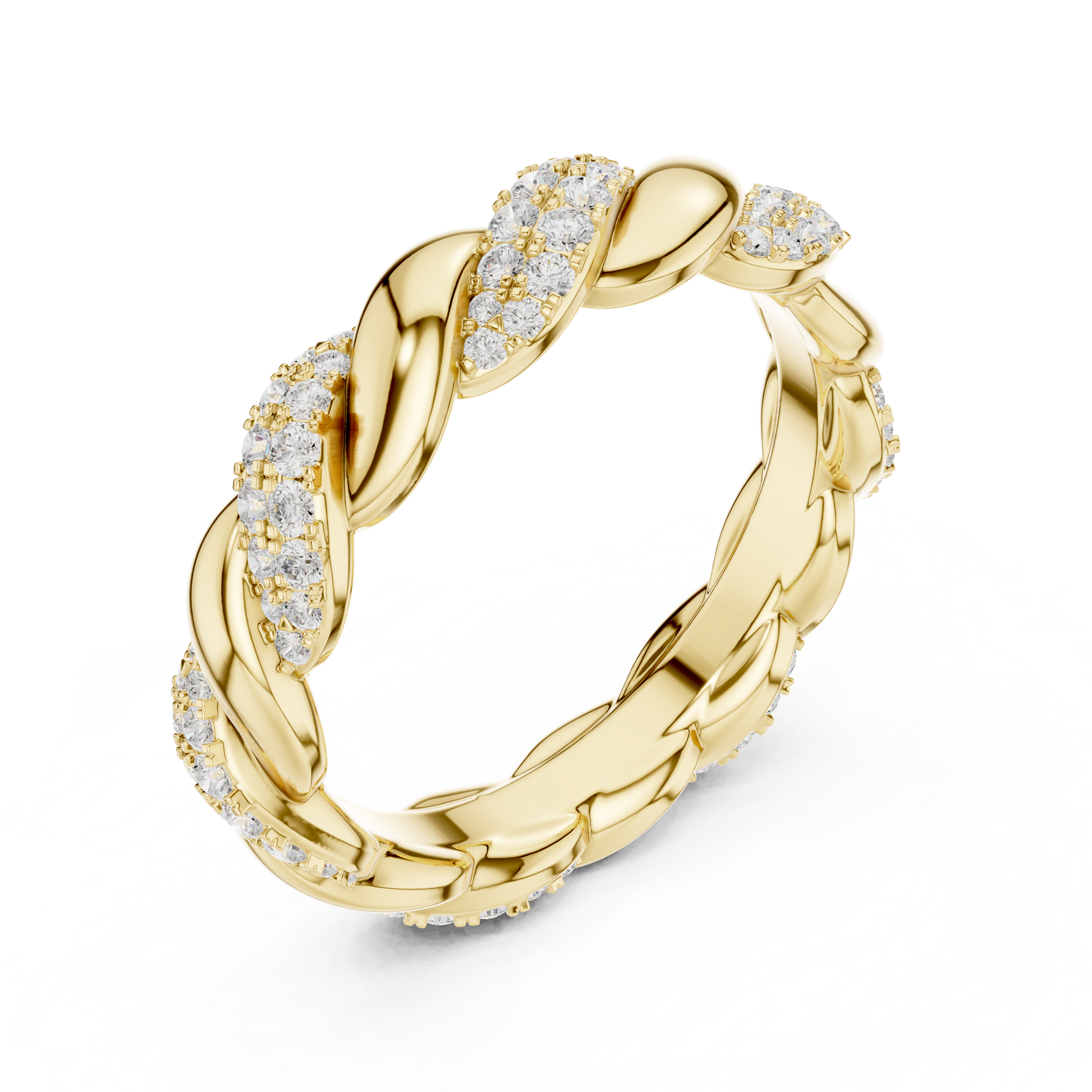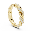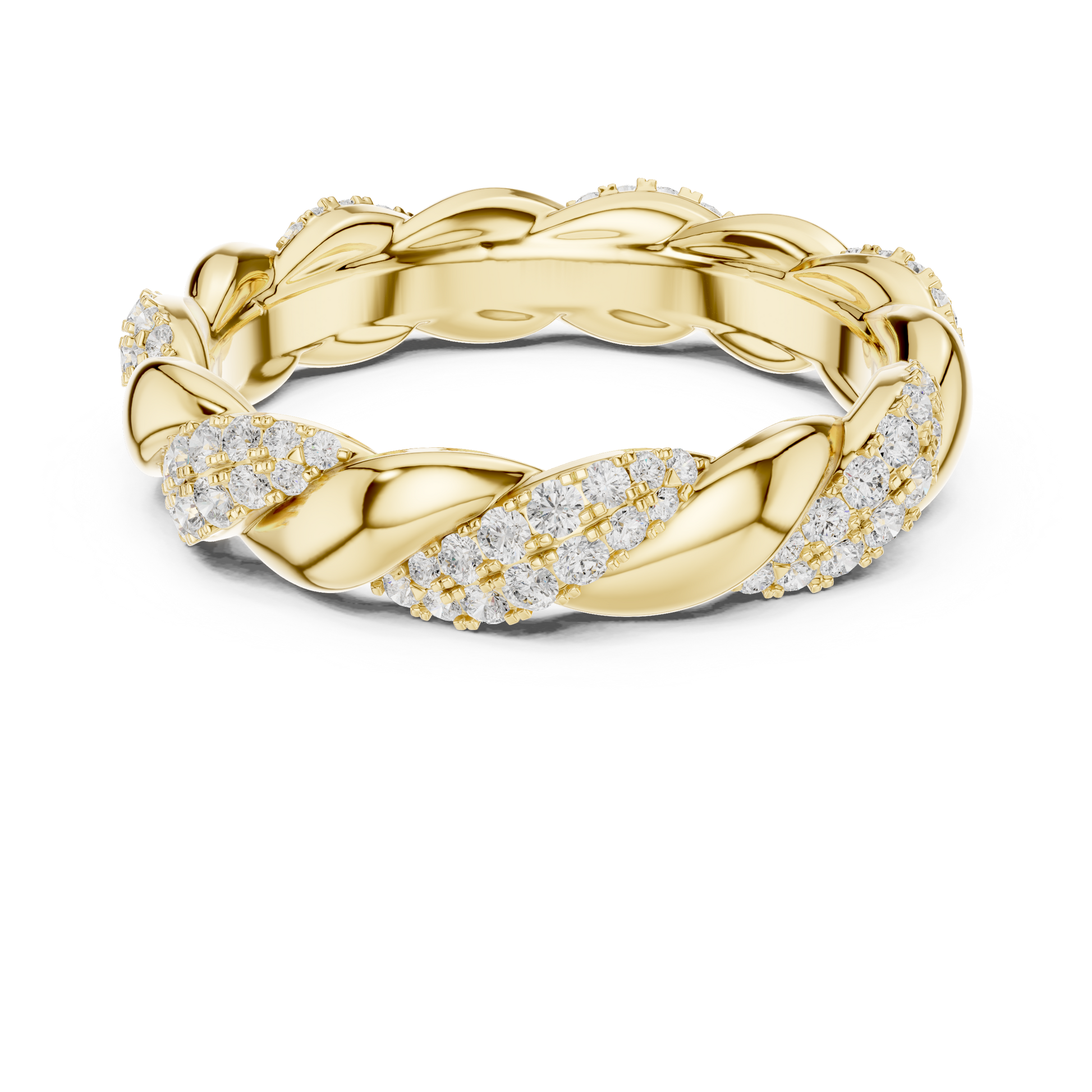 This refined gold diamond band showcases an intricate twisted design where polished gold links weave seamlessly with rows of pave set round diamonds. The flowing, leaf-inspired pattern creates a luxurious sense of movement while delivering continuous sparkle around the band. Perfect as a wedding ring, anniversary band, or statement stackable piece, this ring blends modern craftsmanship with timeless elegance for everyday sophistication.