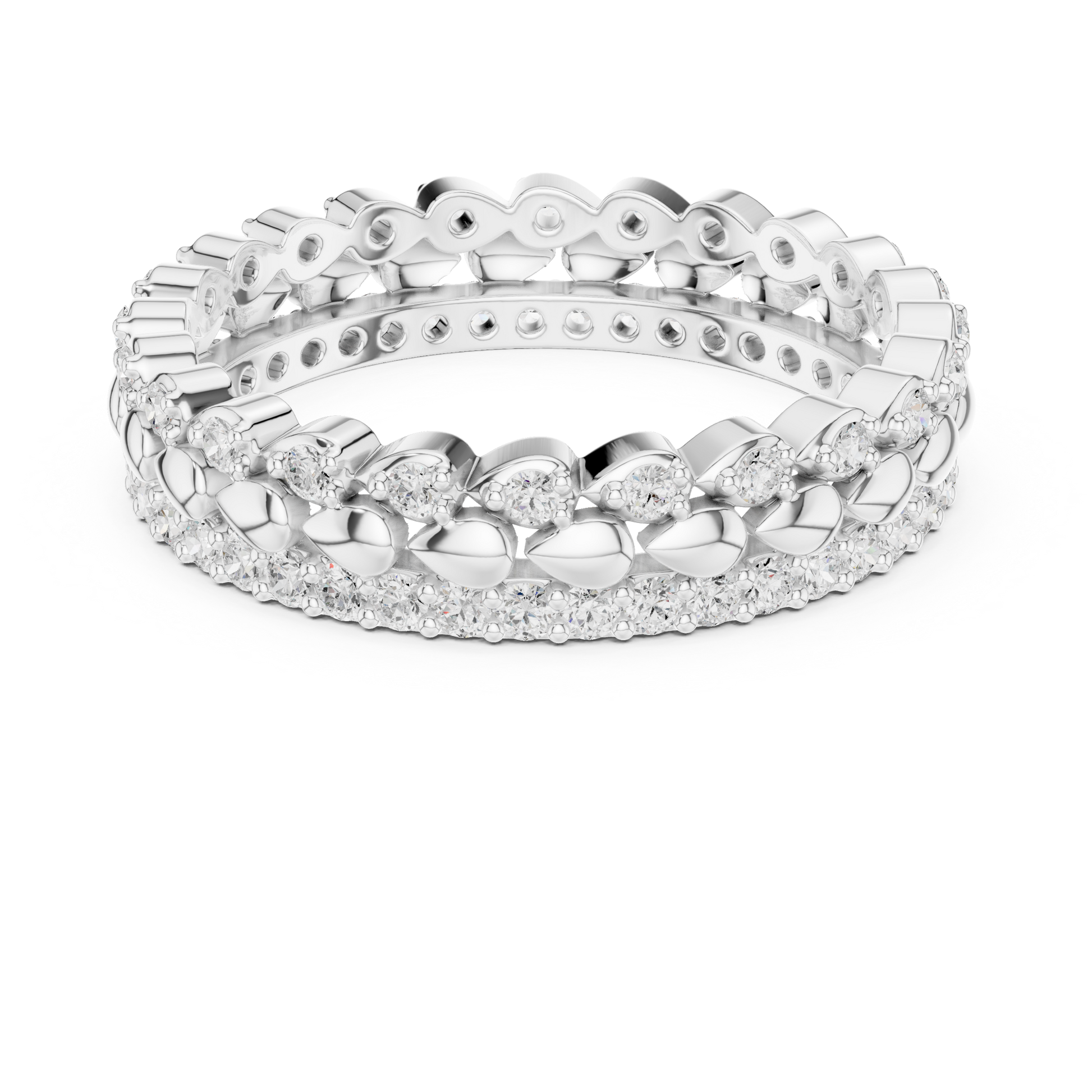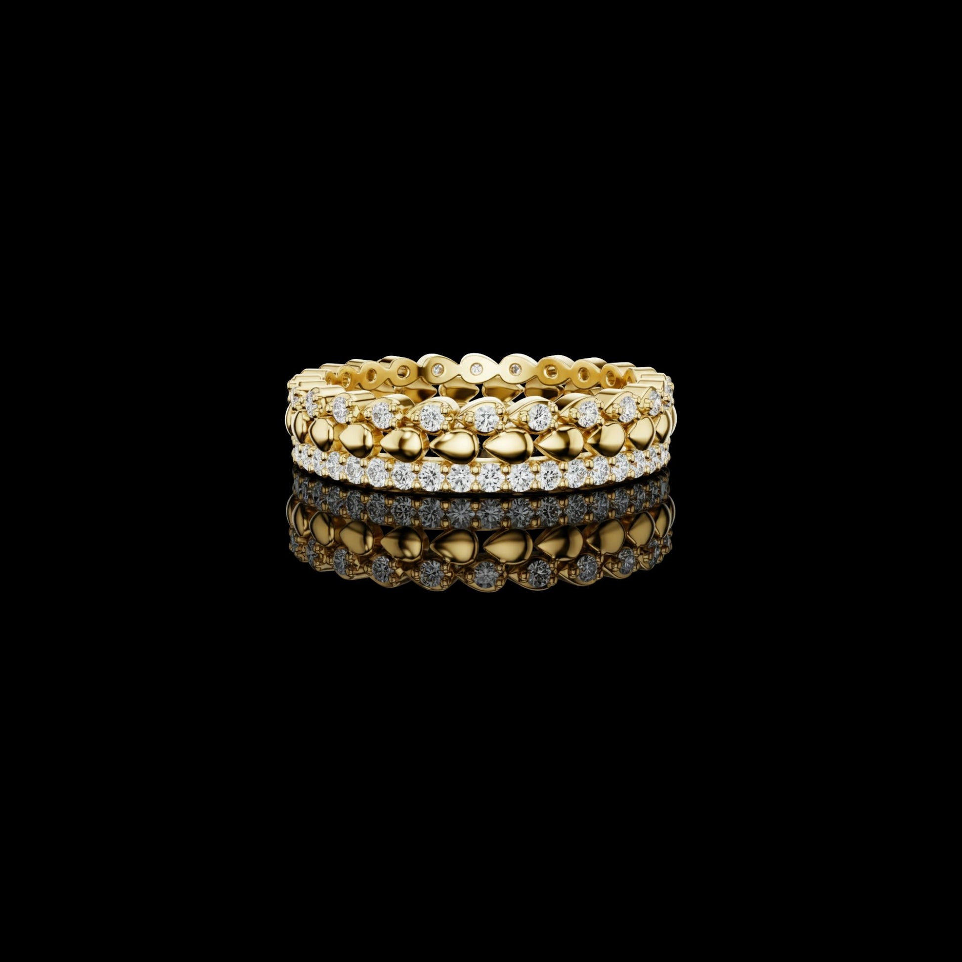 Step into timeless sophistication with the Regal Bead diamond eternity band, a striking fusion of bold gold artistry and radiant diamond brilliance. This exceptional design features a continuous row of high-polish gold bead elements, symbolizing strength and harmony, perfectly complemented by a pavé-set diamond border that delivers unmatched sparkle and refinement.