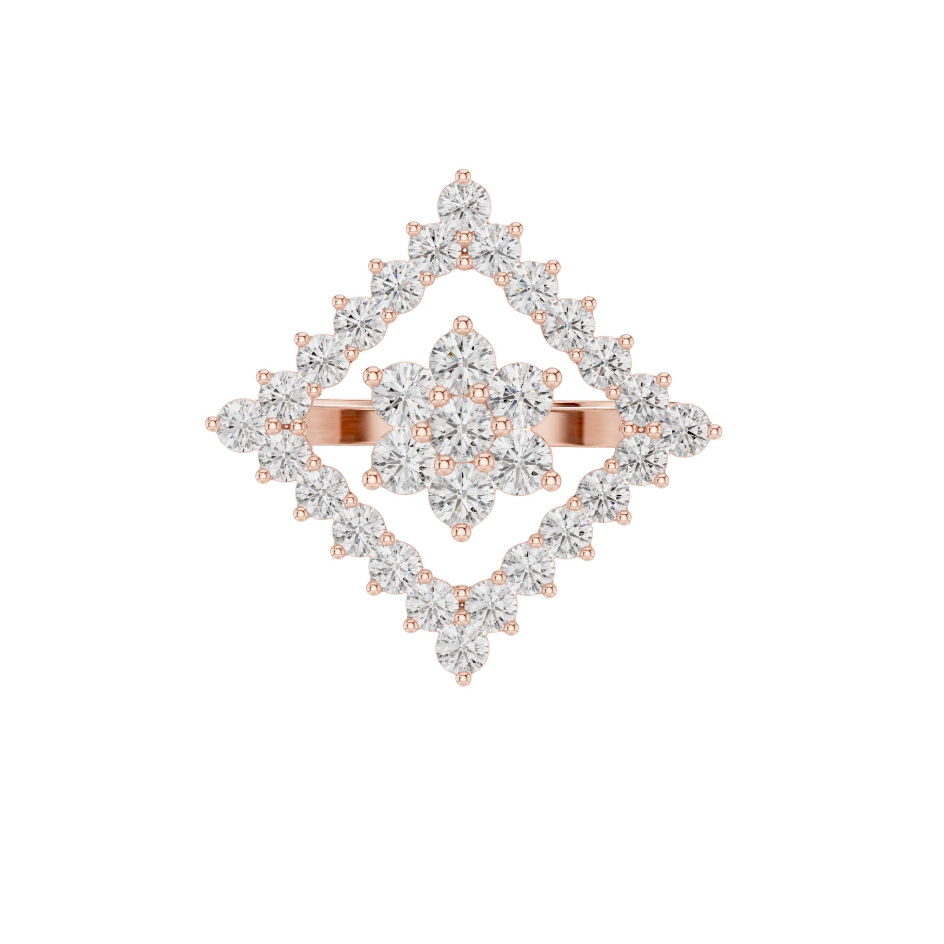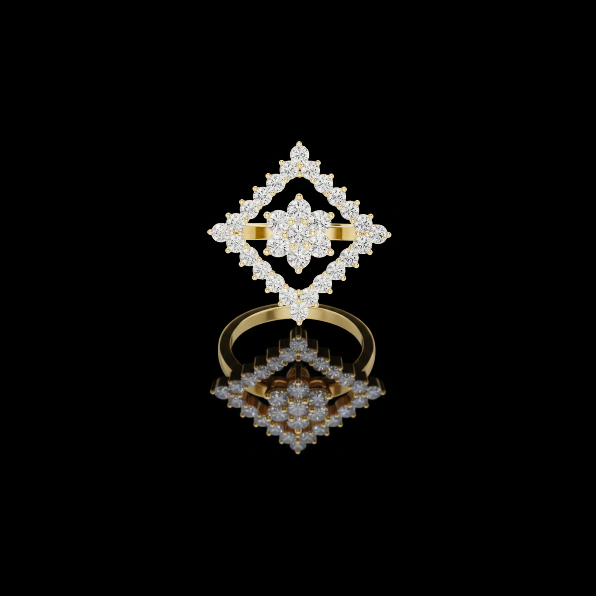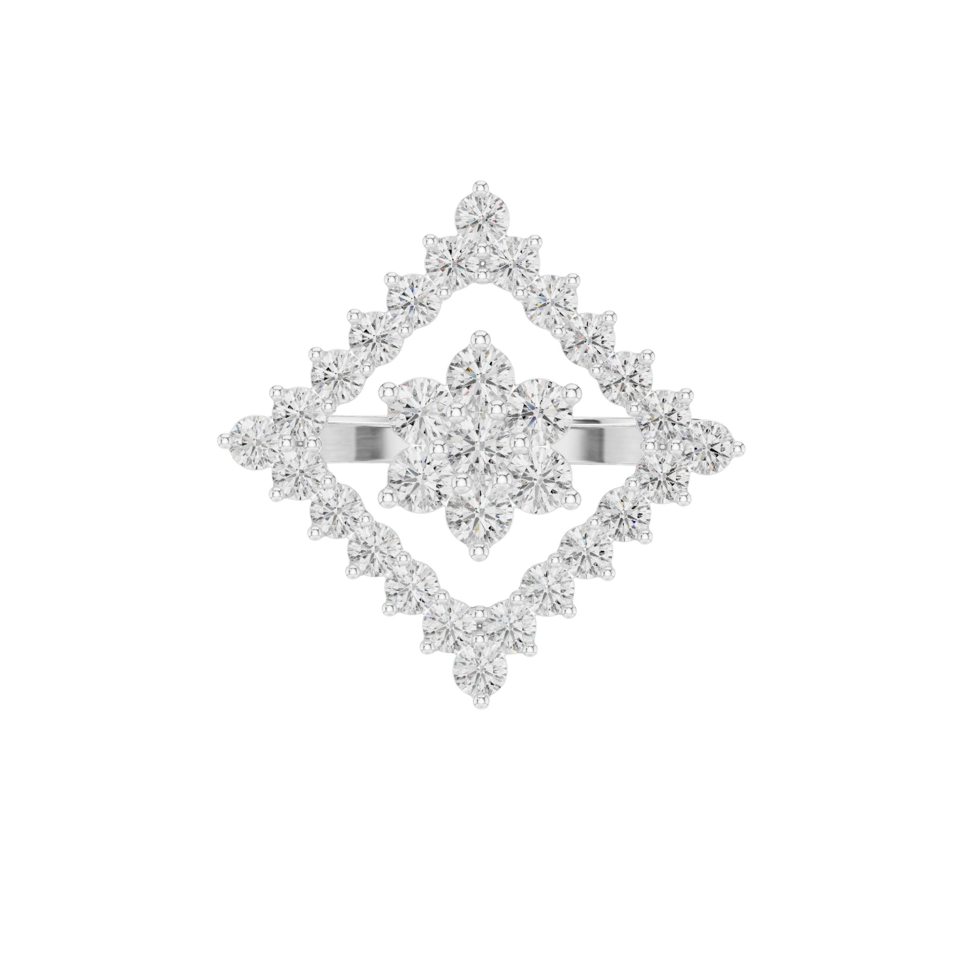 This captivating gold ring features a bold geometric design centered around a radiant diamond cluster framed by an open diamond-shaped halo. Brilliant round-cut diamonds are meticulously set to create layered sparkle and striking symmetry, while the openwork silhouette adds depth and a modern edge. Elegant yet distinctive, this ring blends contemporary design with timeless brilliance, making it a standout statement piece for special occasions or elevated everyday wear.