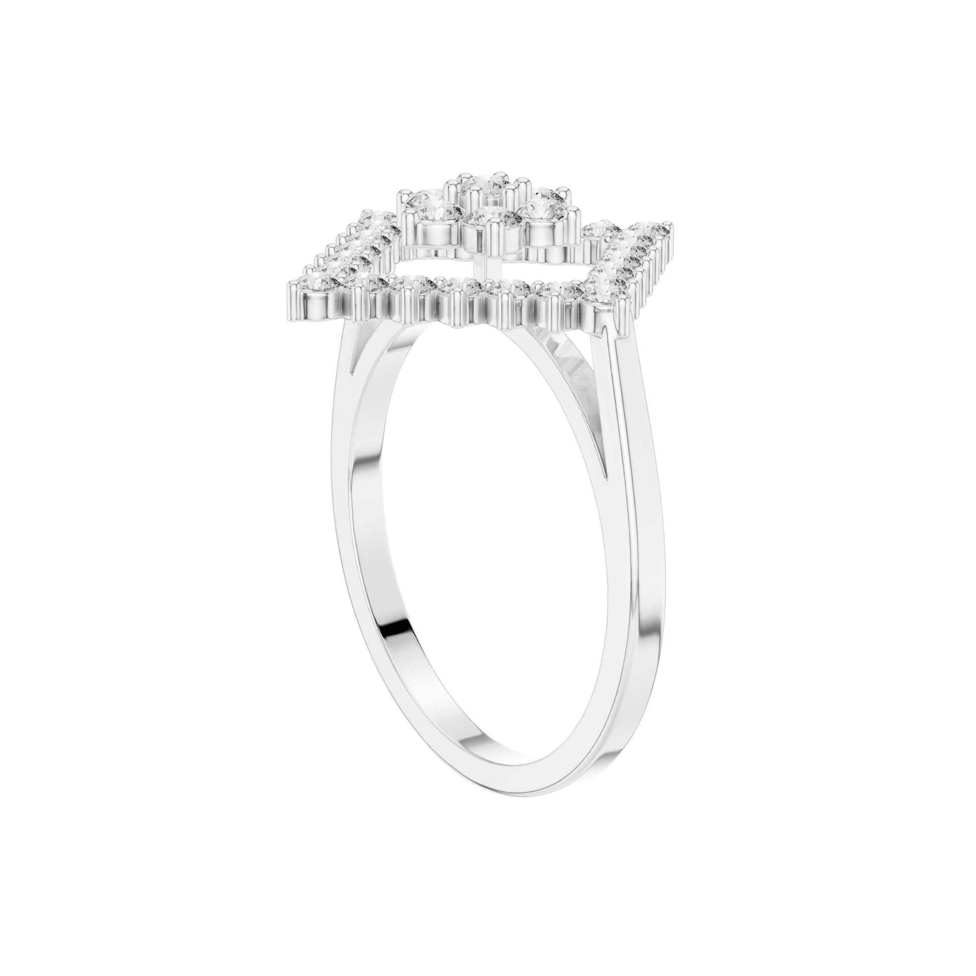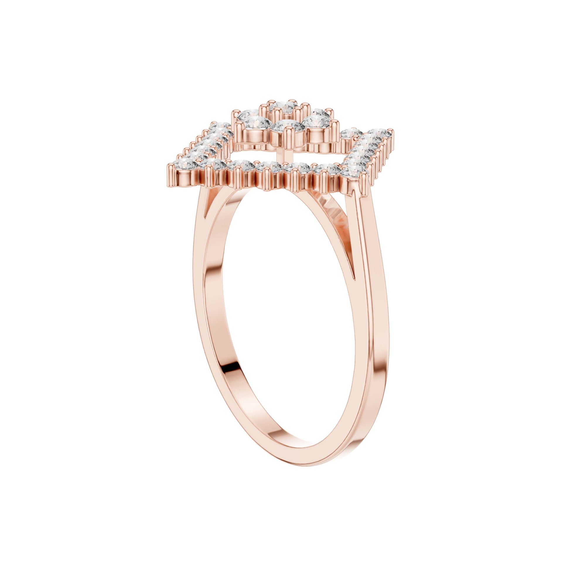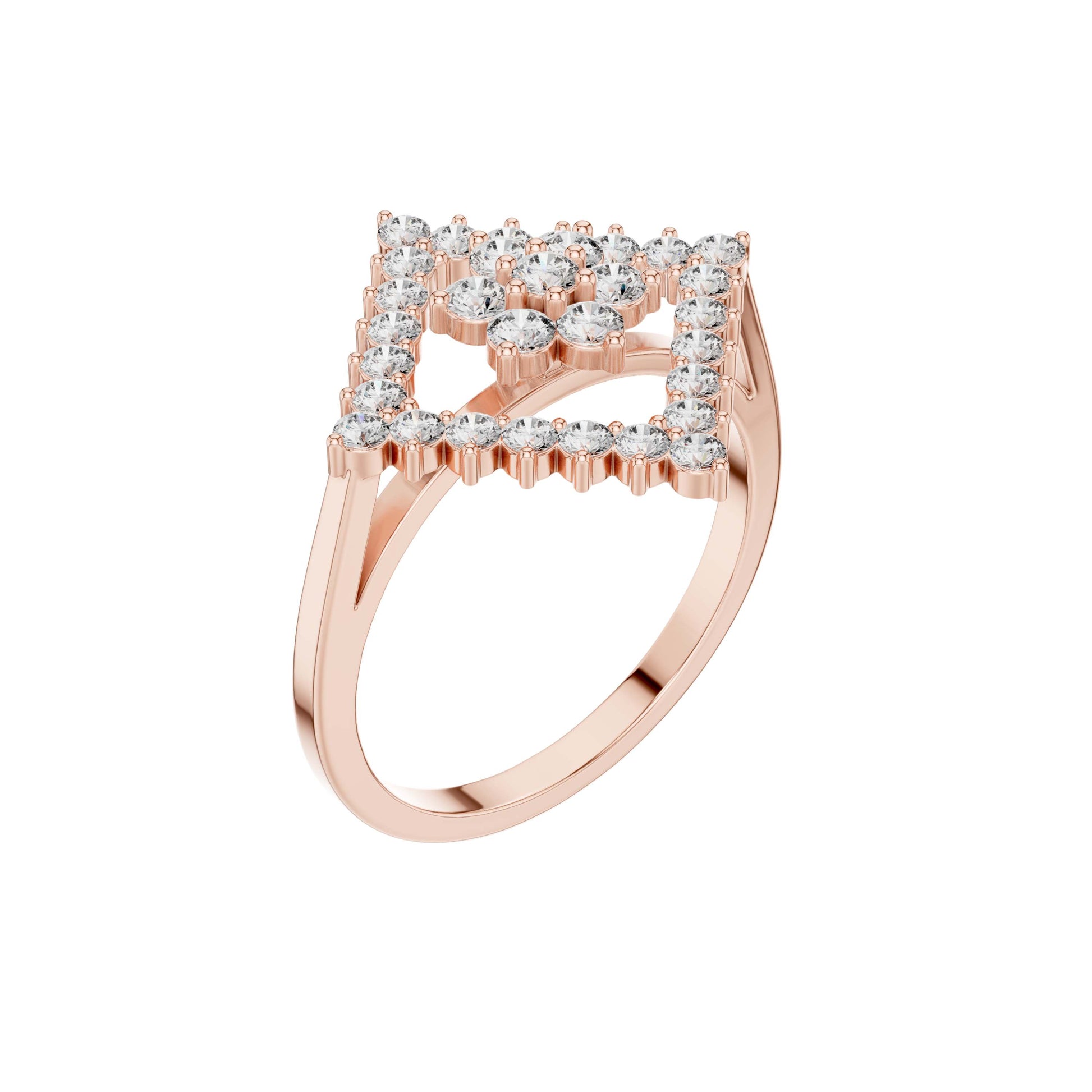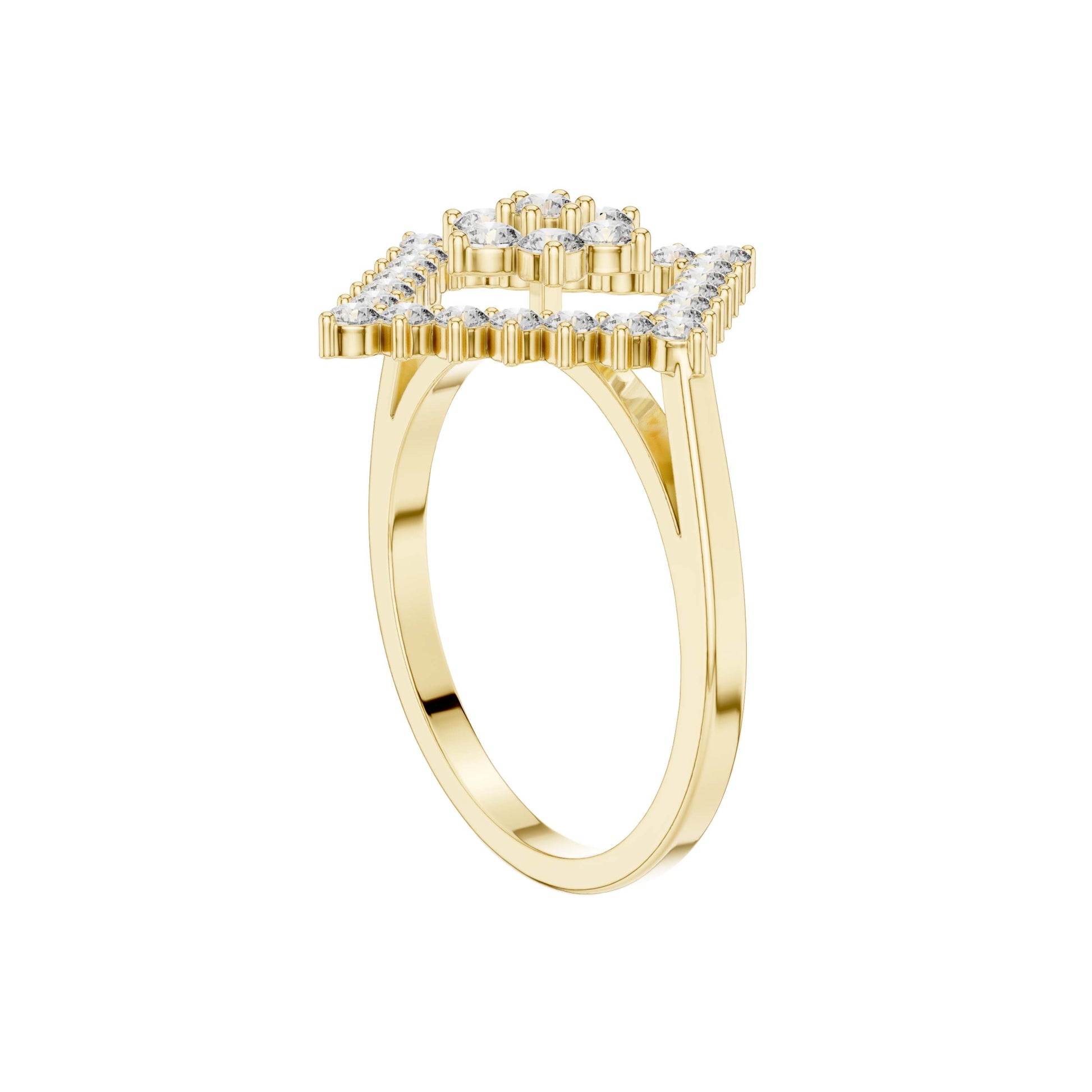 This captivating gold ring features a bold geometric design centered around a radiant diamond cluster framed by an open diamond-shaped halo. Brilliant round-cut diamonds are meticulously set to create layered sparkle and striking symmetry, while the openwork silhouette adds depth and a modern edge. Elegant yet distinctive, this ring blends contemporary design with timeless brilliance, making it a standout statement piece for special occasions or elevated everyday wear.