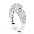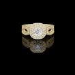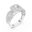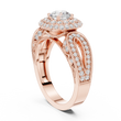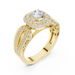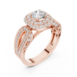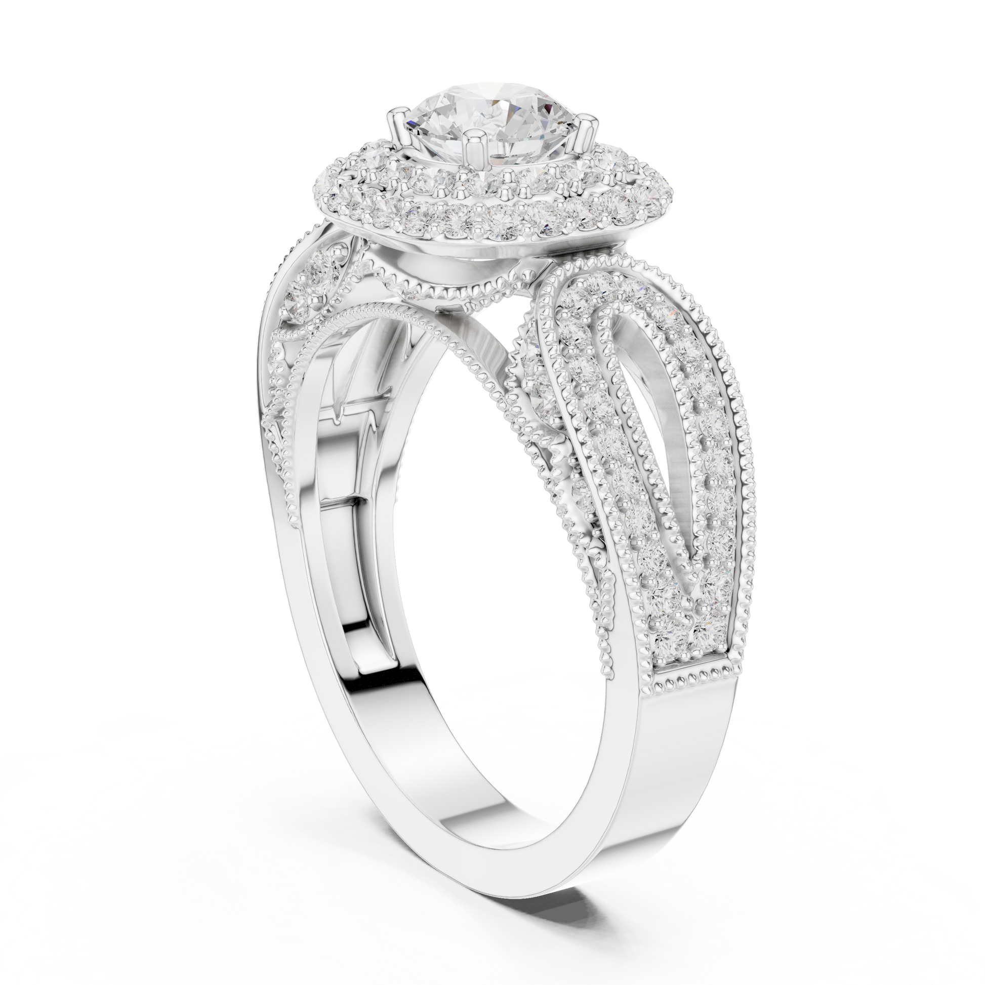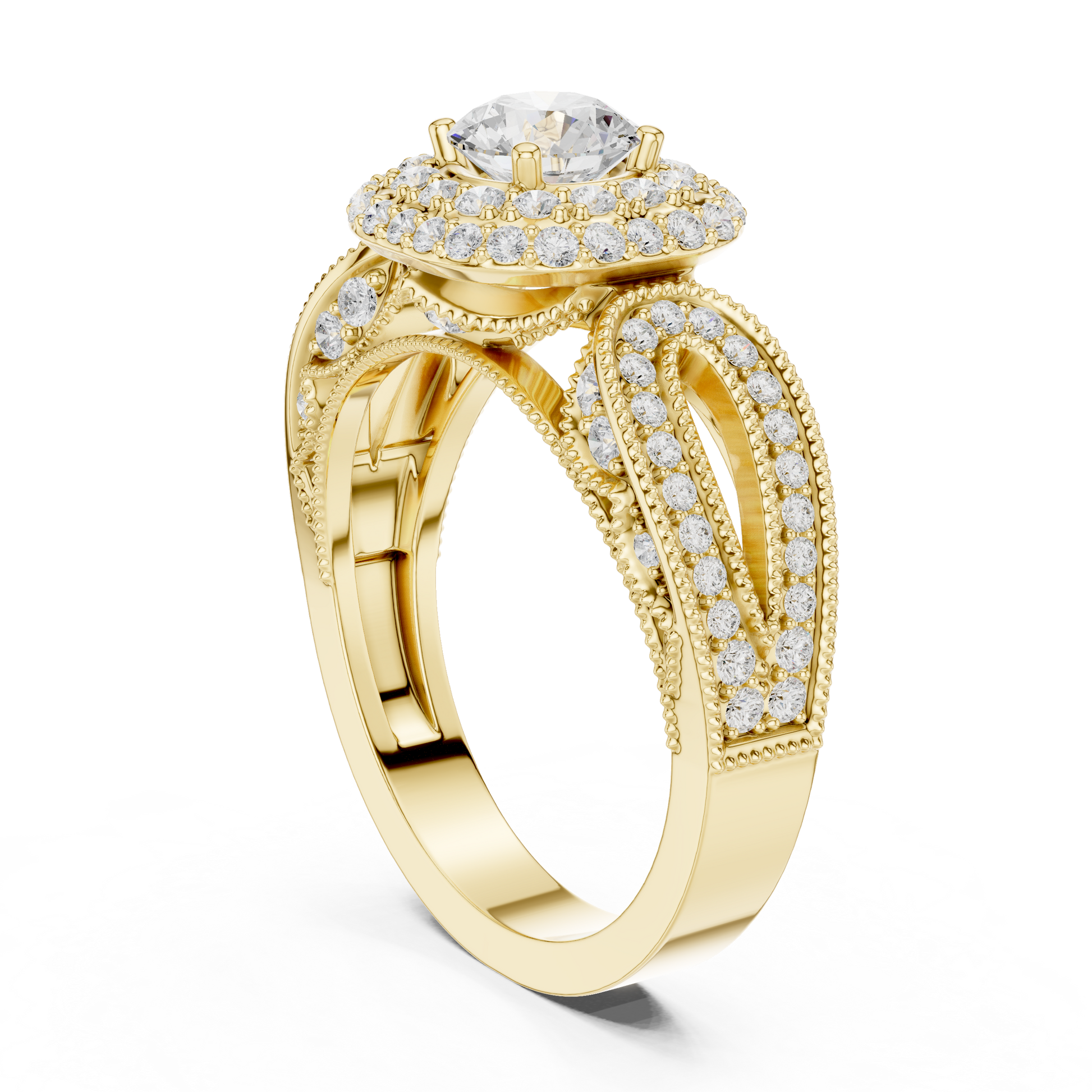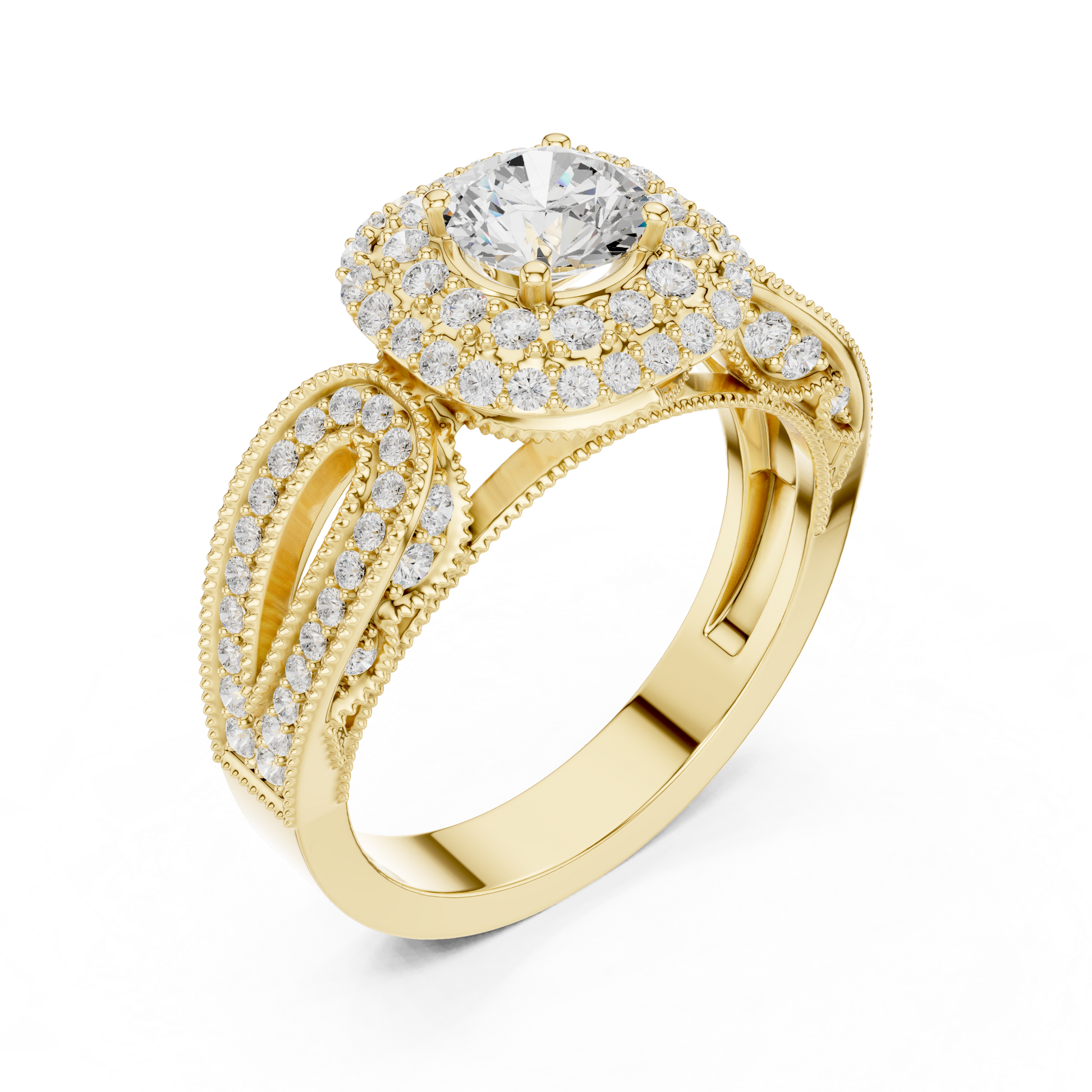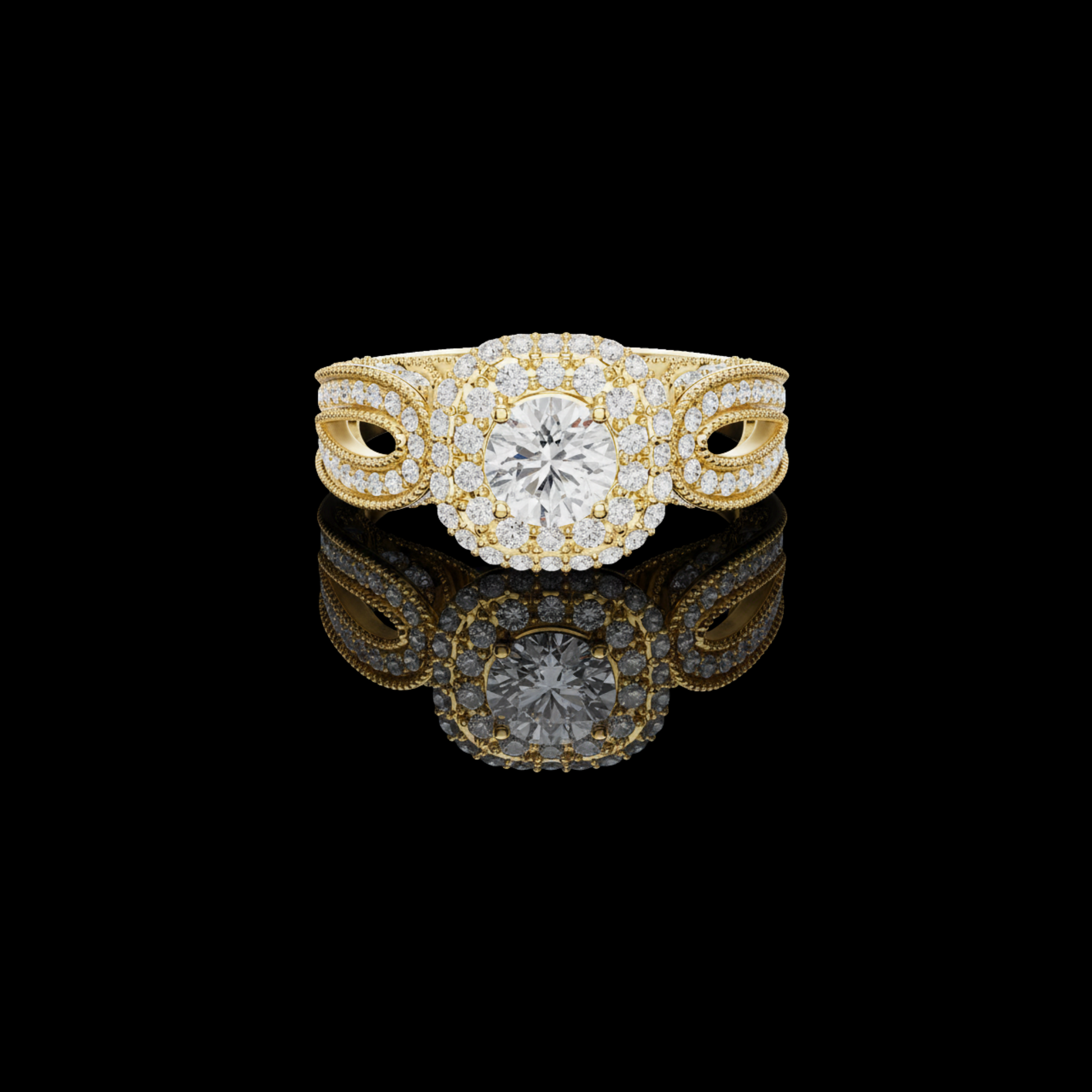 This breathtaking ring features a brilliant round-cut center diamond encircled by a luminous double halo of pavé-set diamonds, amplifying its sparkle from every angle. Crafted in rich, the band showcases an intricate open-shank design adorned with micro-pavé diamonds, adding depth, elegance, and vintage-inspired charm.Perfect for those who appreciate artistry and radiance, this piece blends timeless luxury with meticulous craftsmanship, making it an unforgettable symbol of love, celebration, or personal style.