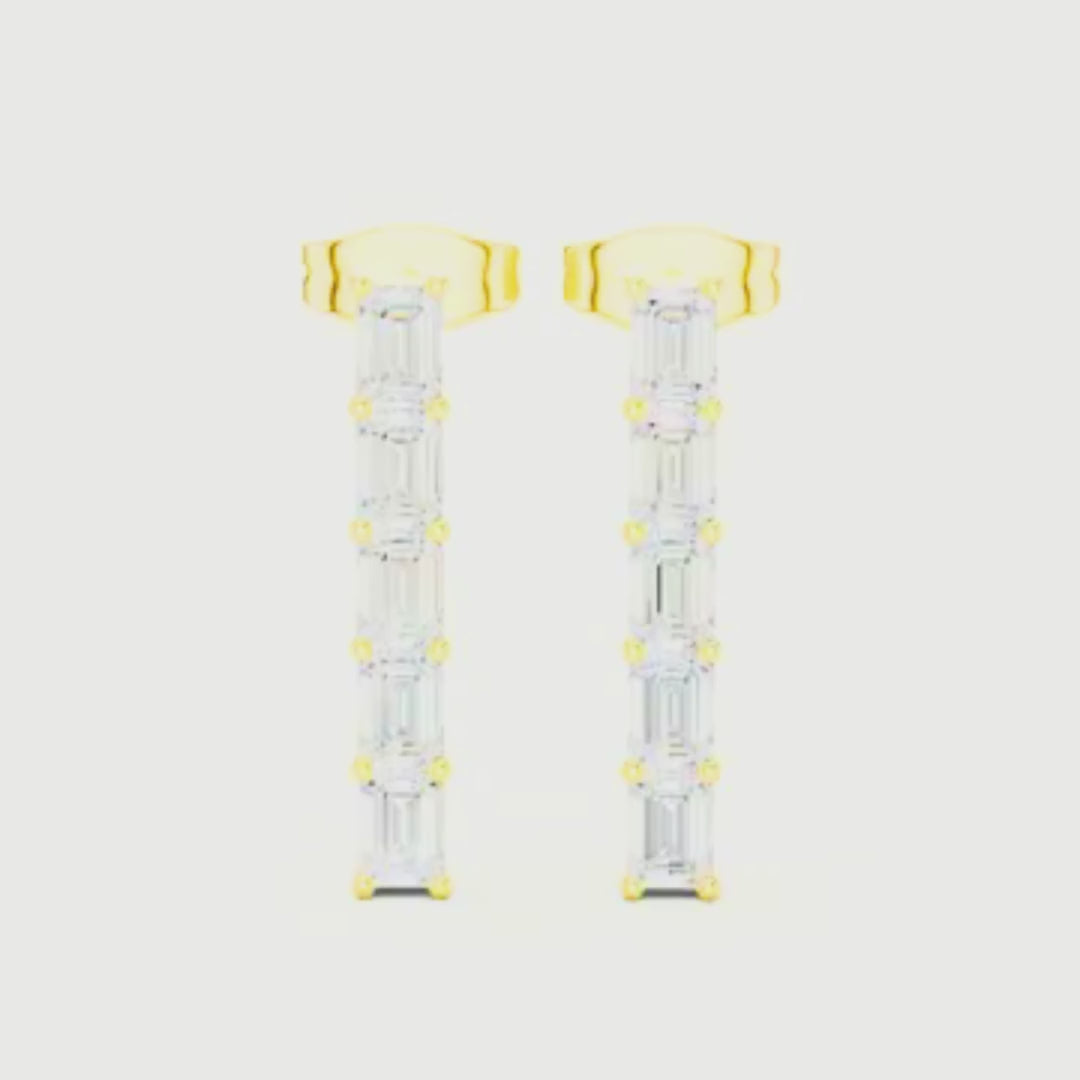 Refined and striking, these luxury emerald-cut diamond vertical bar earrings are crafted in premium gold for a clean, contemporary look. Featuring a seamless line of emerald-cut diamonds, the design highlights sharp geometry, exceptional clarity, and mirror-like brilliance. Designed for women who value structured design, timeless luxury, and modern fine jewelry, this piece delivers understated glamour.