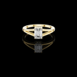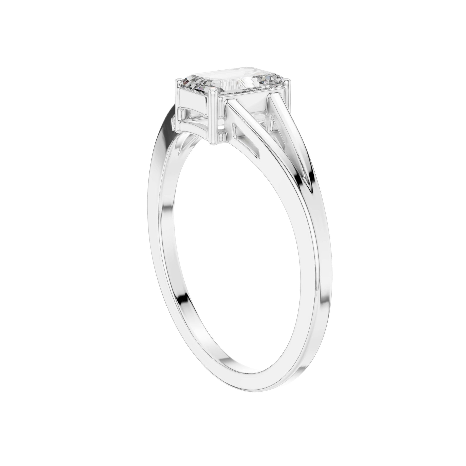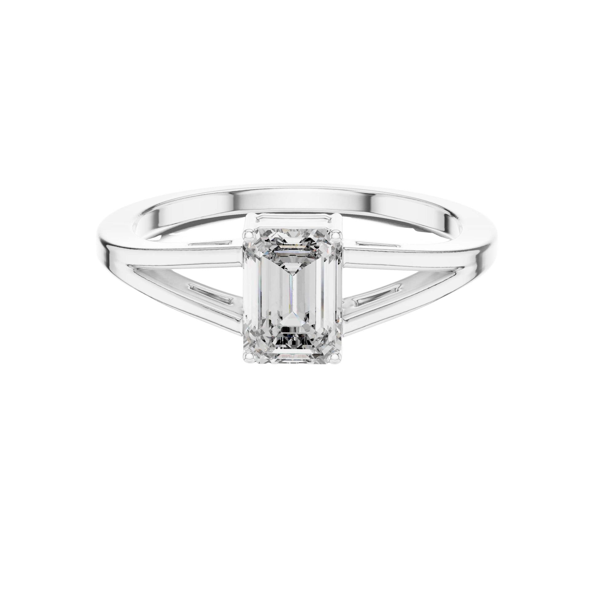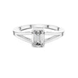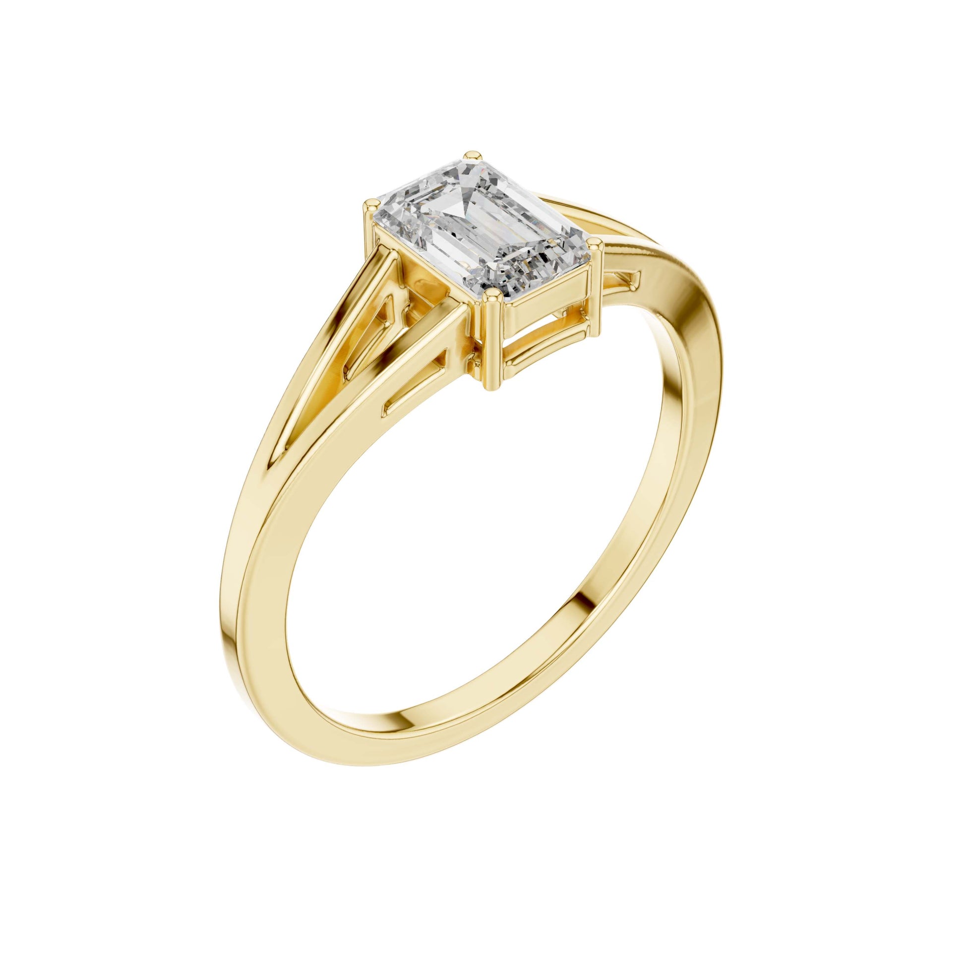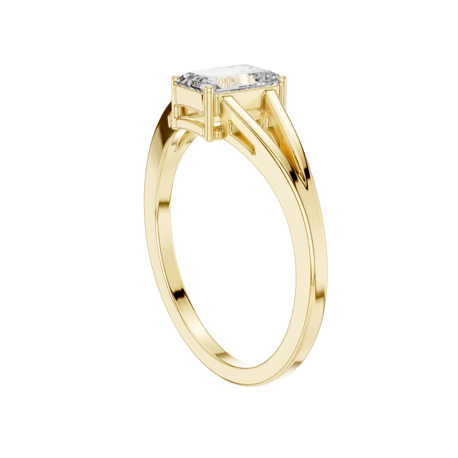 This refined ring showcases a striking emerald-cut center stone set in polished gold, emphasizing clean lines and timeless brilliance. The modern split shank gracefully tapers toward the center, adding architectural interest while enhancing light and presence on the finger. Minimalist prongs secure the stone without distraction, creating a sophisticated balance of contemporary design and classic elegance—perfect as an engagement ring or a statement of enduring style.