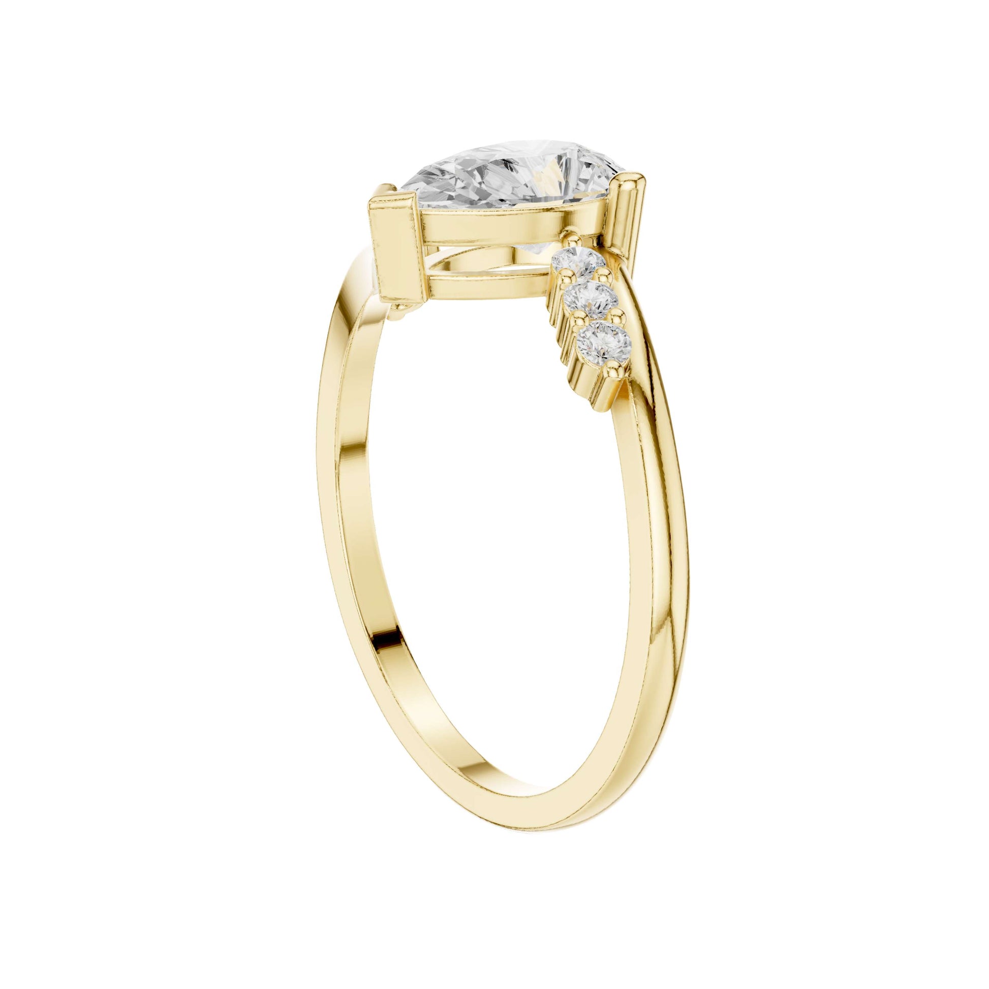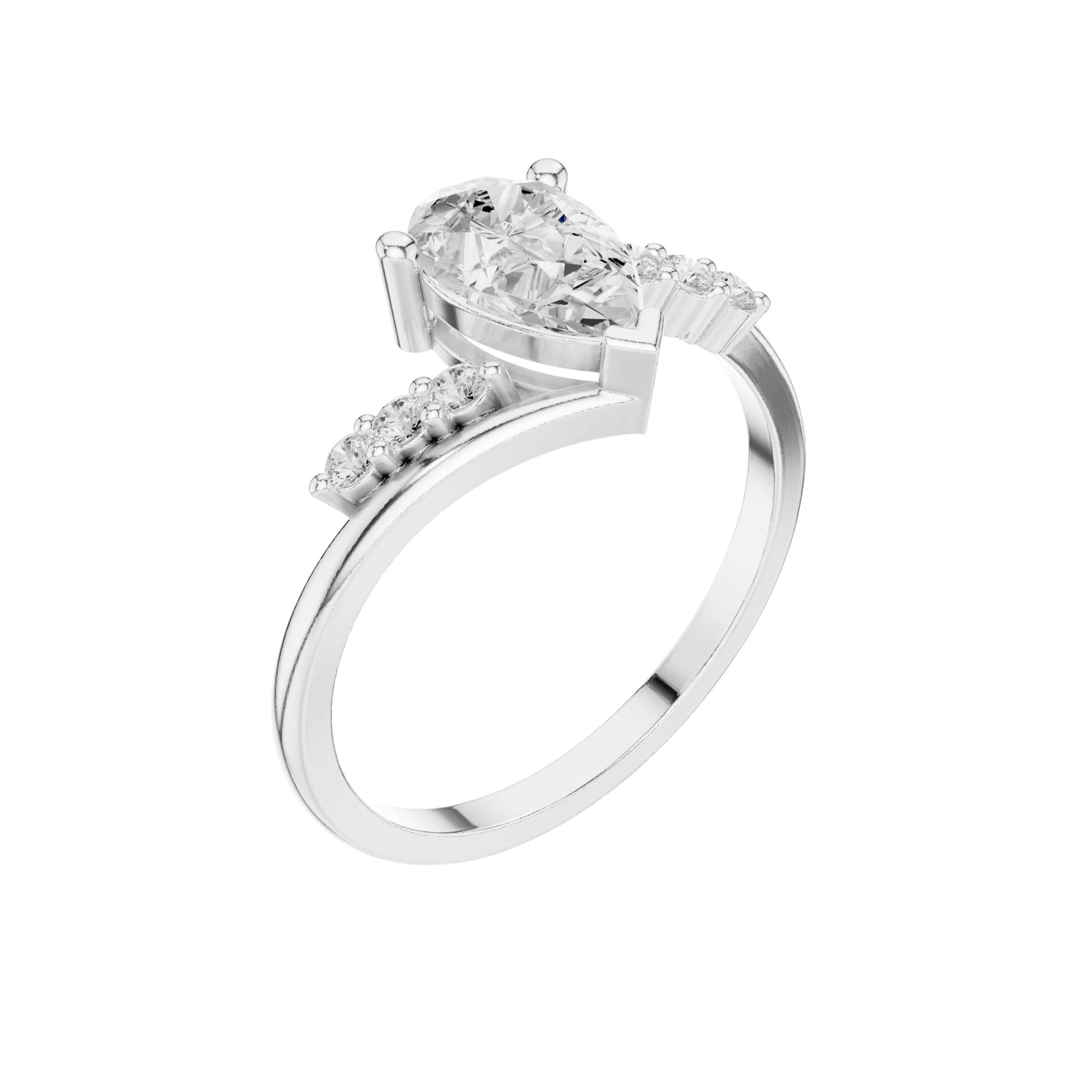 This elegant gold bypass ring showcases a stunning pear-shaped diamond as its centerpiece, gracefully framed by softly curving bands that sweep around the finger. Delicate round accent diamonds are set along each side of the split shank, adding balance, sparkle, and dimension without overpowering the center stone. The polished gold finish enhances the brilliance of the diamonds while the fluid, asymmetrical design offers a modern yet timeless appeal—perfect as a distinctive engagement ring, anniversary piece, or refined statement of everyday luxury by Ivevar.