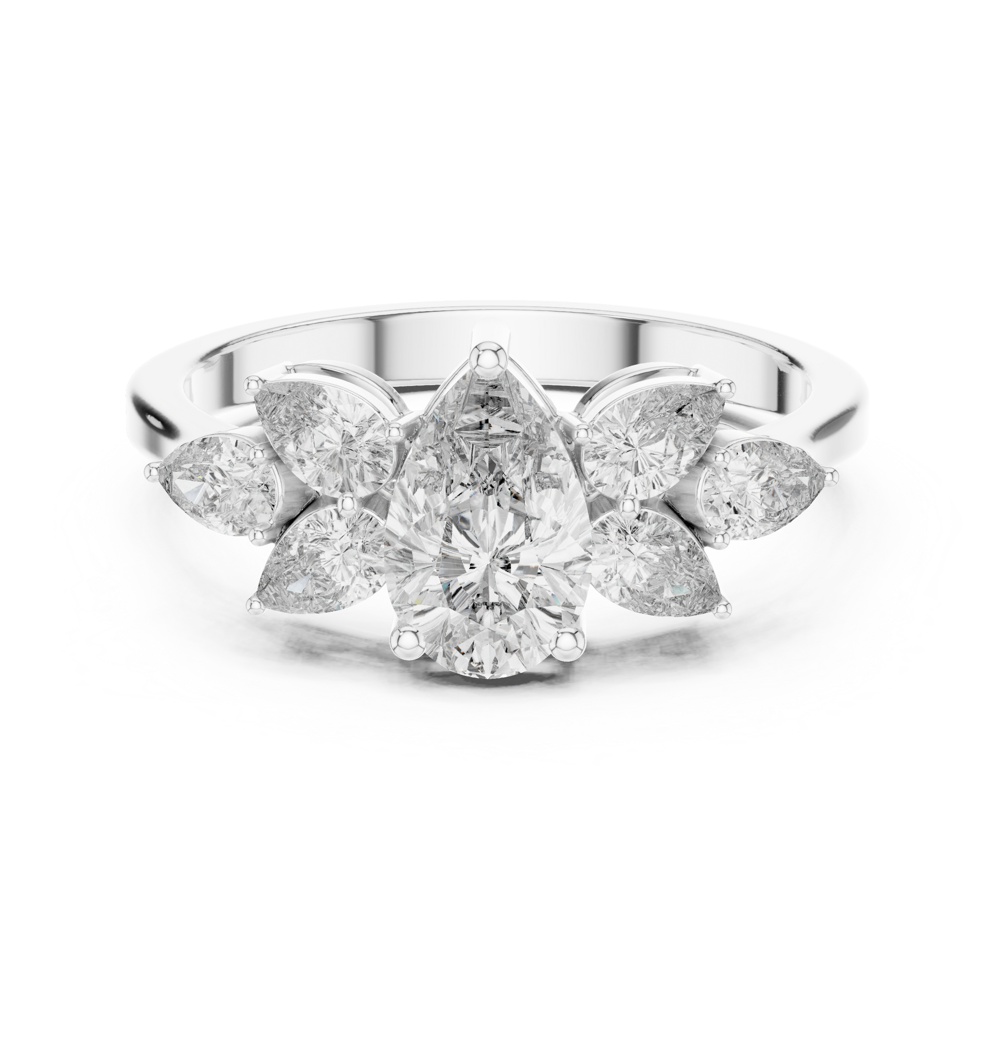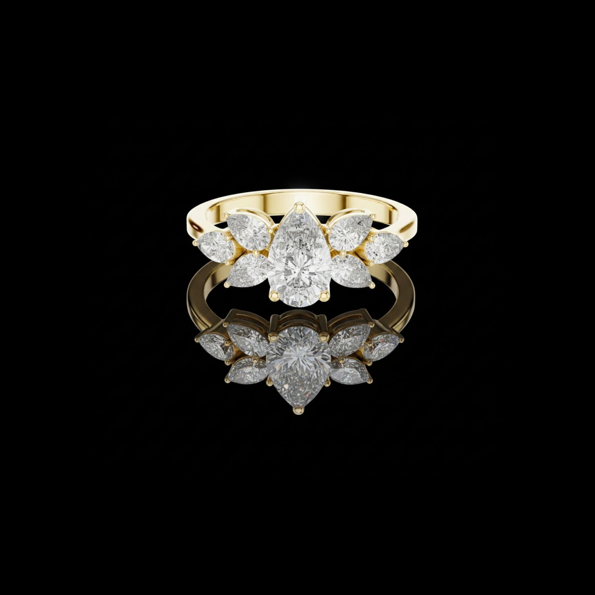 This exquisite diamond ring features a brilliant pear-shaped center stone, gracefully framed by marquise-cut diamonds arranged like delicate petals. Crafted in radiant gold, the design blends floral elegance with modern luxury, creating a breathtaking statement piece. Perfect for engagements, anniversaries, or special celebrations, this ring reflects timeless beauty, refined craftsmanship, and unforgettable sparkle from every angle.