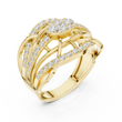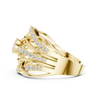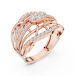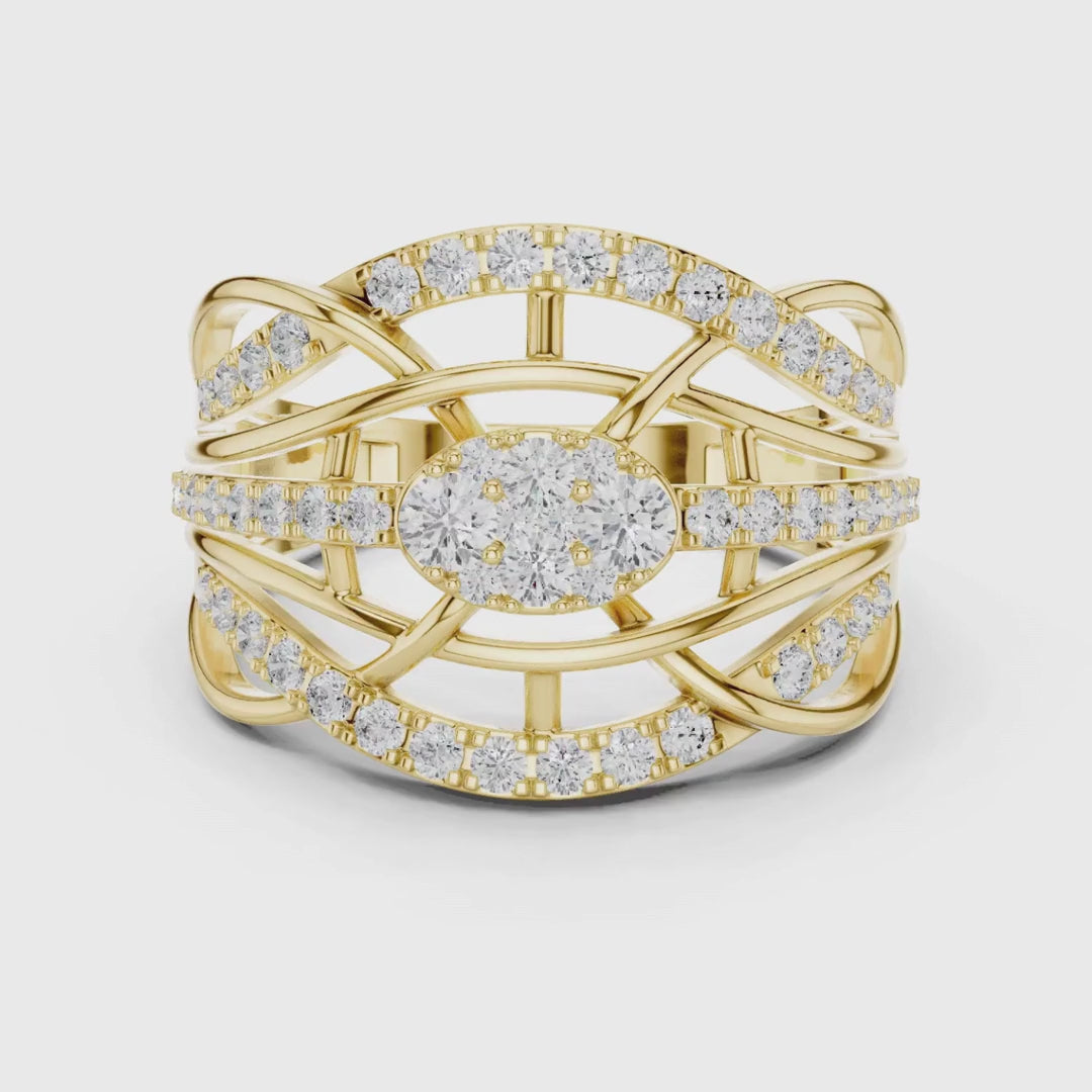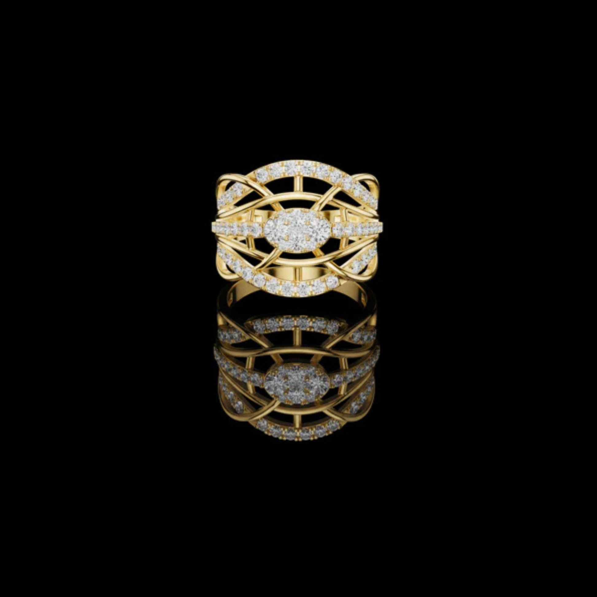 This stunning ring showcases a bold, architectural design crafted in luxurious. Its intricate multi-row woven structure gracefully intertwines around the finger, creating a striking sense of depth and movement. At the heart of the piece sits a dazzling Round-shaped diamond cluster, radiating brilliance from every angle. The surrounding pavé-set diamonds enhance the sparkle, tracing each curve with exceptional elegance. Perfect for those who adore statement jewelry, this ring blends modern artistry with timeless luxury, making it an unforgettable addition to any collection.