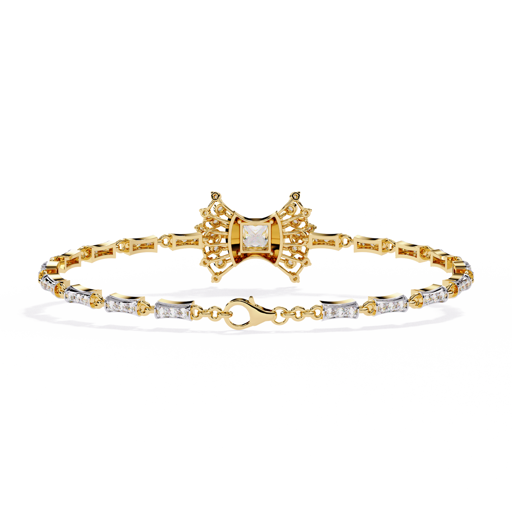This stunning bracelet embodies regal elegance and timeless beauty, featuring a mesmerizing princess-cut solitaire diamond at its center, gracefully set in radiant gold. Surrounding the centerpiece are clusters of brilliant round diamonds that enhance its brilliance and create a captivating play of light. The alternating gold and diamond-studded links complete the design, offering a refined balance of luxury and sophistication.