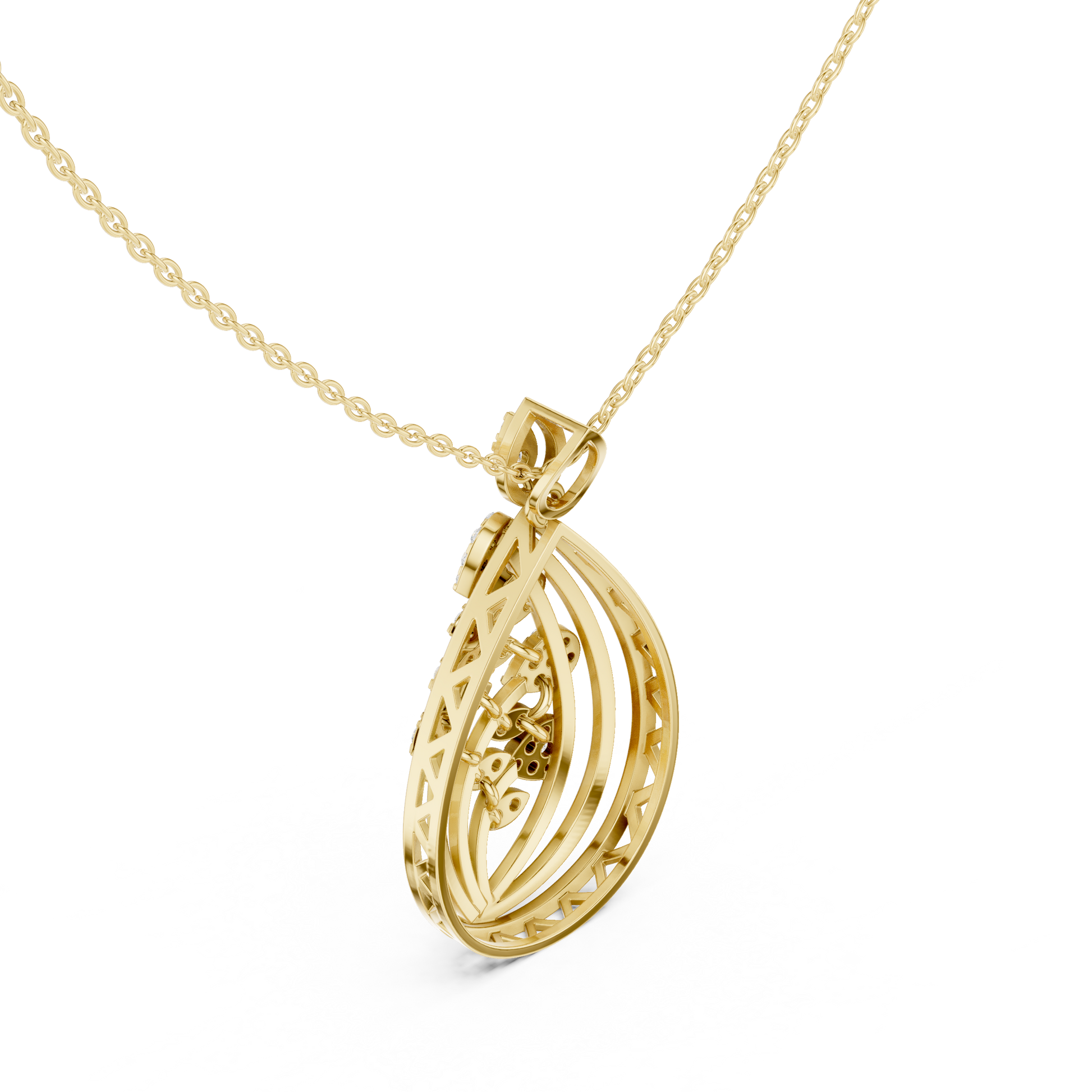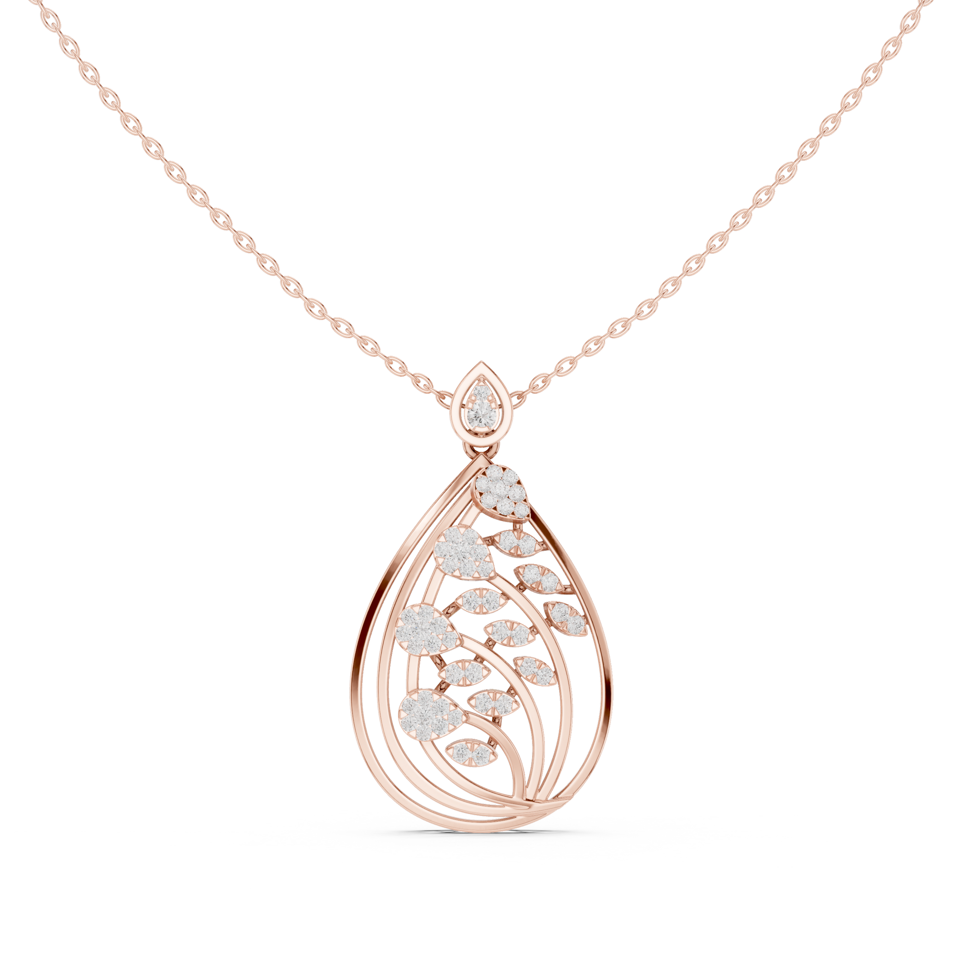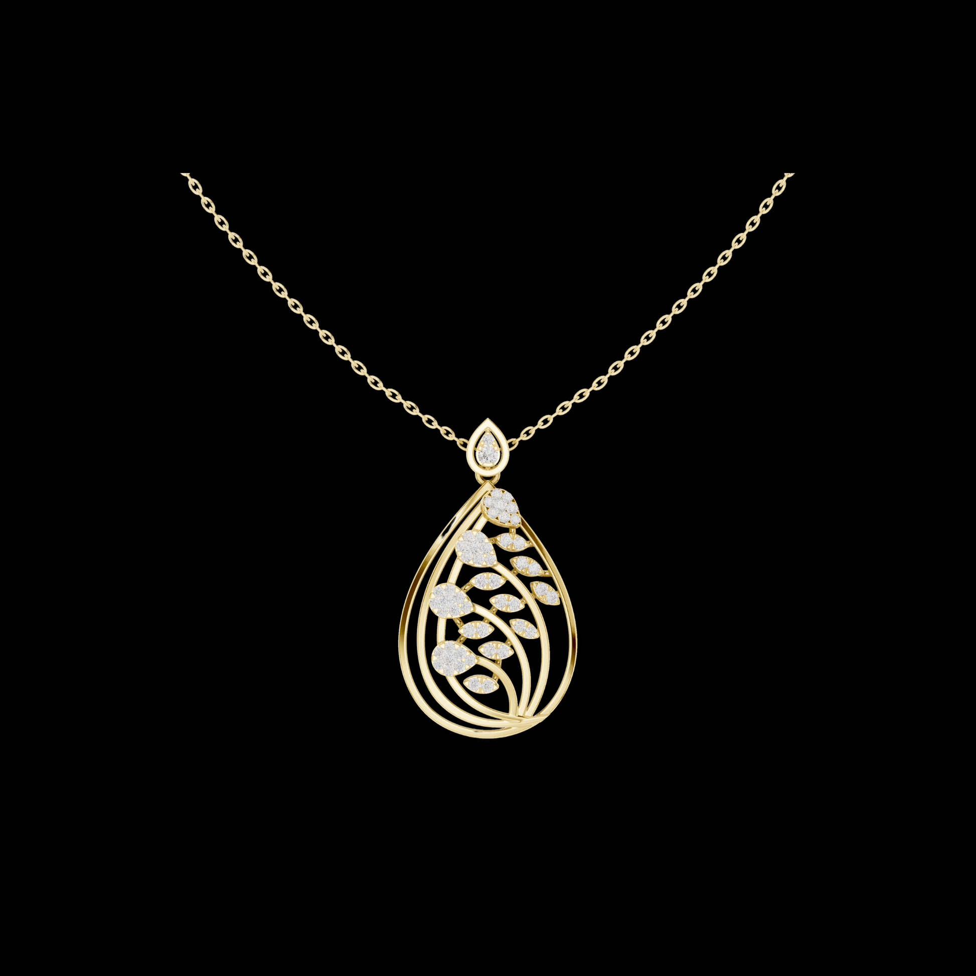 Discover refined elegance with this teardrop diamond pendant. The openwork teardrop silhouette features leaf-inspired curves adorned with shimmering round-cut diamonds, creating graceful movement and brilliant sparkle. Paired with a delicate gold chain, this pendant blends modern femininity, fine craftsmanship, and timeless beauty, perfect for everyday wear or special occasions.