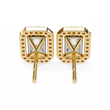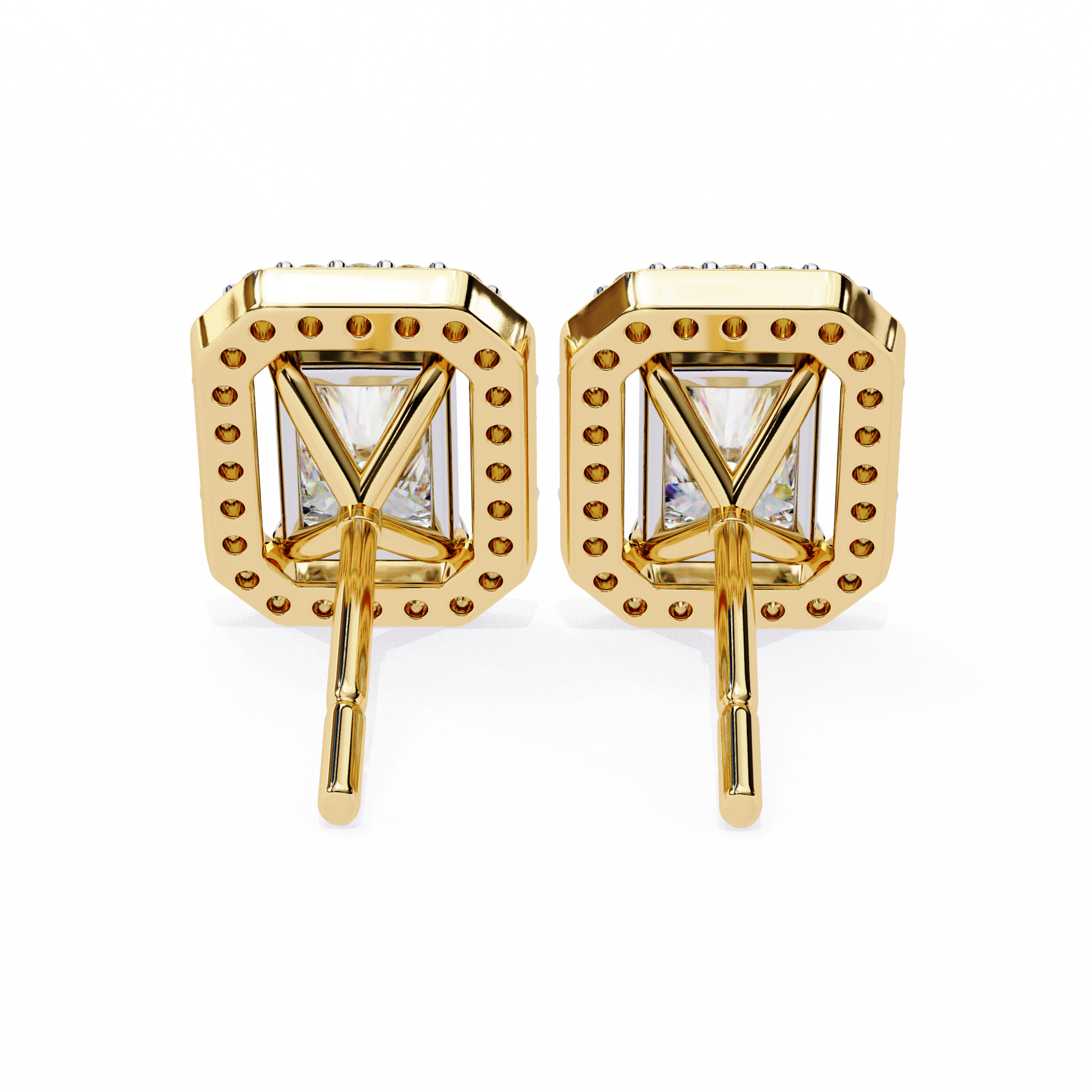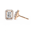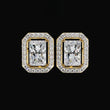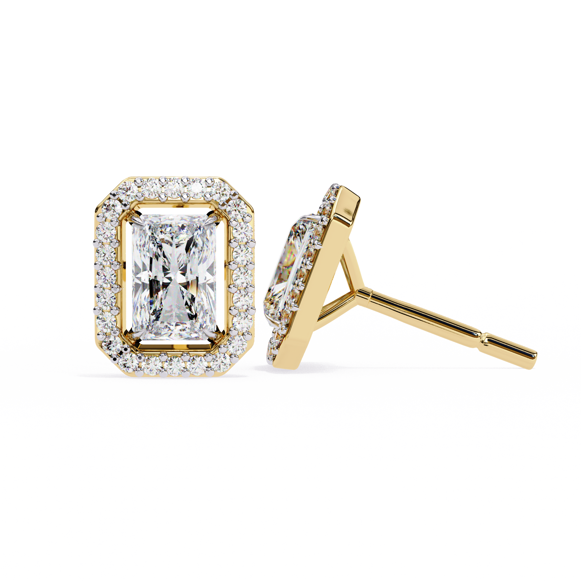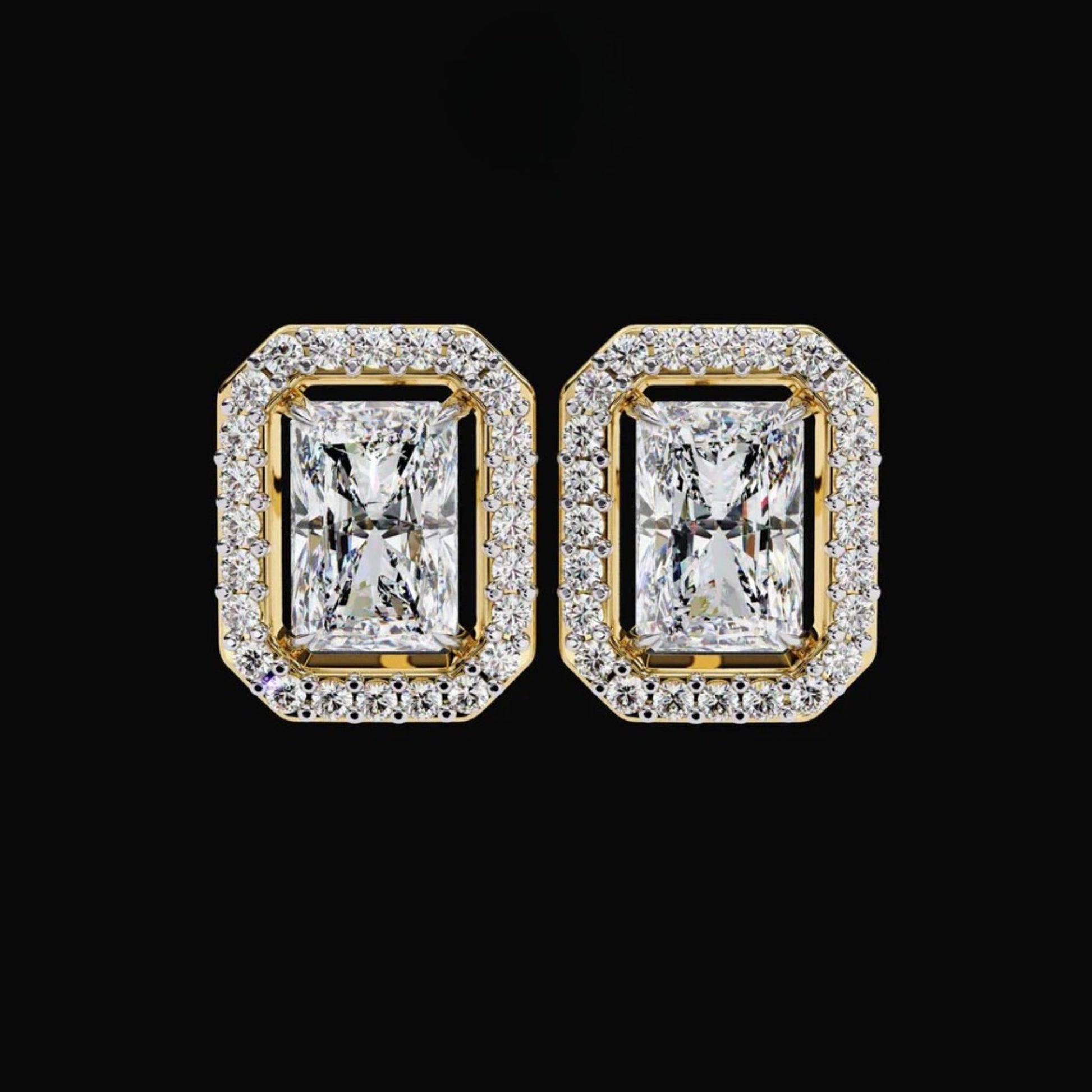 These radiant cut halo diamond stud earrings exude luxury and brilliance, showcasing striking rectangular center stones framed by a shimmering halo of finely set diamonds. The rich gold setting enhances the geometric elegance of the radiant cut, creating a bold yet timeless look. Perfect for elevating everyday style or adding refined sparkle to special occasions, these earrings offer a flawless balance of sophistication and shine.