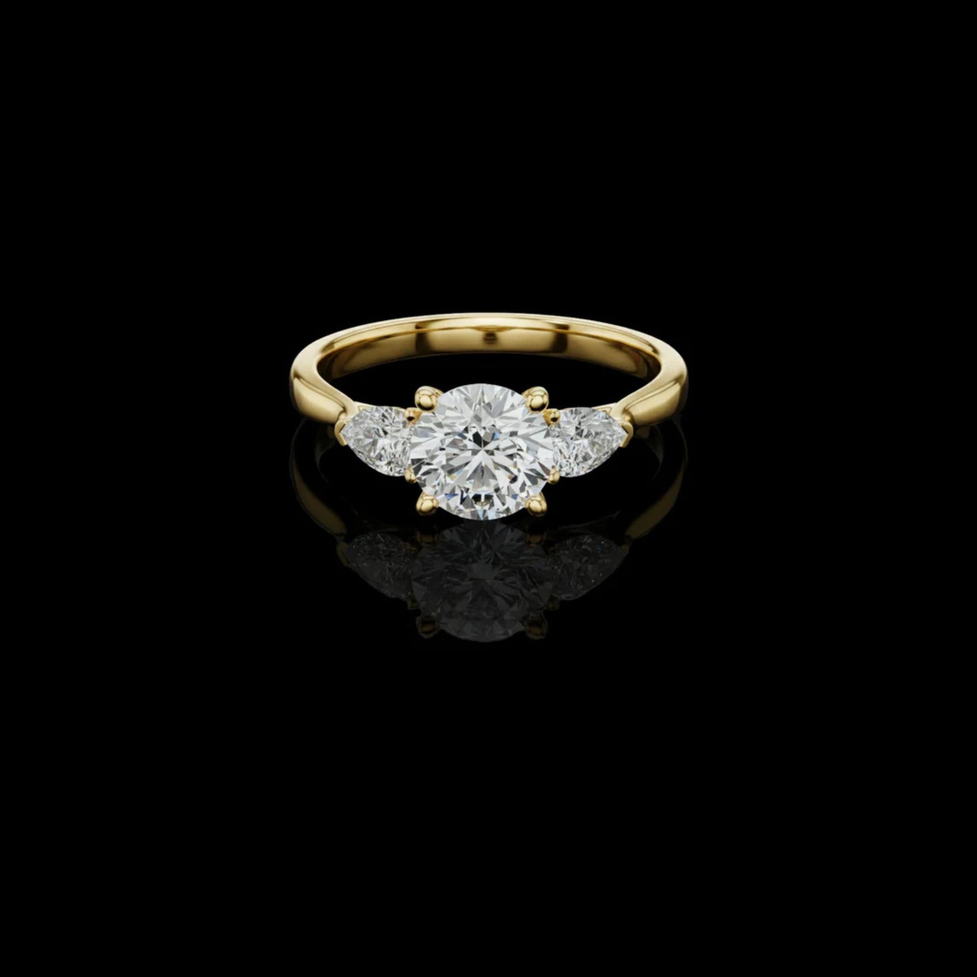 Elevate your elegance with this breathtaking round-cut diamond ring set in luxurious gold. The brilliant center stone is beautifully flanked by sparkling pear-shape side diamonds, creating a flawless three-stone design that symbolizes past, present, and future. Crafted with premium precision, this piece offers exceptional shine, clarity, and timeless sophistication. A perfect choice for engagements, anniversaries, or anyone who loves classic luxury.