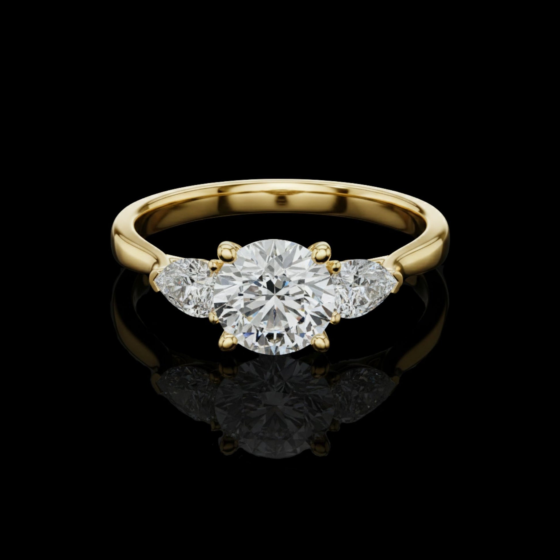Elevate your elegance with this breathtaking round-cut diamond ring set in luxurious gold. The brilliant center stone is beautifully flanked by sparkling pear-shape side diamonds, creating a flawless three-stone design that symbolizes past, present, and future. Crafted with premium precision, this piece offers exceptional shine, clarity, and timeless sophistication. A perfect choice for engagements, anniversaries, or anyone who loves classic luxury.