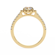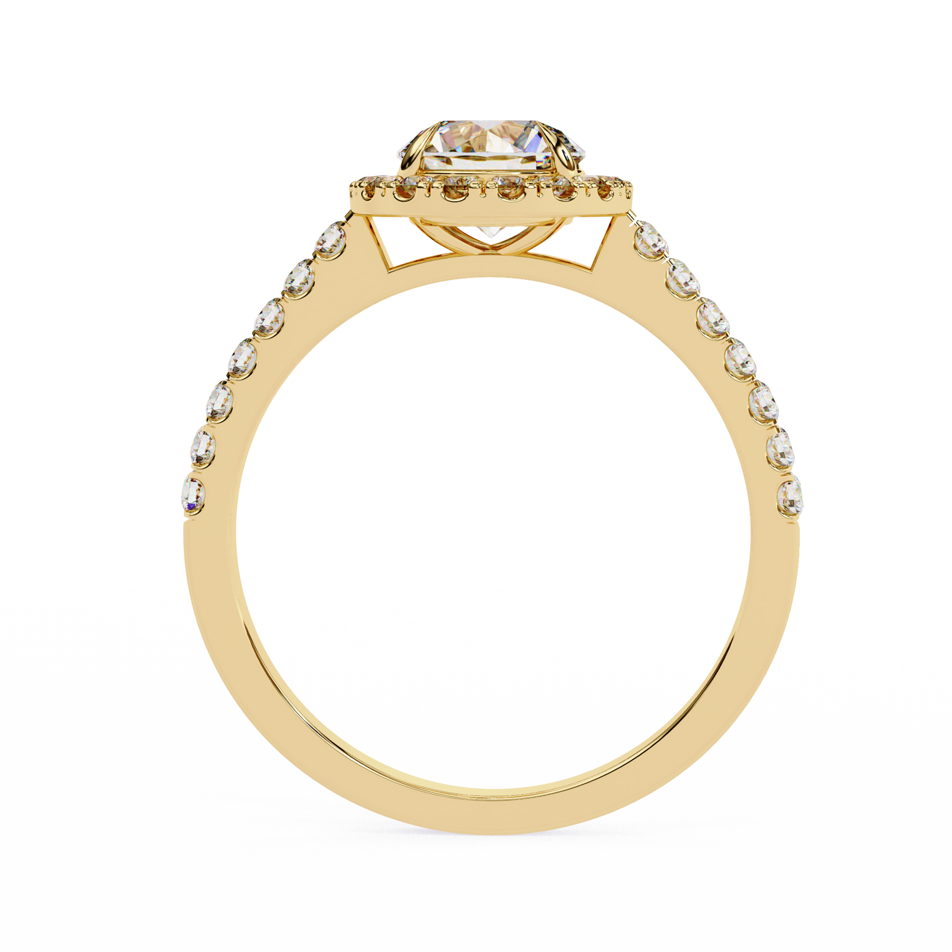 This elegant engagement ring features a brilliant round-cut center diamond surrounded by a sparkling halo of smaller diamonds, all set in luxurious gold. The band is adorned with additional pave set diamonds, enhancing the ring’s overall radiance and giving it a timeless, sophisticated look. Perfect for someone who loves classic elegance with a touch of modern glamour.