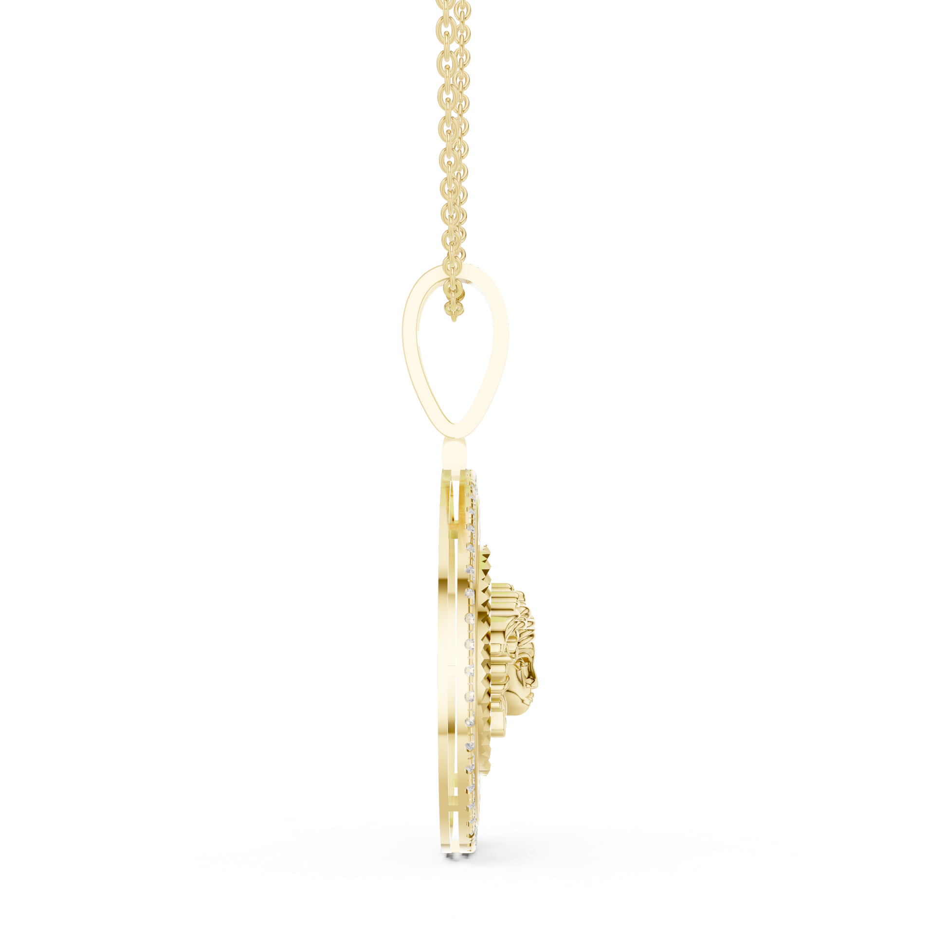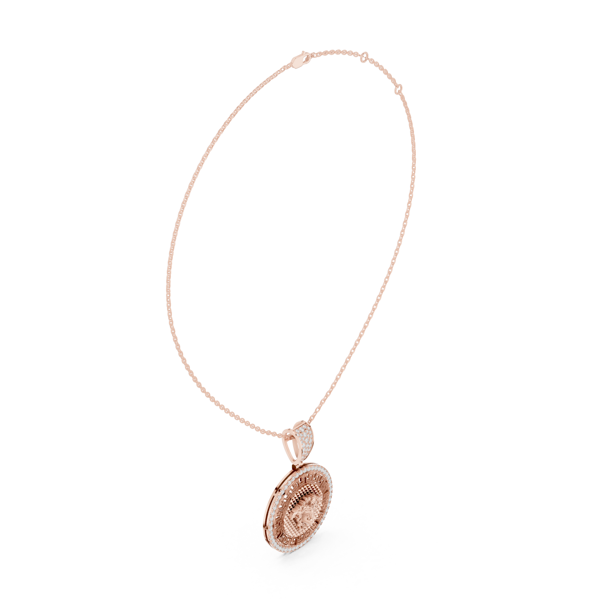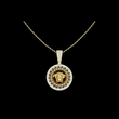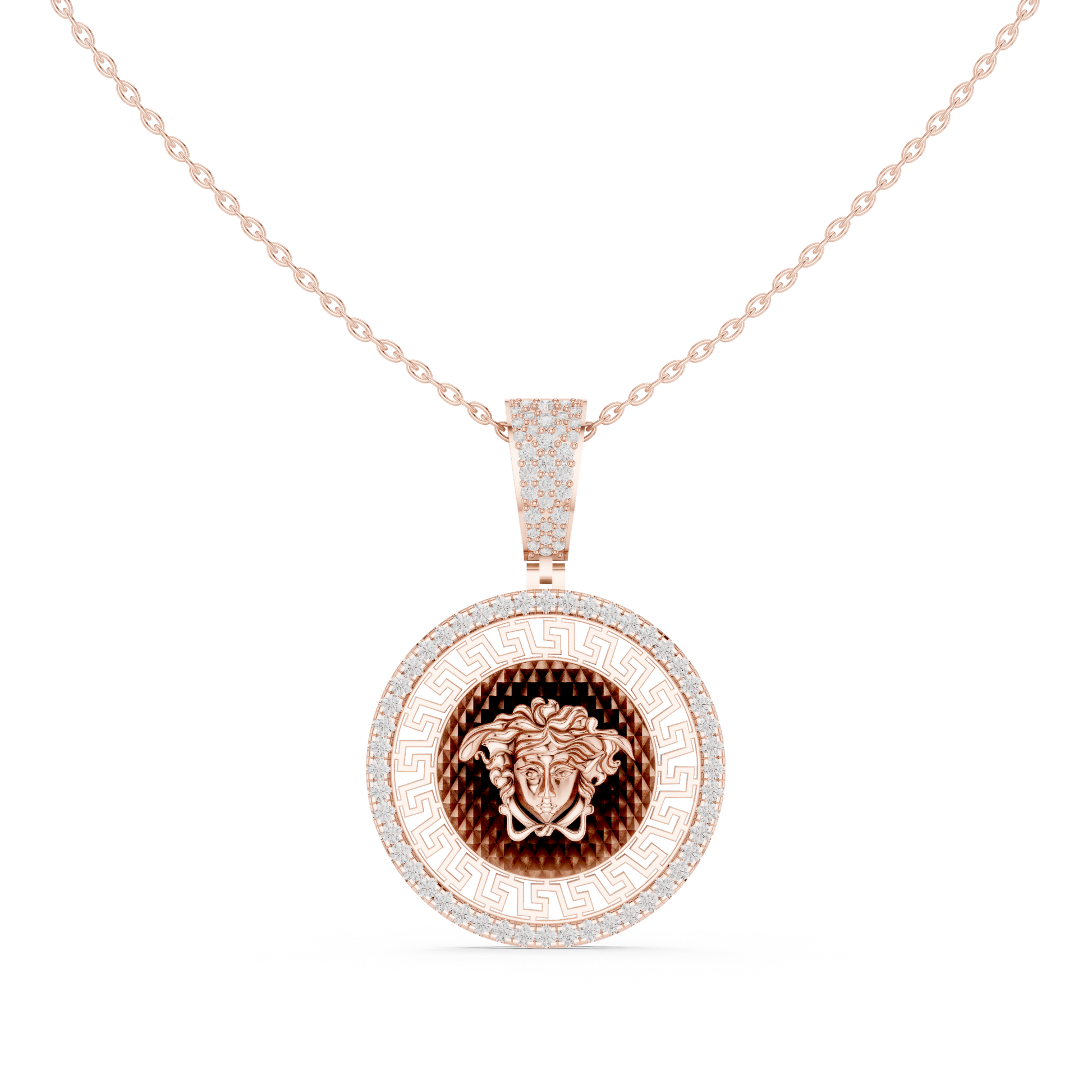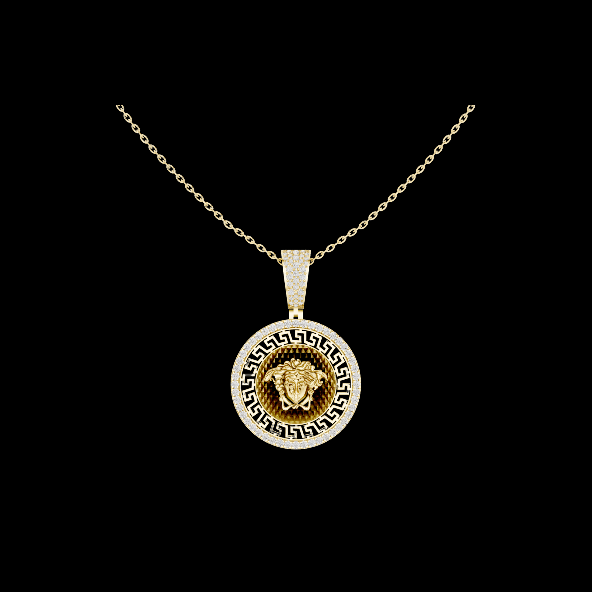 This exclusive Medusa pendant is a bold symbol of power, elegance, and timeless design. Crafted in a round gold medallion style, it features a detailed Medusa head centerpiece surrounded by a classic Greek key border, representing strength and infinity. The outer rim is enhanced with brilliant iced stones, adding radiant sparkle, while the stone-set bail seamlessly connects to the polished gold chain for a premium finish.