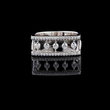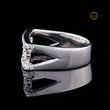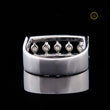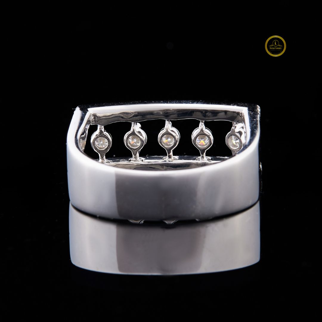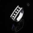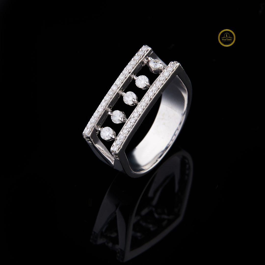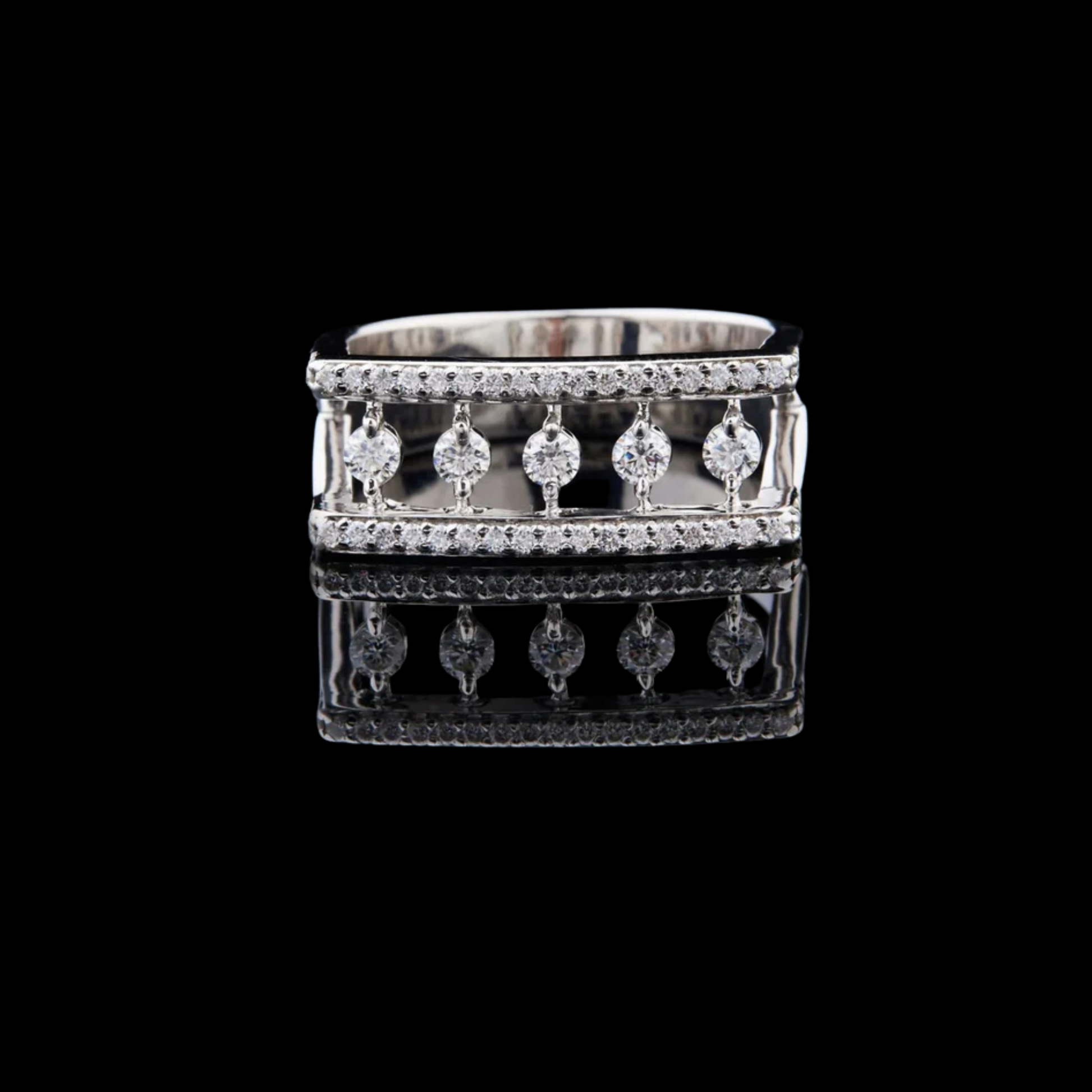 This striking sterling silver ring from Ivevar Luxury features a unique, contemporary design. The wide band showcases two parallel rows of micro-pavé set diamonds along the top and bottom edges, providing brilliant sparkle. The central feature is a mesmerizing arrangement of five round brilliant-cut diamonds that appear to "dangle" freely between the two diamond-encrusted bands, creating a stunning chandelier effect. This intricate design, set against a polished black background in the image, reflects a sophisticated, modern glamour.