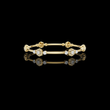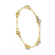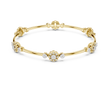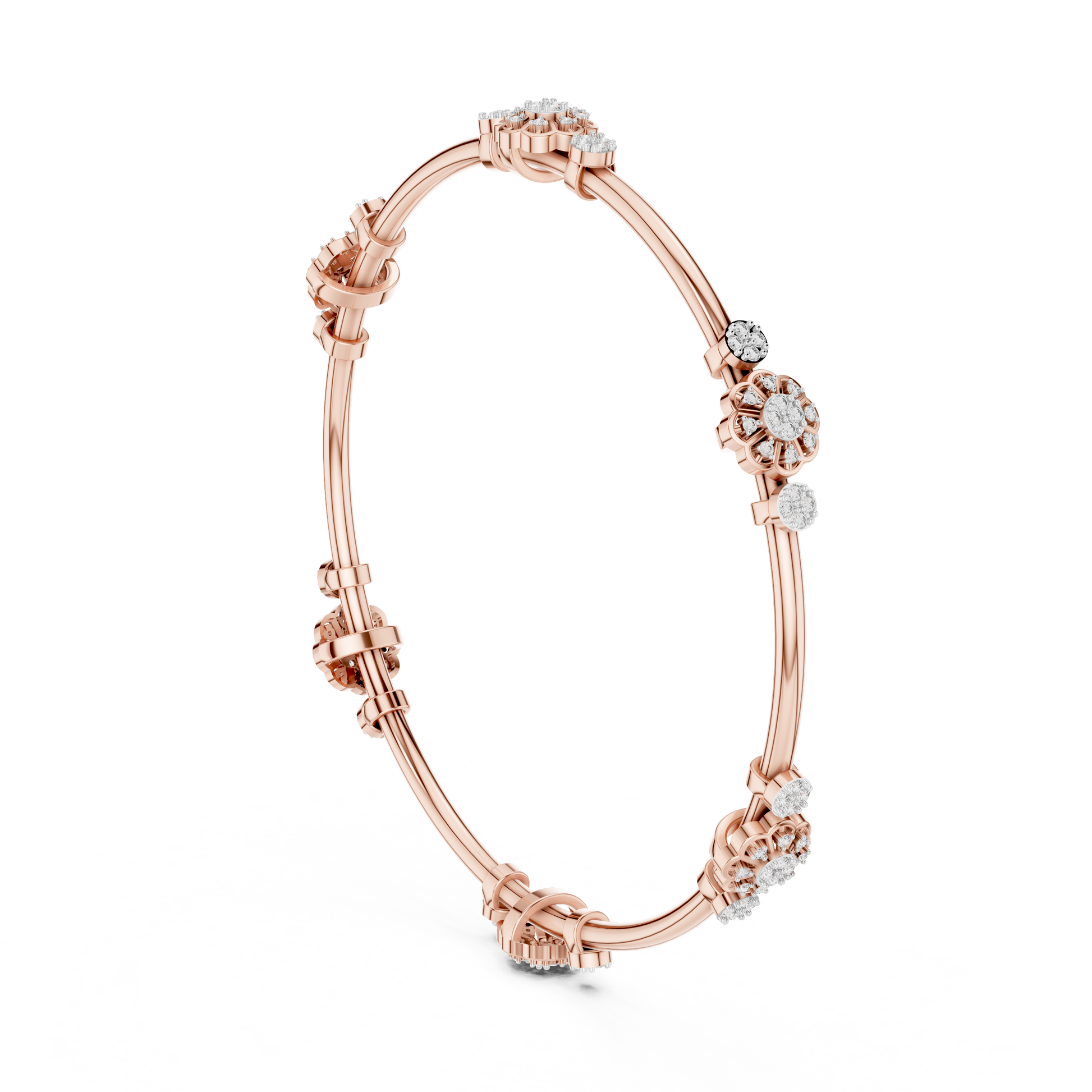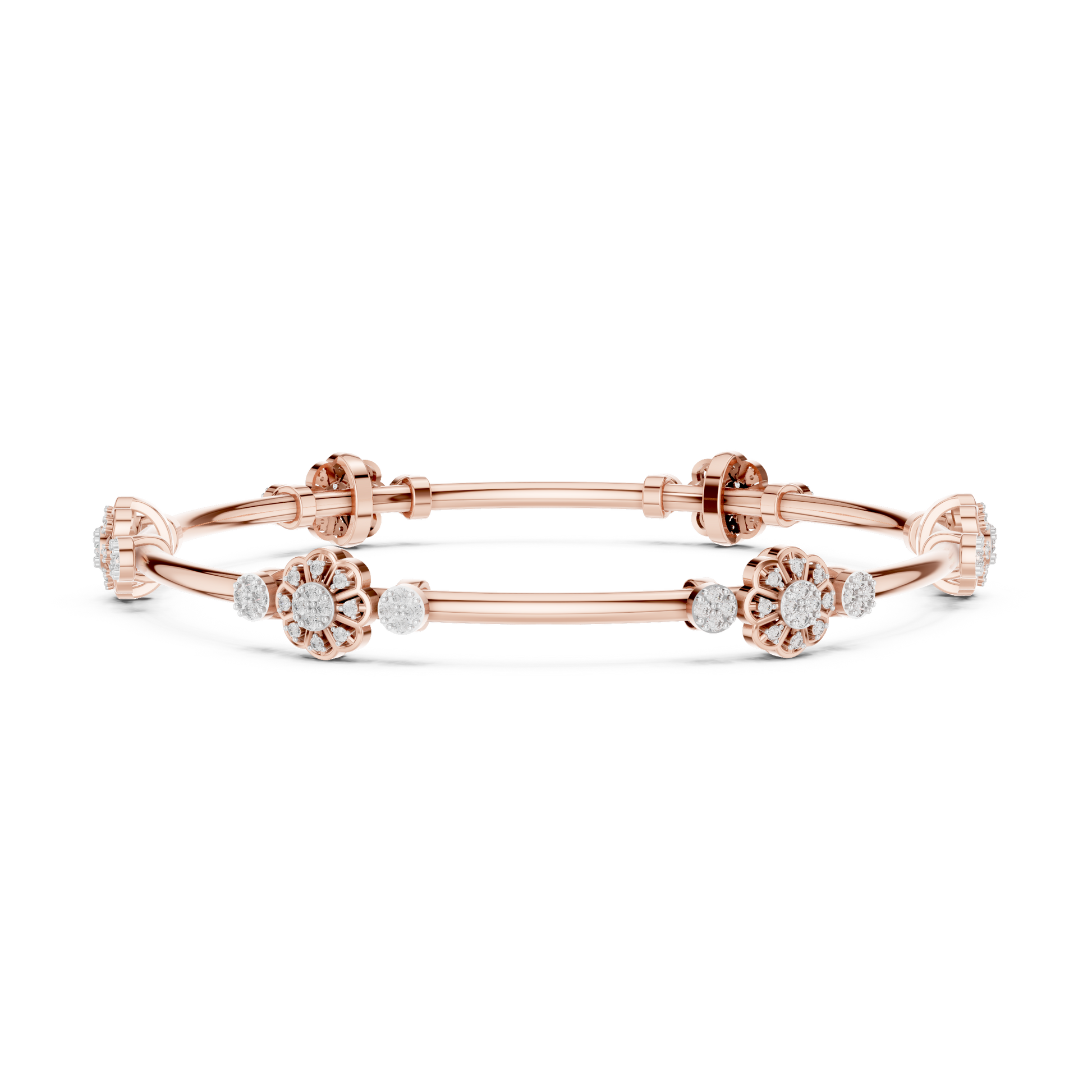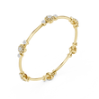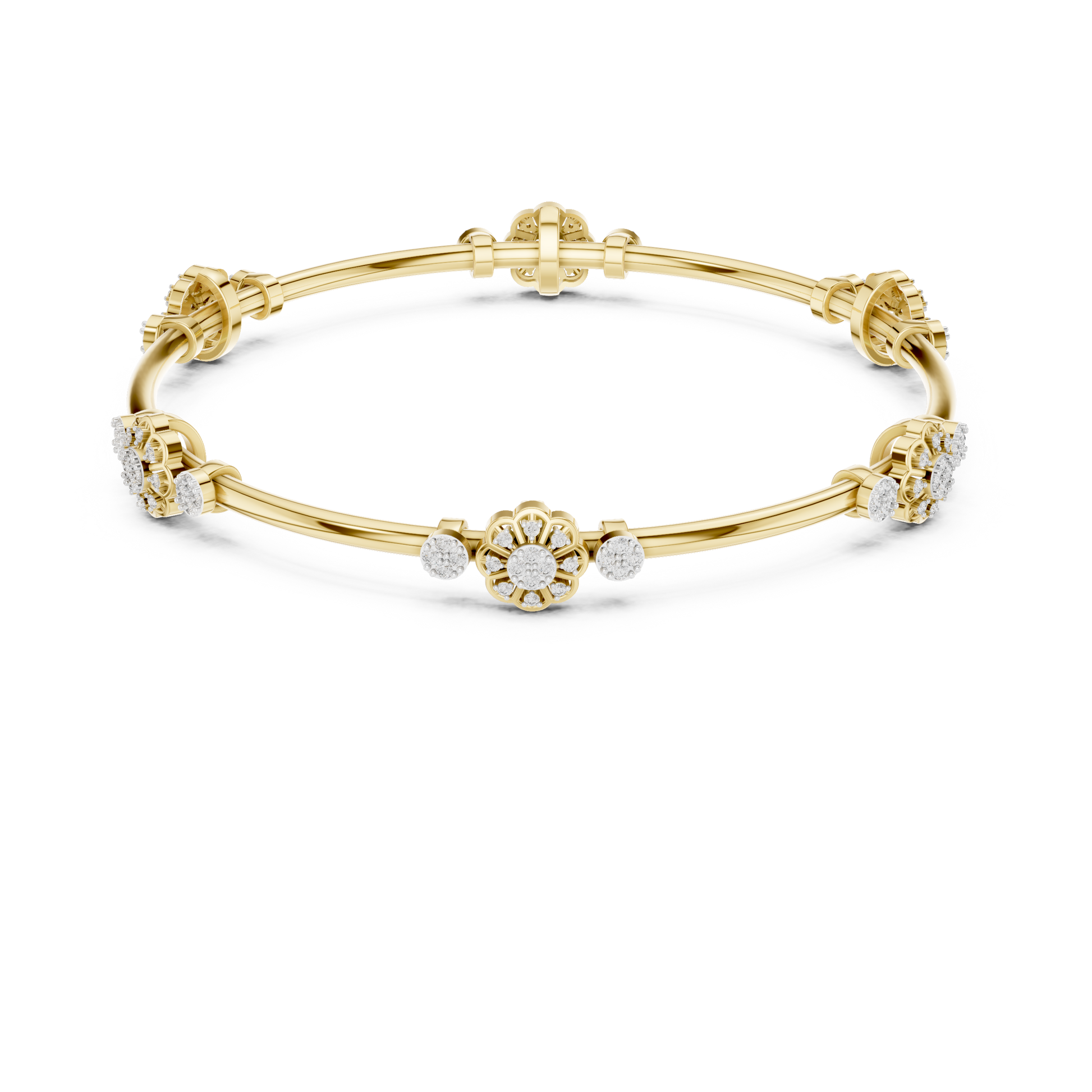 This elegant gold bangle bracelet showcases a refined floral design, featuring delicately crafted bloom motifs adorned with sparkling round diamonds. The polished gold band is accented with evenly spaced flower clusters and diamond-studded beads, creating a harmonious balance of brilliance and sophistication. Designed with a smooth, structured silhouette, this bracelet offers a timeless appeal that transitions effortlessly from everyday elegance to special occasions, making it a graceful addition to any fine jewelry collection.