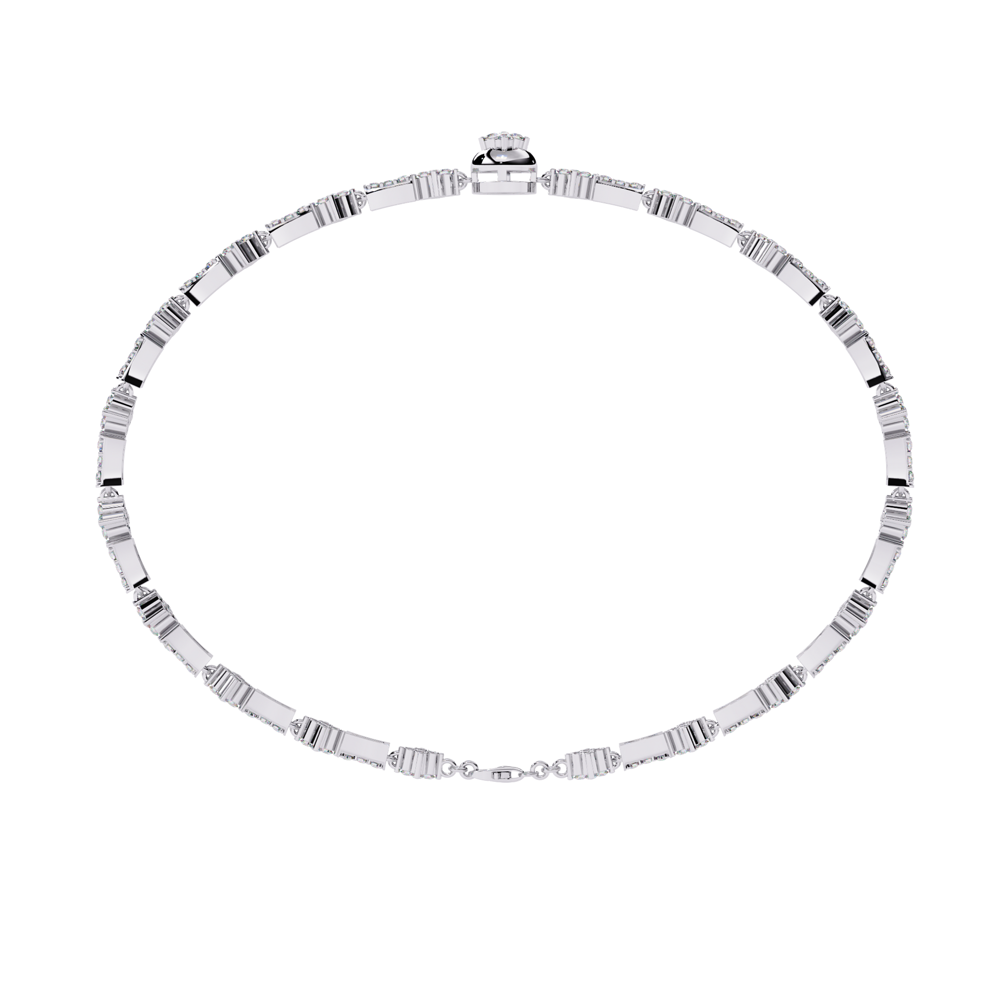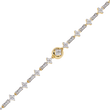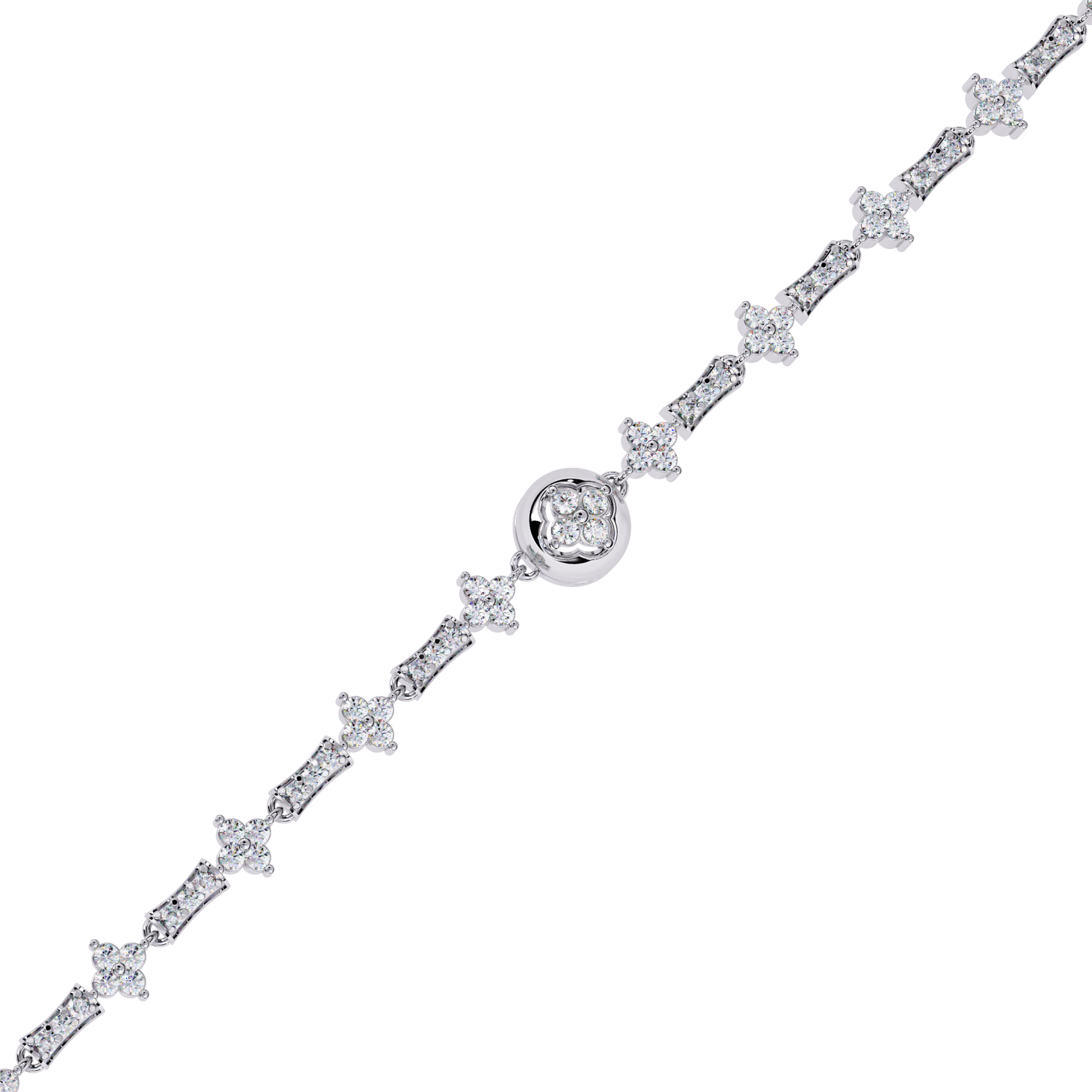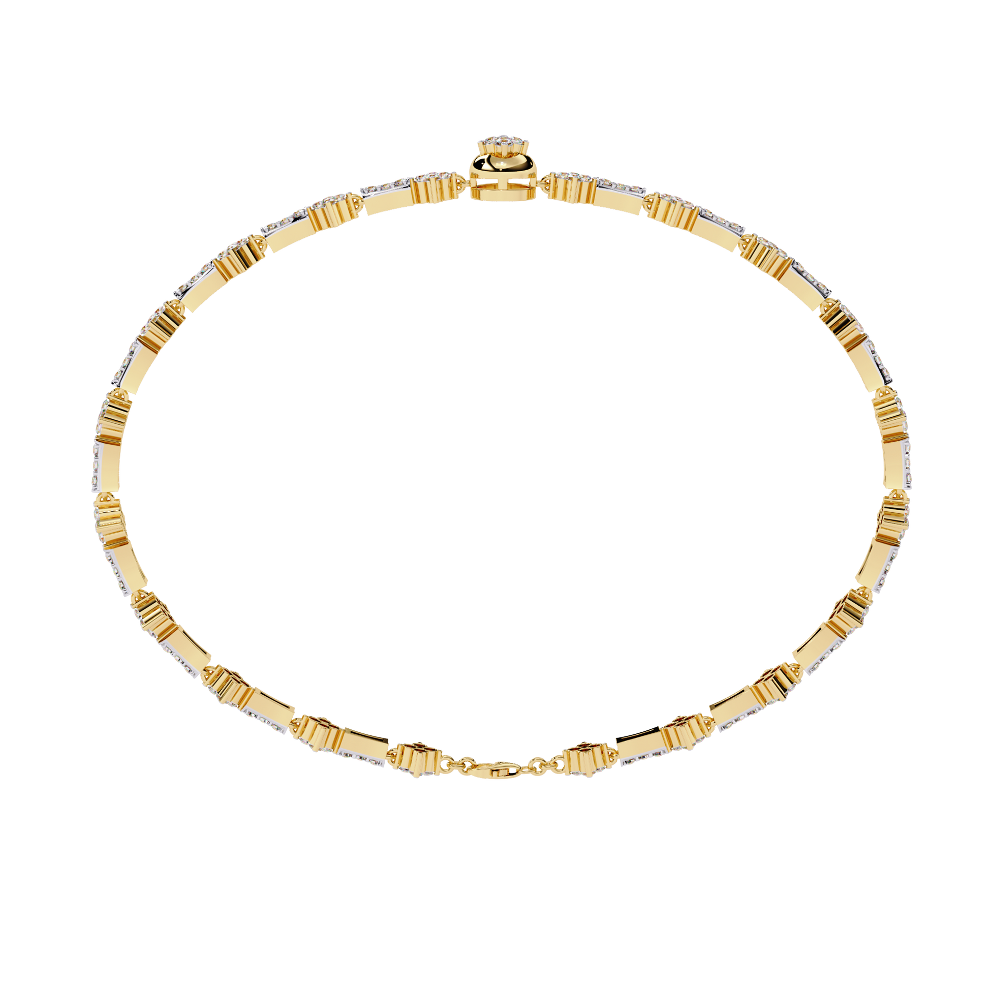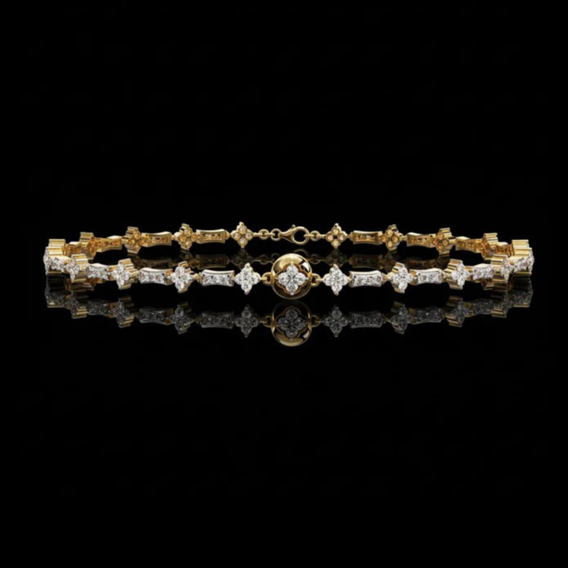 This elegant bracelet features an intricate sequence of gold links accented with dazzling round diamonds, creating a luxurious balance of sparkle and sophistication. Its geometric and floral-inspired elements give it a refined, vintage-influenced character, while the central cluster detail adds a striking focal point. Crafted with meticulous attention to detail, this piece offers a timeless aesthetic perfect for formal occasions or elevating everyday elegance.