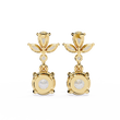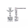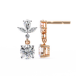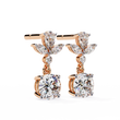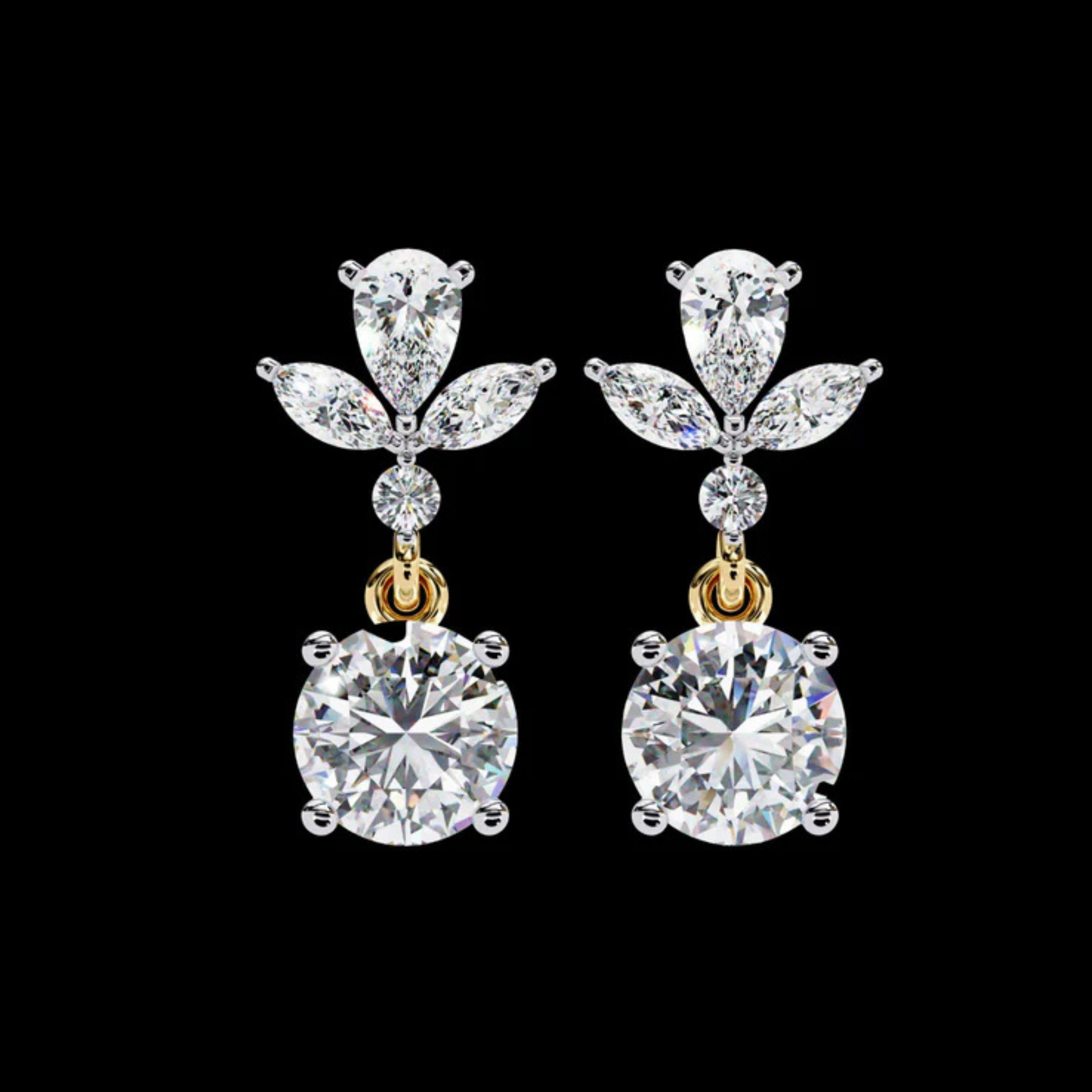 These earrings showcase an elegant floral-inspired arrangement of pear-cut and marquise-cut diamonds forming a sparkling cluster at the top, paired with a brilliant round diamond drop suspended from a polished gold-tone loop. The combination of mixed stone shapes creates a delicate, refined silhouette, while the contrast between the icy crystals and warm gold accents adds a luxurious touch. Designed to catch the light from every angle, these earrings offer a perfect blend of sophistication and glamour, making them ideal for weddings, special events, or elevating an evening ensemble.