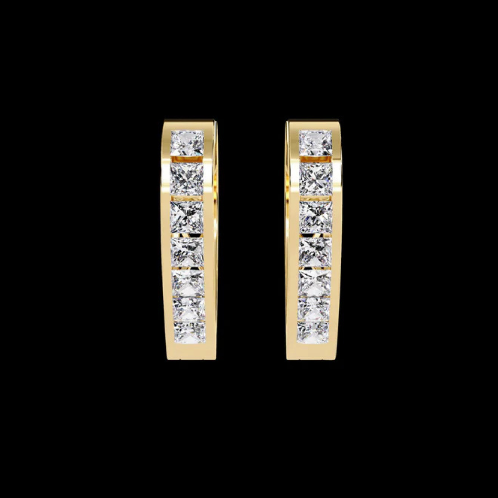 These sleek and sophisticated earrings feature a refined vertical bar design crafted in polished gold, beautifully showcasing a row of meticulously set princess-cut stones. Their clean, modern silhouette highlights the brilliance of each gemstone, creating a radiant line of sparkle that catches the light with every movement. Minimalist yet luxurious, these earrings offer a timeless elegance perfect for both daily wear and elevated occasions, making them a versatile and stylish addition to any jewelry collection.