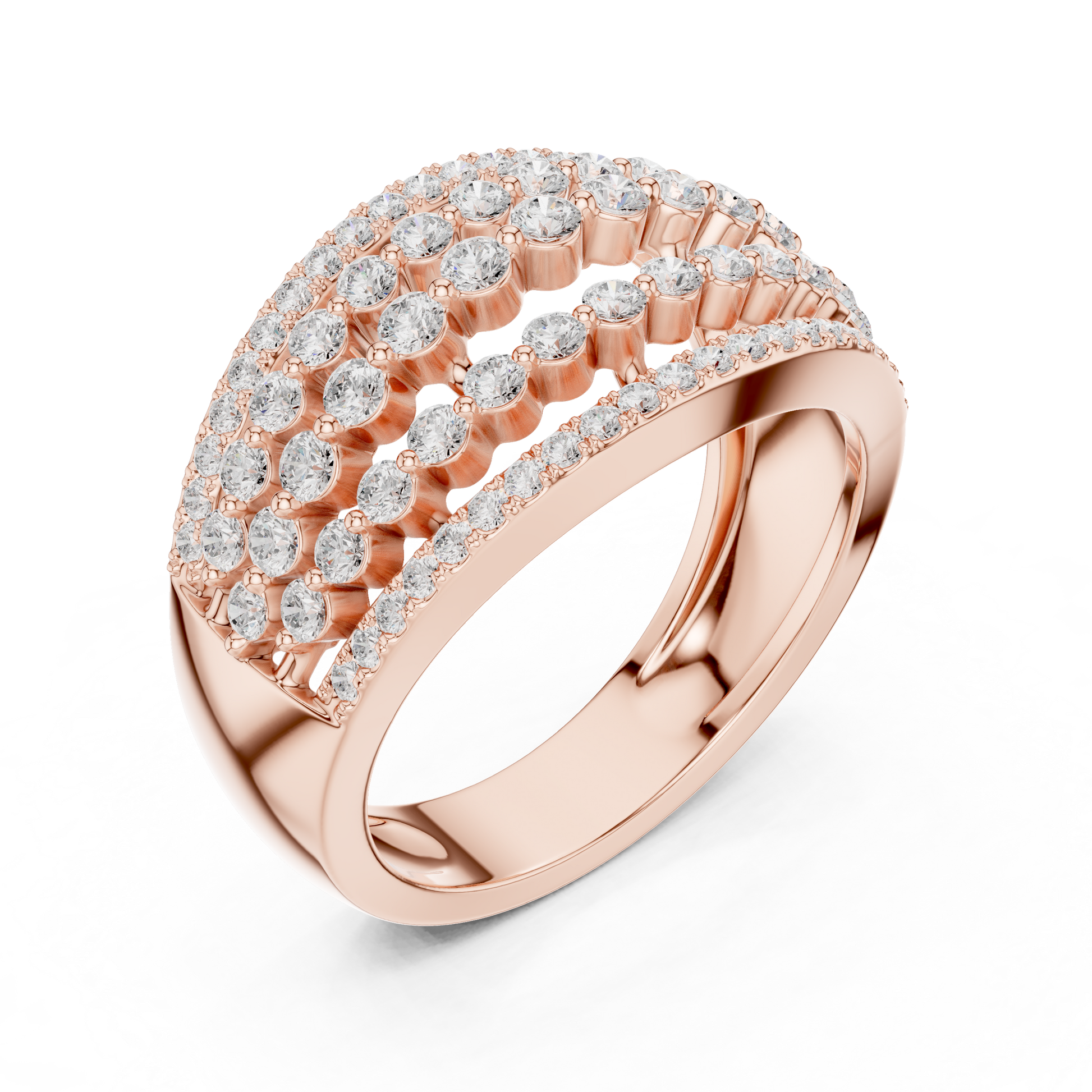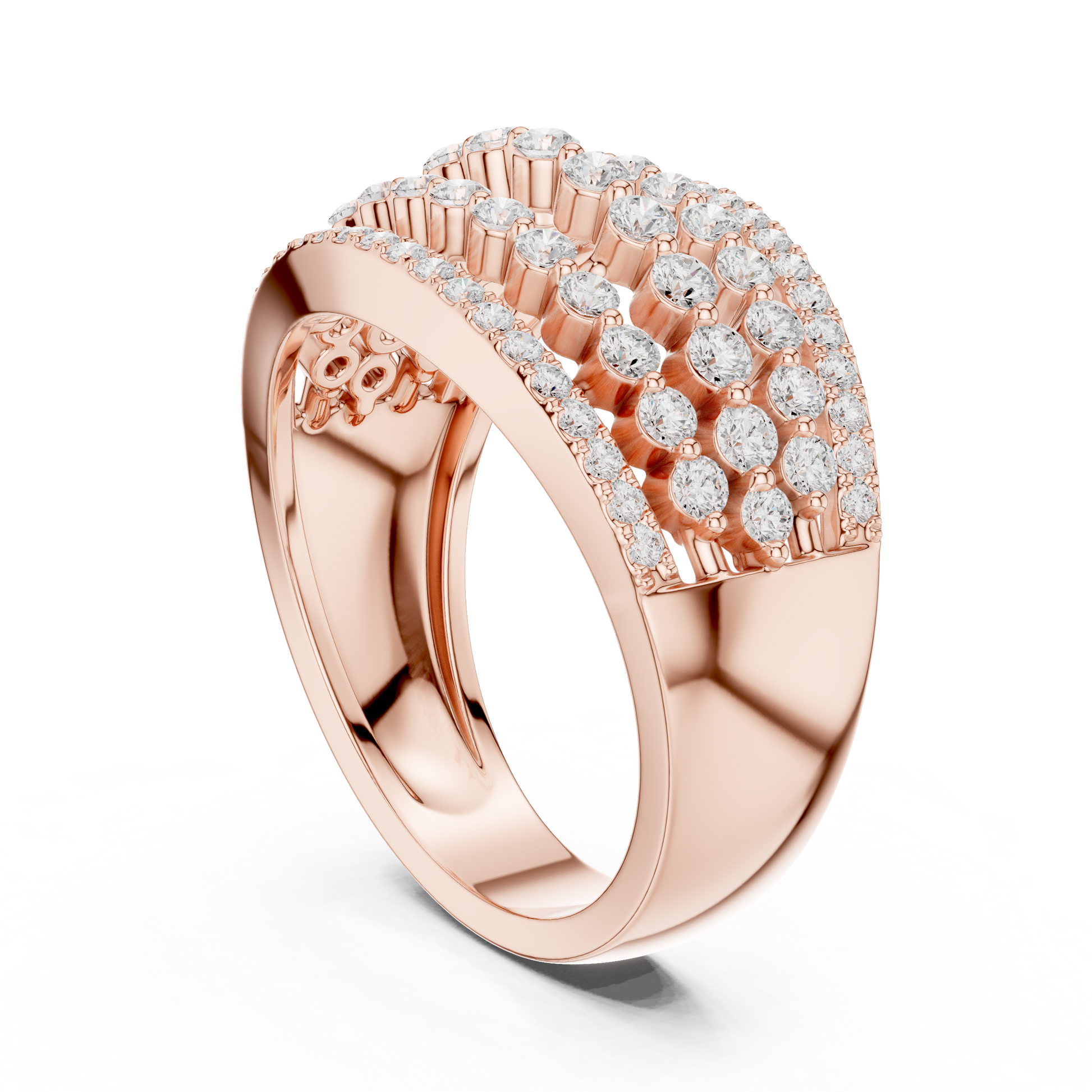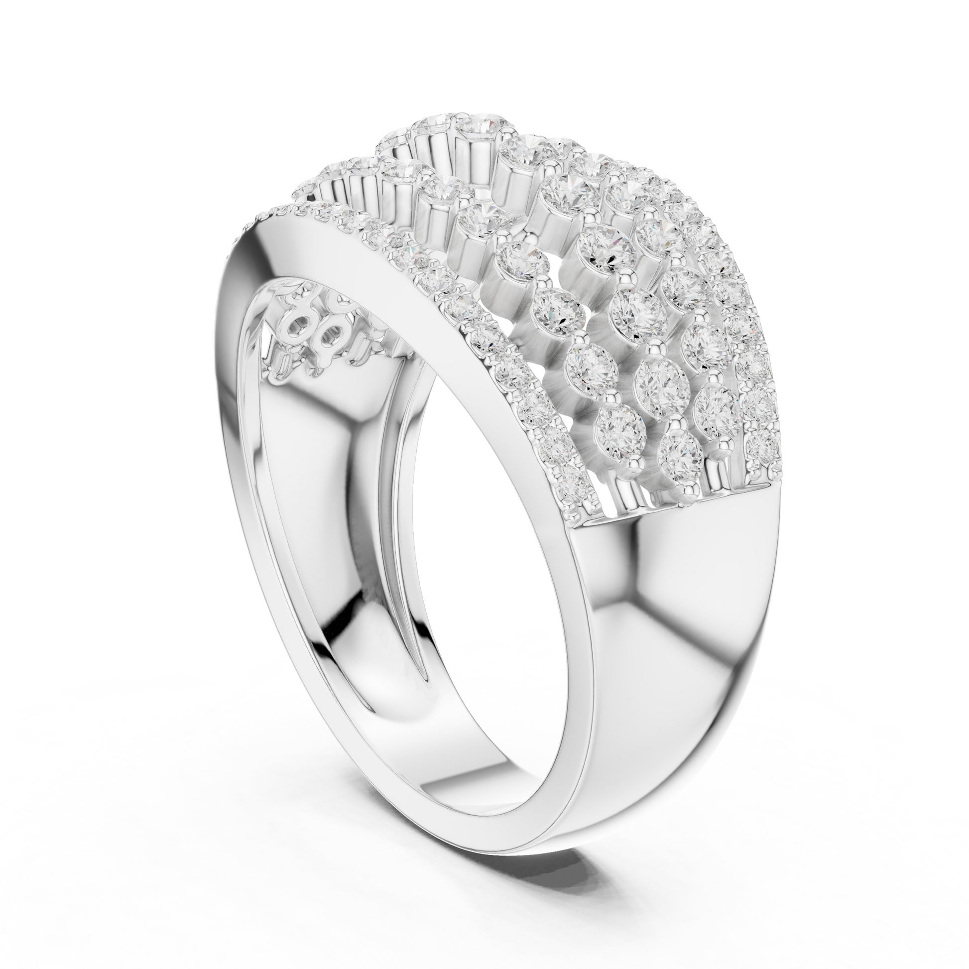 Elevate your style with this exquisitely crafted diamond band, featuring a mesmerizing multi-layered design of perfectly set round-cut diamonds. Each row sparkles with exceptional clarity, forming a radiant lattice of light-reflecting brilliance. The outer edges are adorned with delicate diamond accents, enhancing the ring’s depth, shine, and sophistication. A true statement piece, this ring blends timeless elegance with contemporary luxury, making it ideal for anniversaries, milestone celebrations, or everyday glamour.