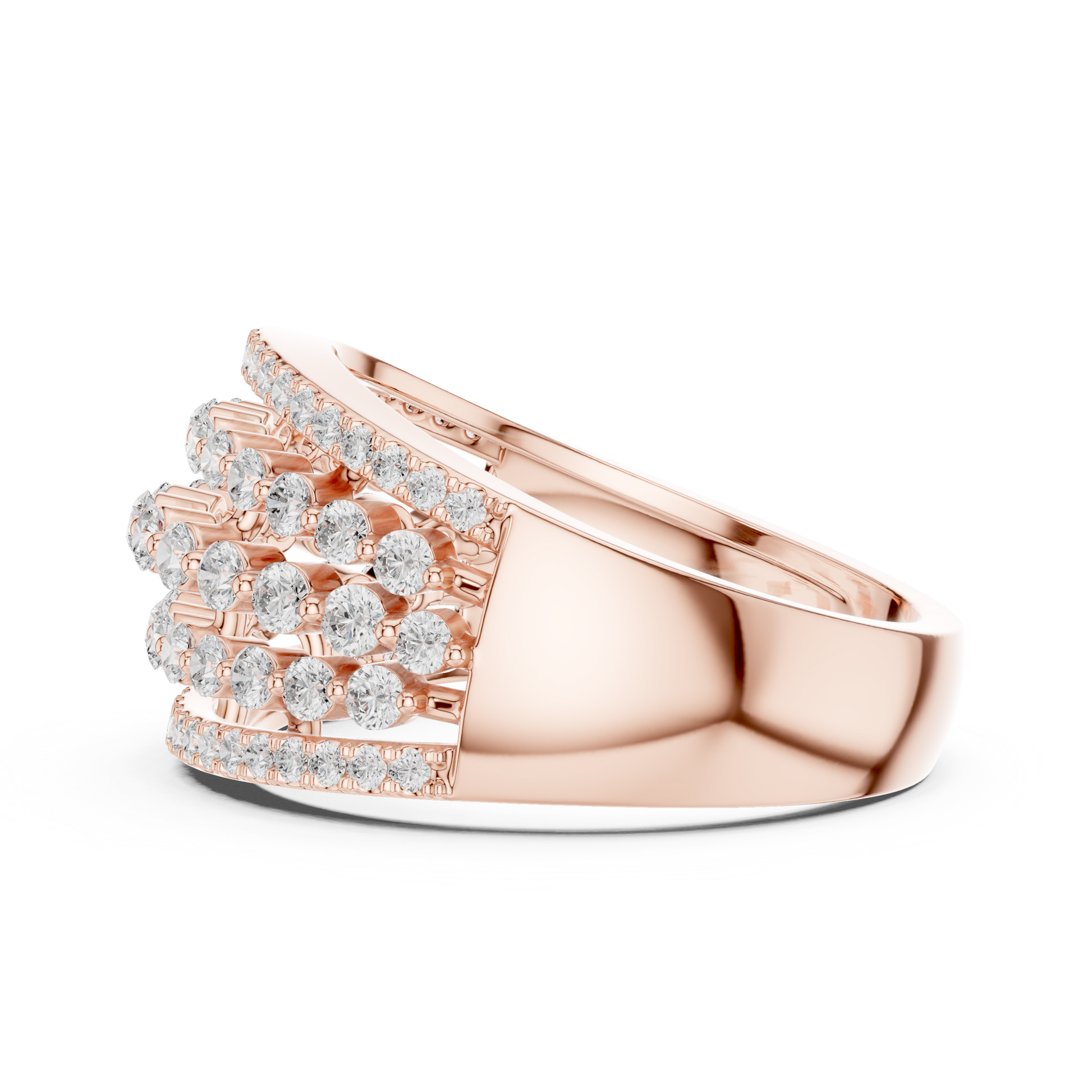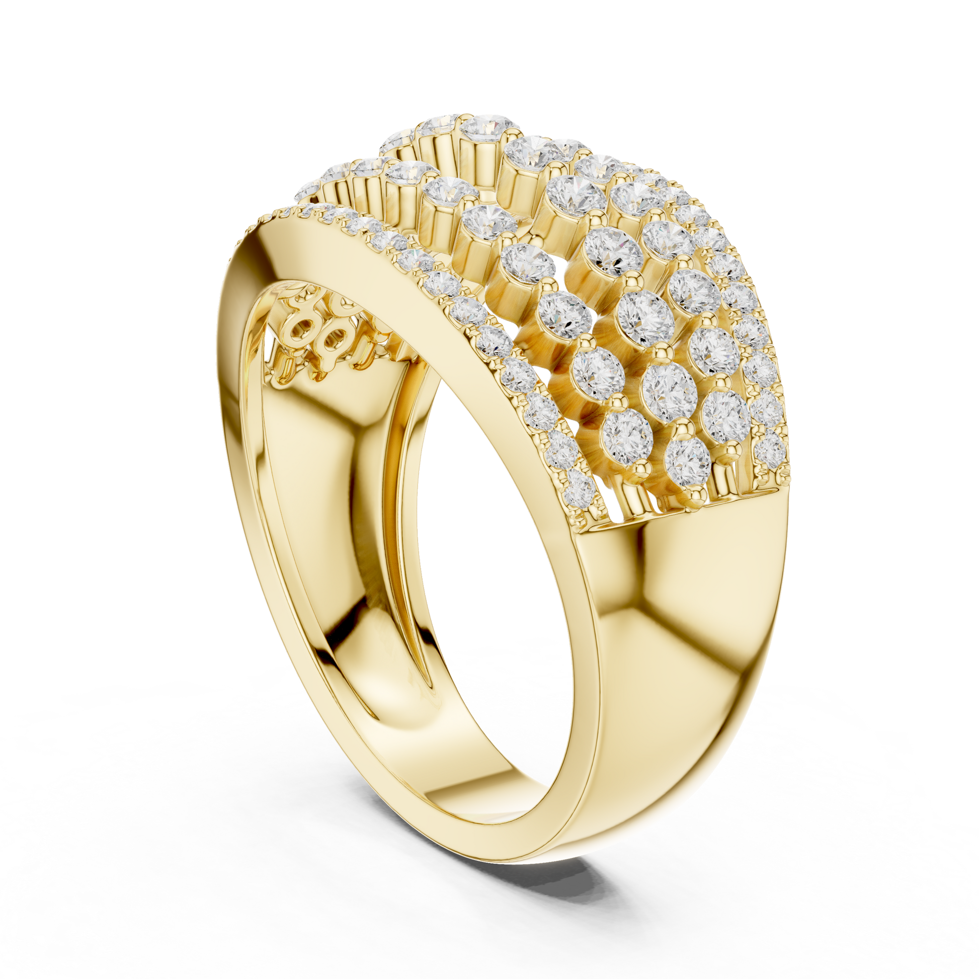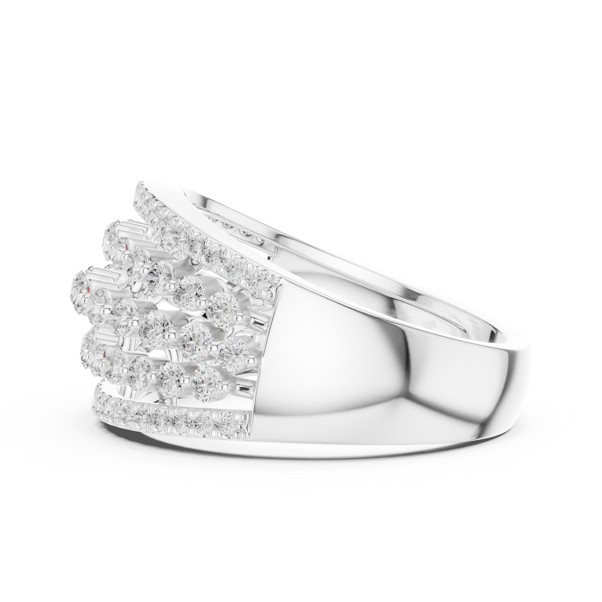 Elevate your style with this exquisitely crafted diamond band, featuring a mesmerizing multi-layered design of perfectly set round-cut diamonds. Each row sparkles with exceptional clarity, forming a radiant lattice of light-reflecting brilliance. The outer edges are adorned with delicate diamond accents, enhancing the ring’s depth, shine, and sophistication. A true statement piece, this ring blends timeless elegance with contemporary luxury, making it ideal for anniversaries, milestone celebrations, or everyday glamour.