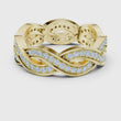 This exquisite gold ring features an elegant braided design, where polished gold strands intertwine with two shimmering rows of pavé-set diamonds to create a look of fluid movement and timeless romance. The intricate weave adds depth and texture, giving the band a luxurious presence while maintaining a graceful, feminine feel. Sparkling from every angle, this ring effortlessly blends artistry and sophistication, making it a stunning choice for a wedding band, anniversary gift, or a statement piece of fine jewelry from Ivevar.