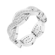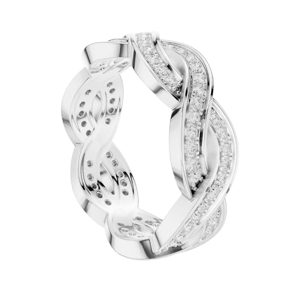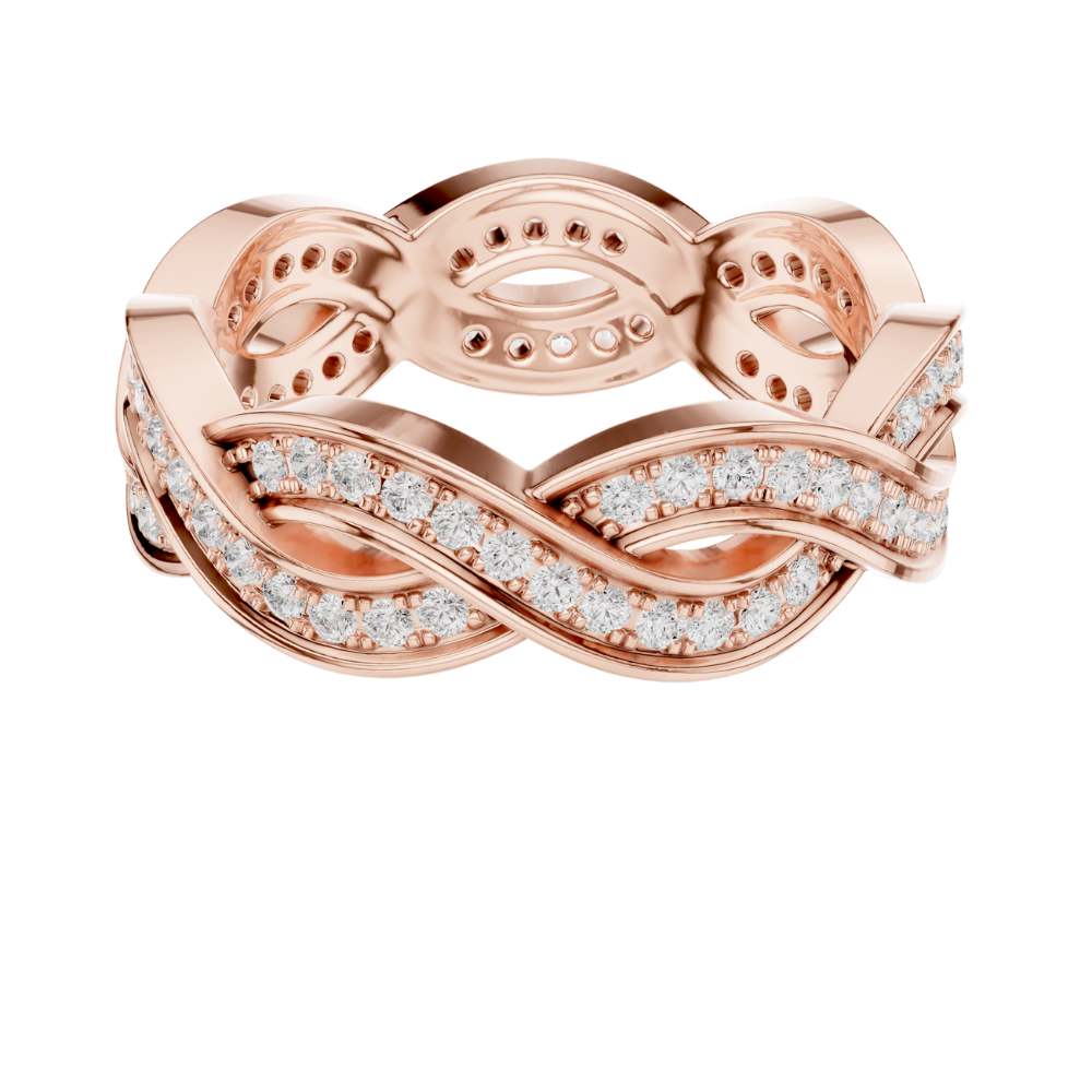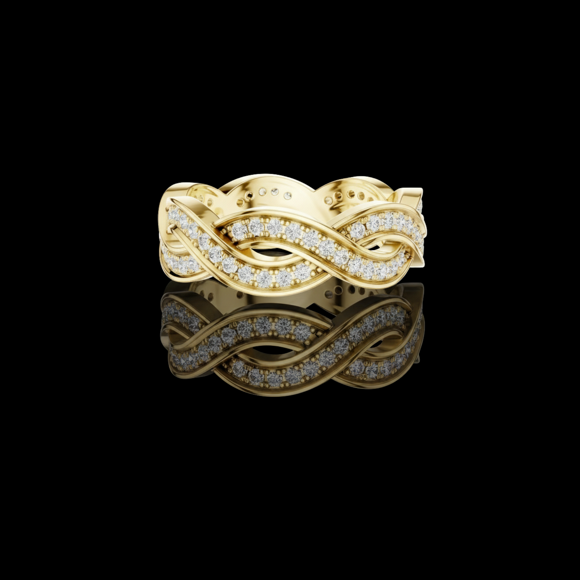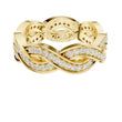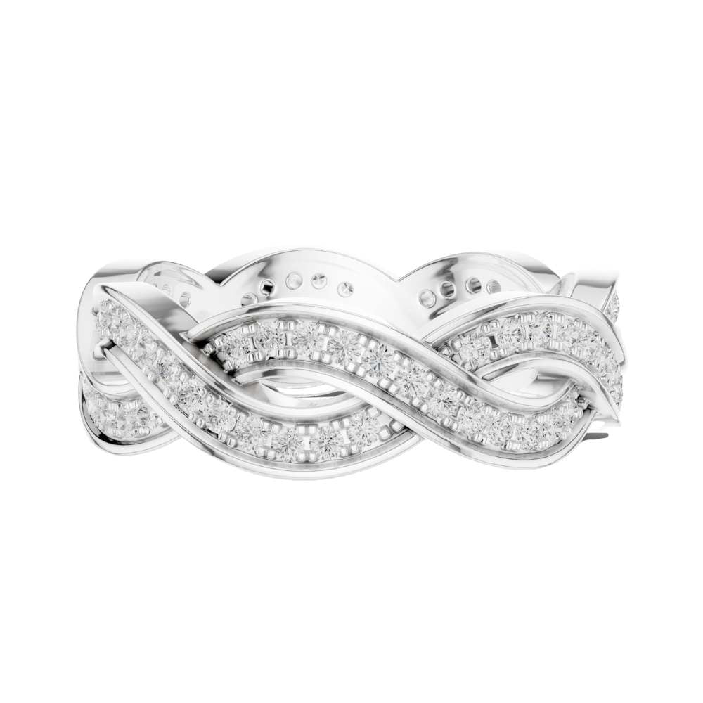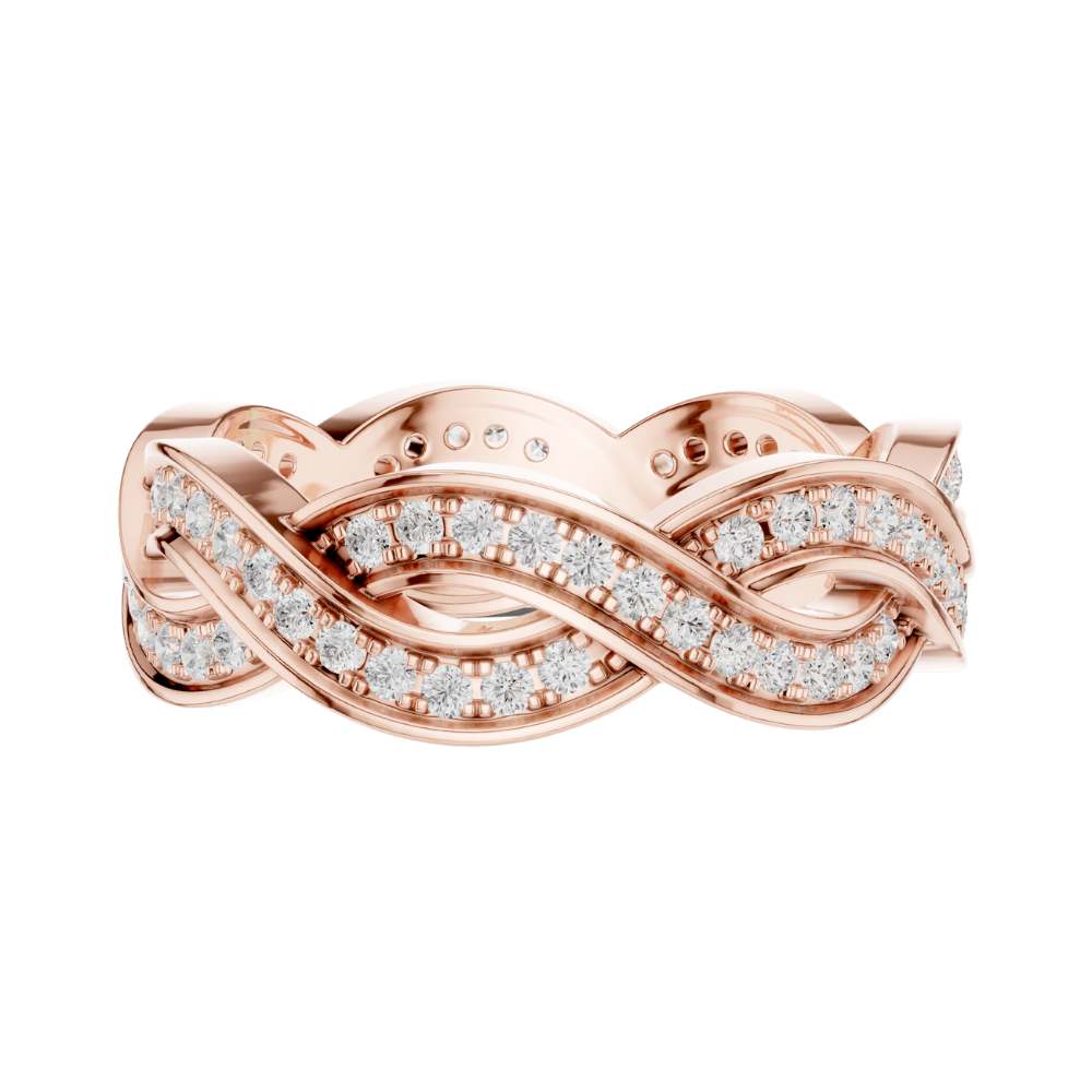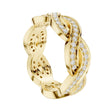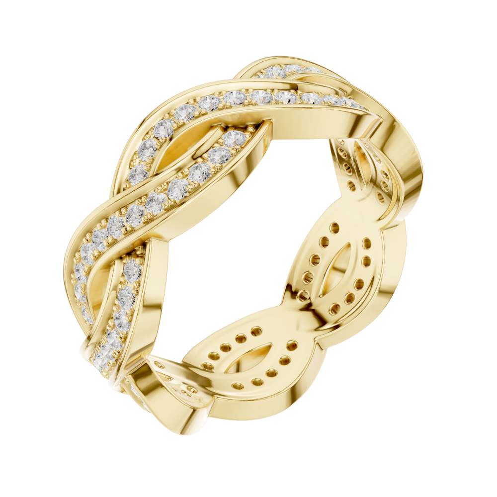 This exquisite gold ring features an elegant braided design, where polished gold strands intertwine with two shimmering rows of pavé-set diamonds to create a look of fluid movement and timeless romance. The intricate weave adds depth and texture, giving the band a luxurious presence while maintaining a graceful, feminine feel. Sparkling from every angle, this ring effortlessly blends artistry and sophistication, making it a stunning choice for a wedding band, anniversary gift, or a statement piece of fine jewelry from Ivevar.