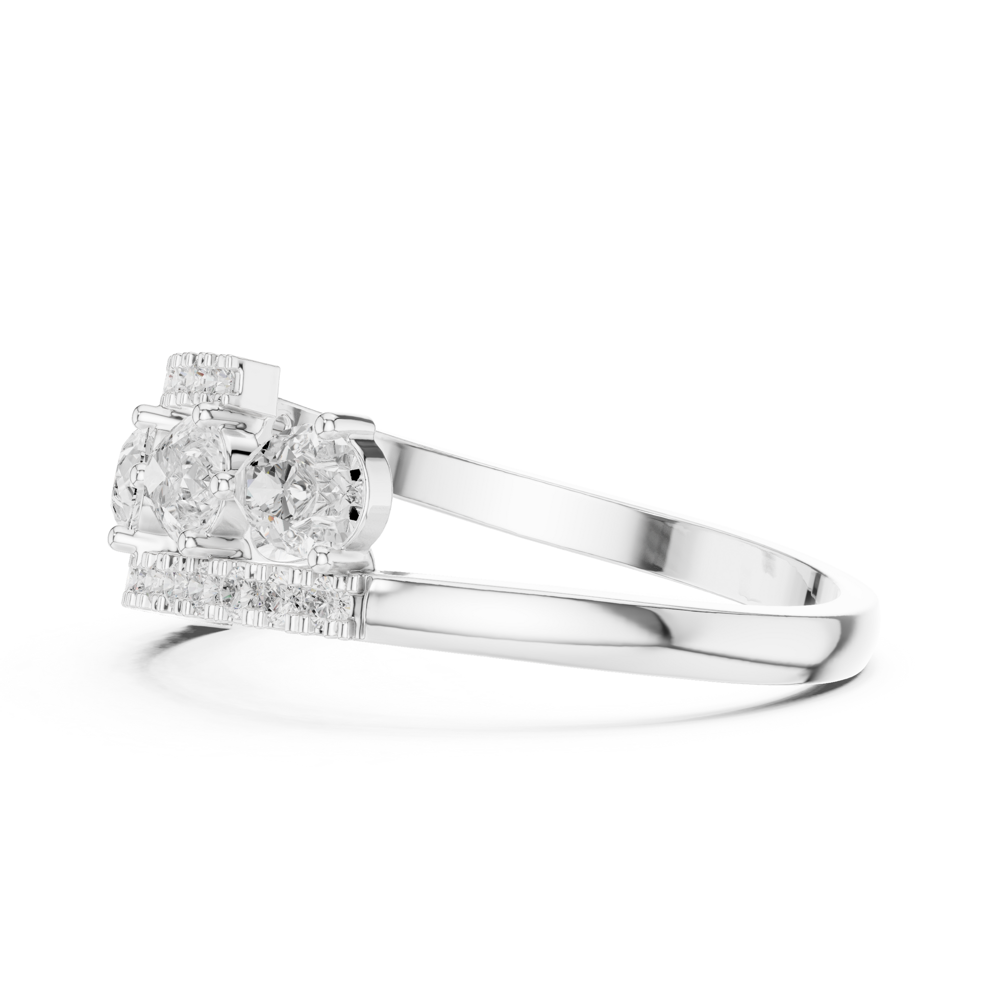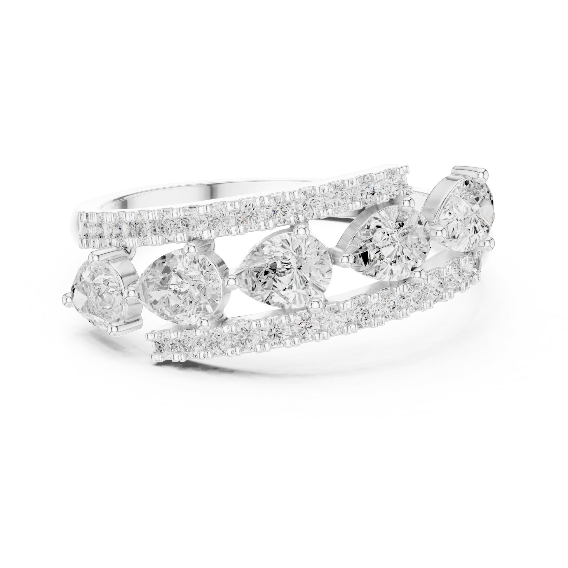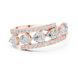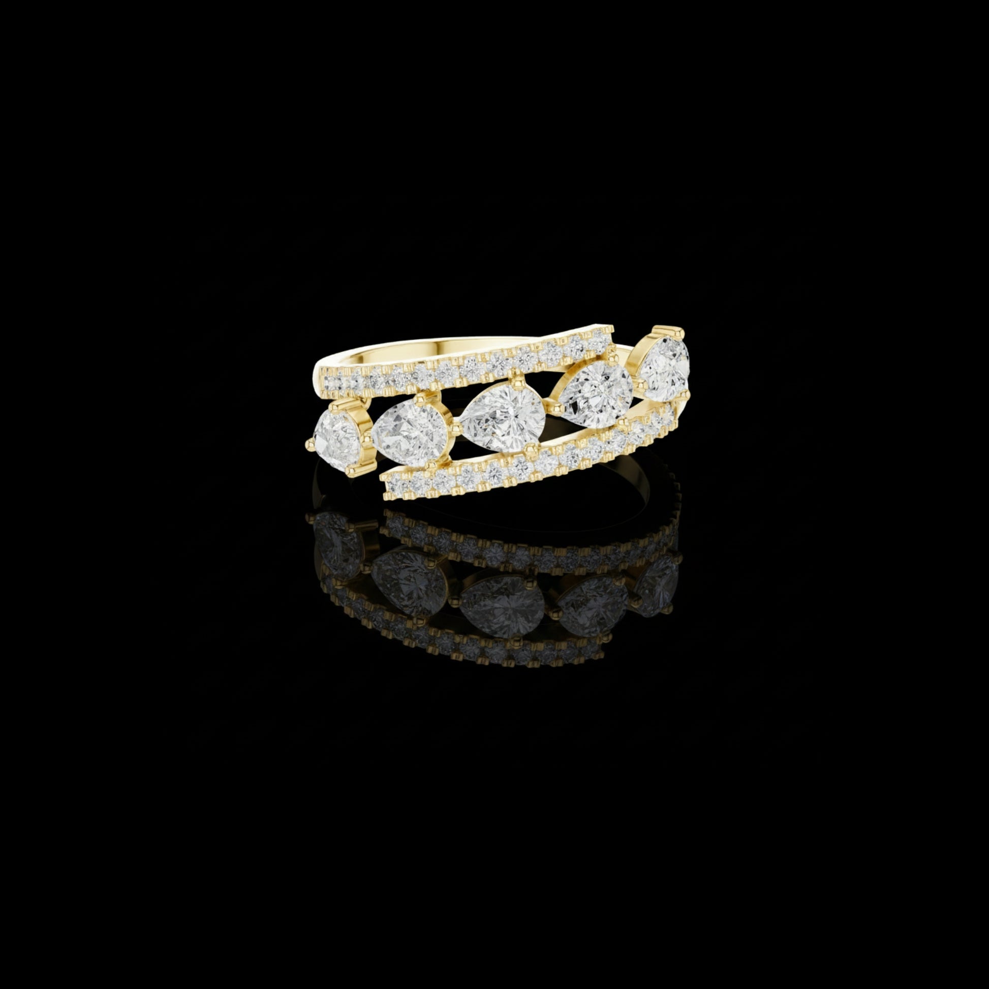 This striking gold band showcases a contemporary floating design with brilliant round diamonds set in individual stations, framed by two elegant pave diamond rails. The layered structure adds depth and dimension, creating a bold yet refined silhouette that sparkles from every angle. Designed for those who appreciate modern craftsmanship and elevated luxury, this ring is perfect as a statement piece, anniversary band, or fashion-forward everyday jewelry.