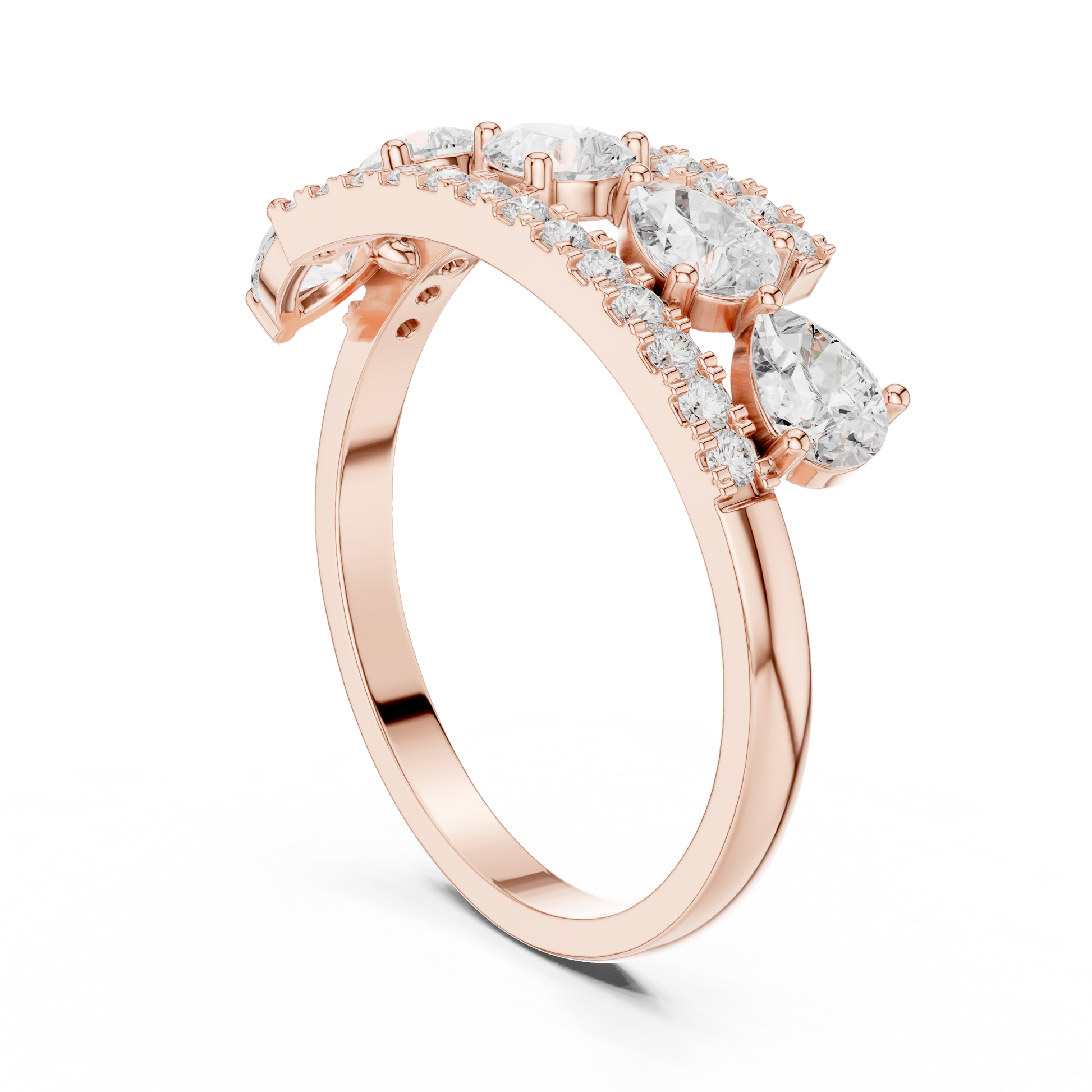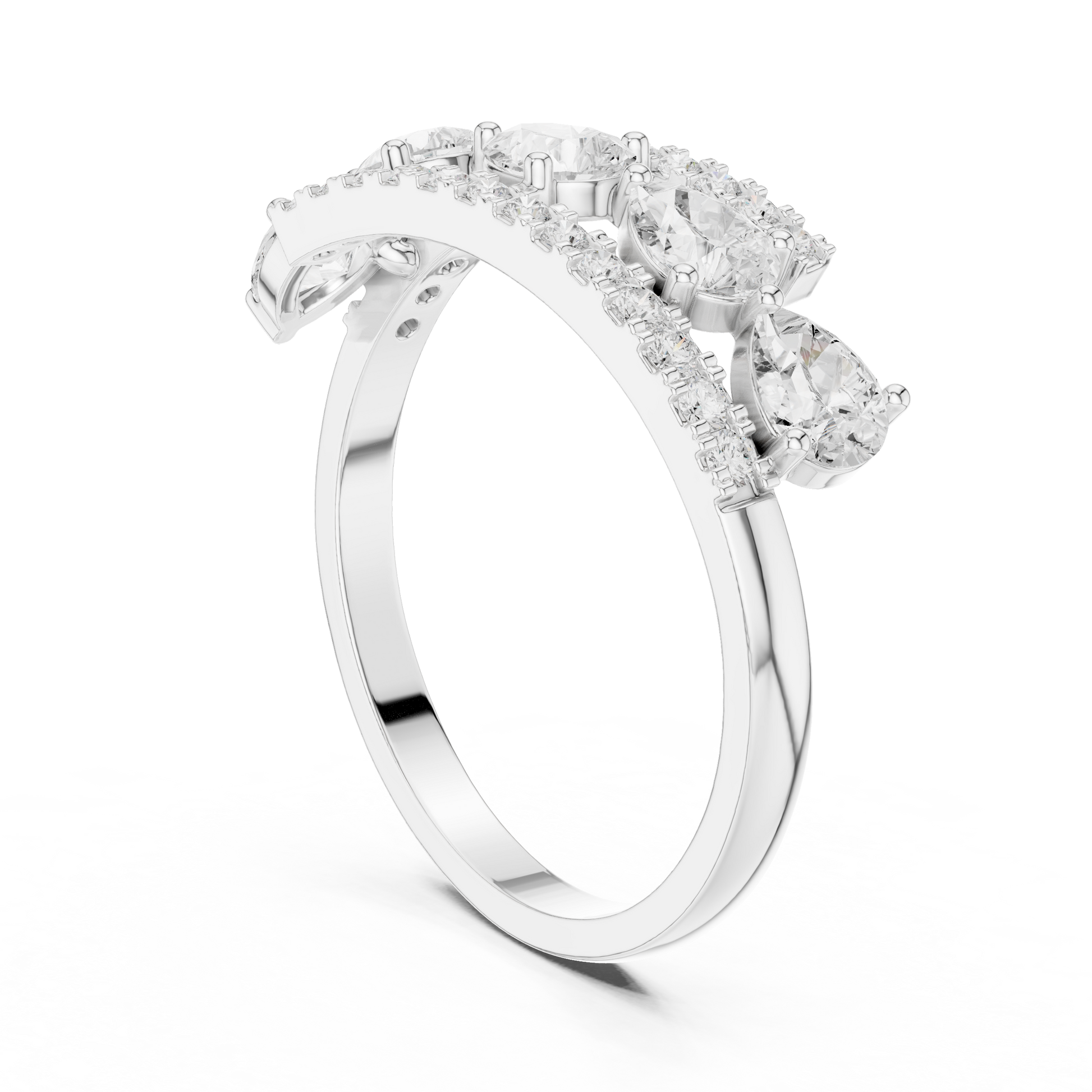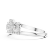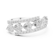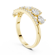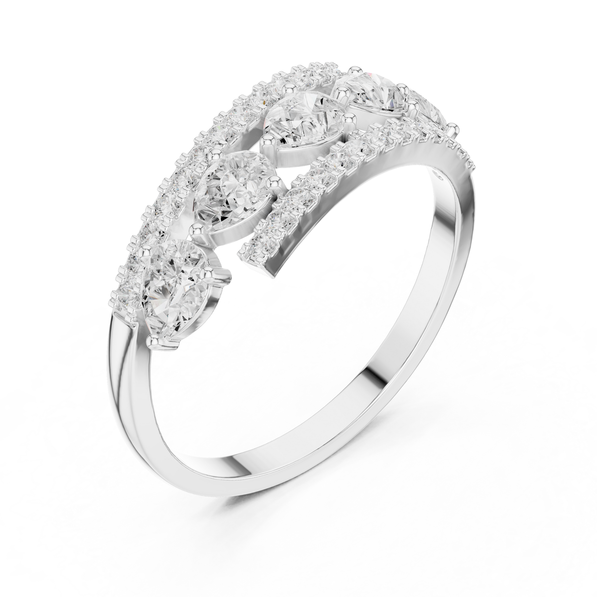 This striking gold band showcases a contemporary floating design with brilliant round diamonds set in individual stations, framed by two elegant pave diamond rails. The layered structure adds depth and dimension, creating a bold yet refined silhouette that sparkles from every angle. Designed for those who appreciate modern craftsmanship and elevated luxury, this ring is perfect as a statement piece, anniversary band, or fashion-forward everyday jewelry.