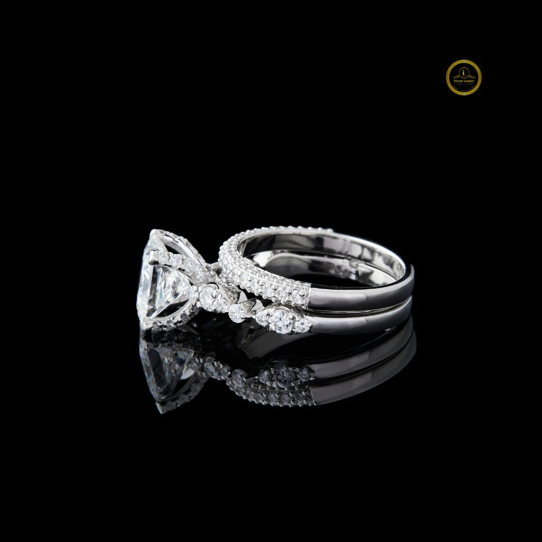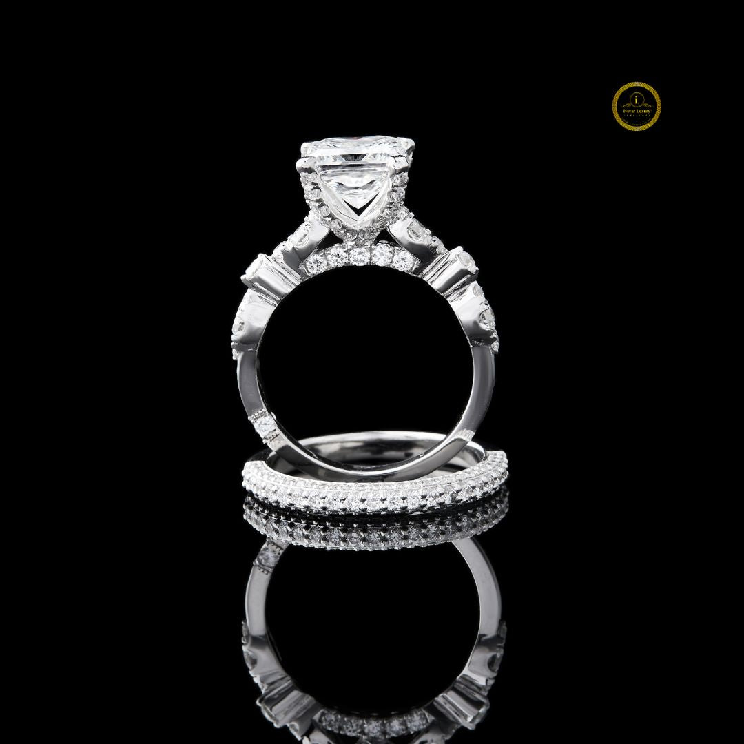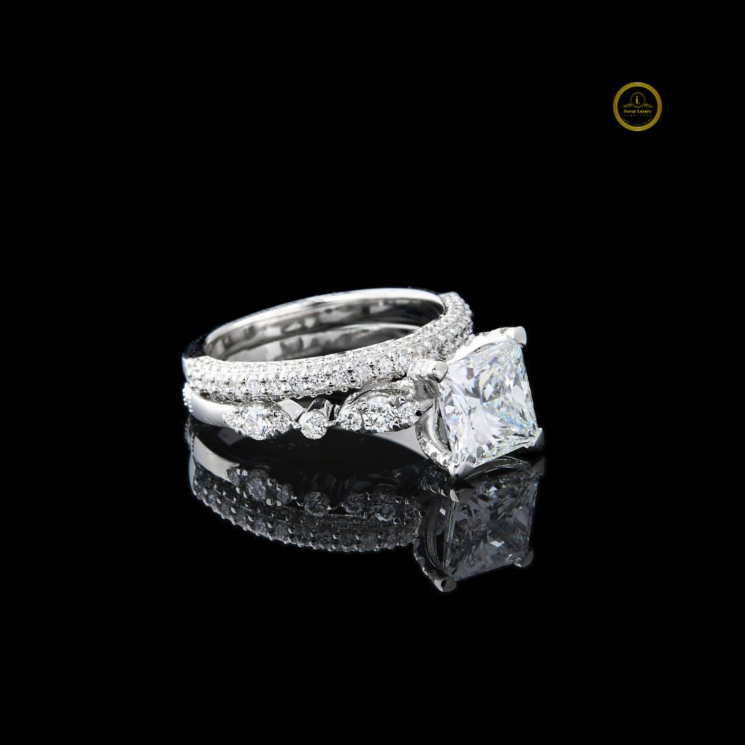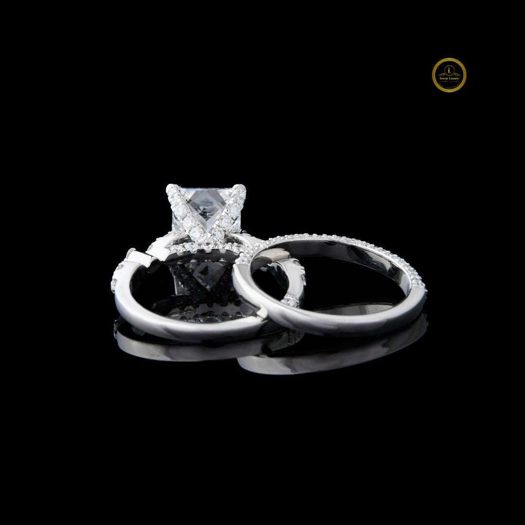Celebrate your love with this luxurious bridal ring set, featuring a breathtaking princess-cut center stone that radiates unmatched brilliance. The engagement ring showcases a bold, square-cut gem held securely by refined prongs, enhancing its sparkling clarity and modern elegance. Complementing it is a graceful matching band adorned with micro-pave crystals, adding a continuous line of dazzling shimmer. Together, they create a harmonious blend of sophistication, romance, and classic beauty.