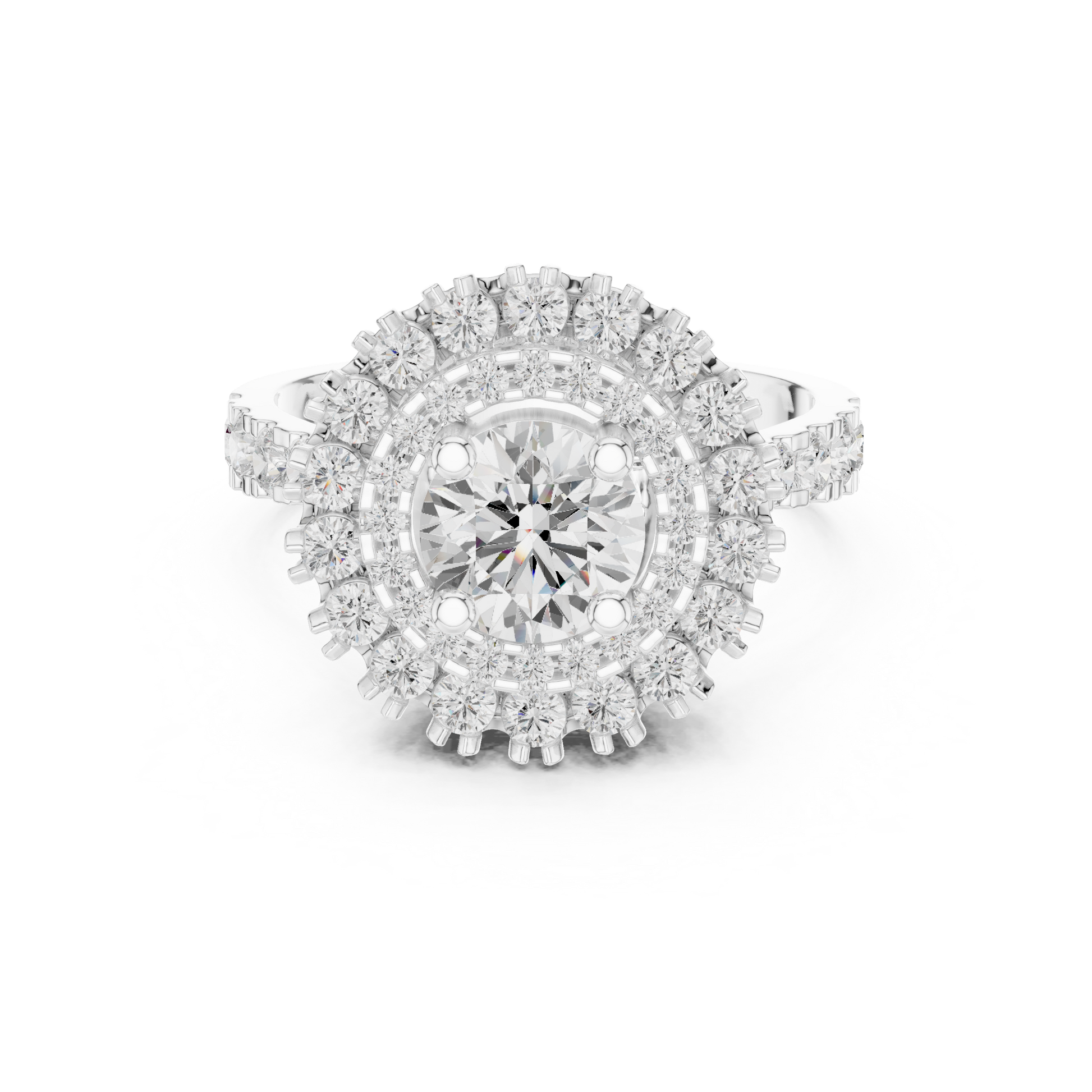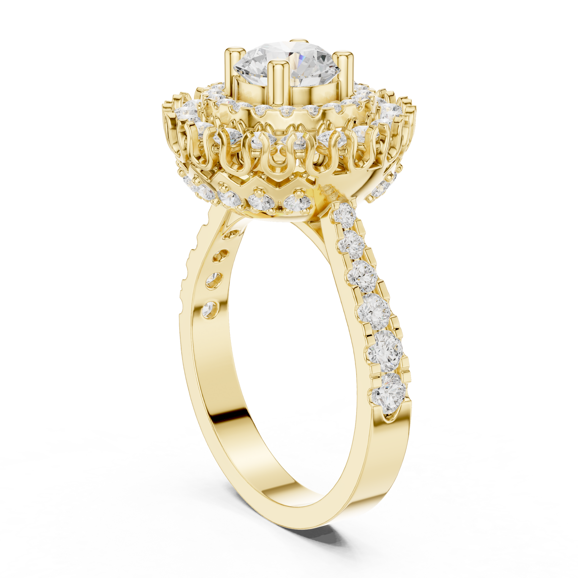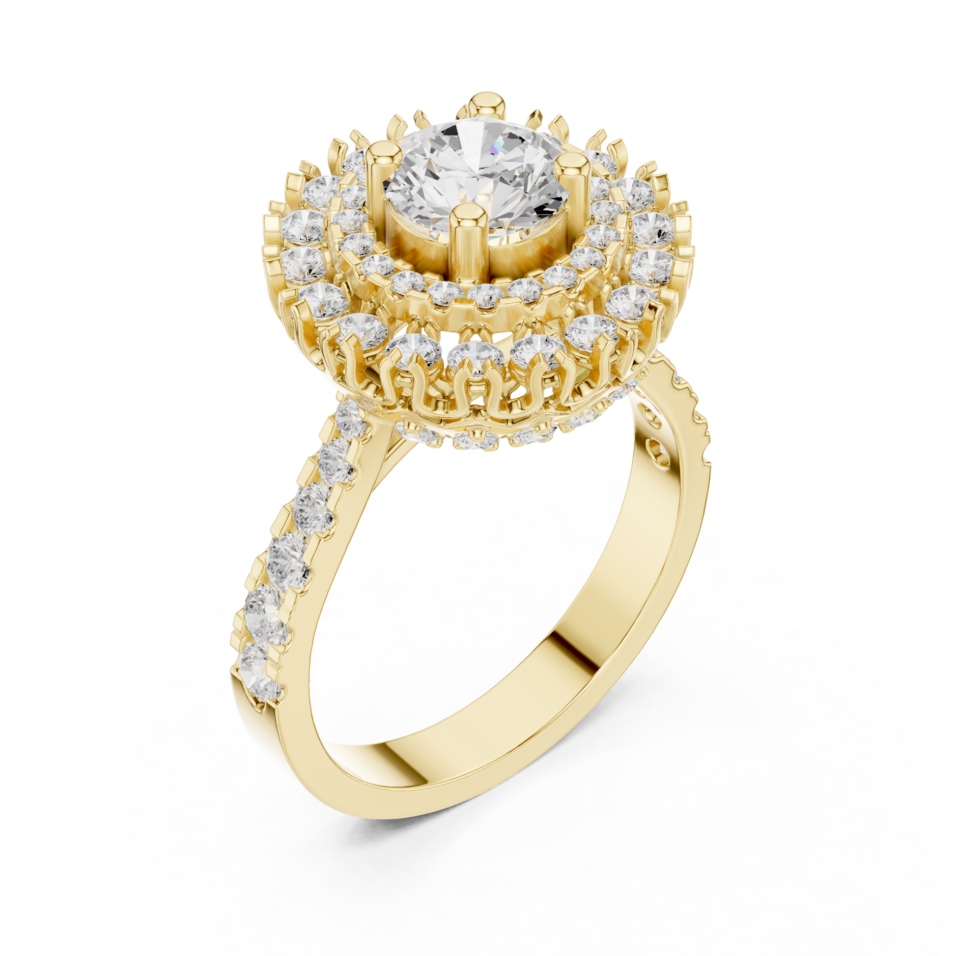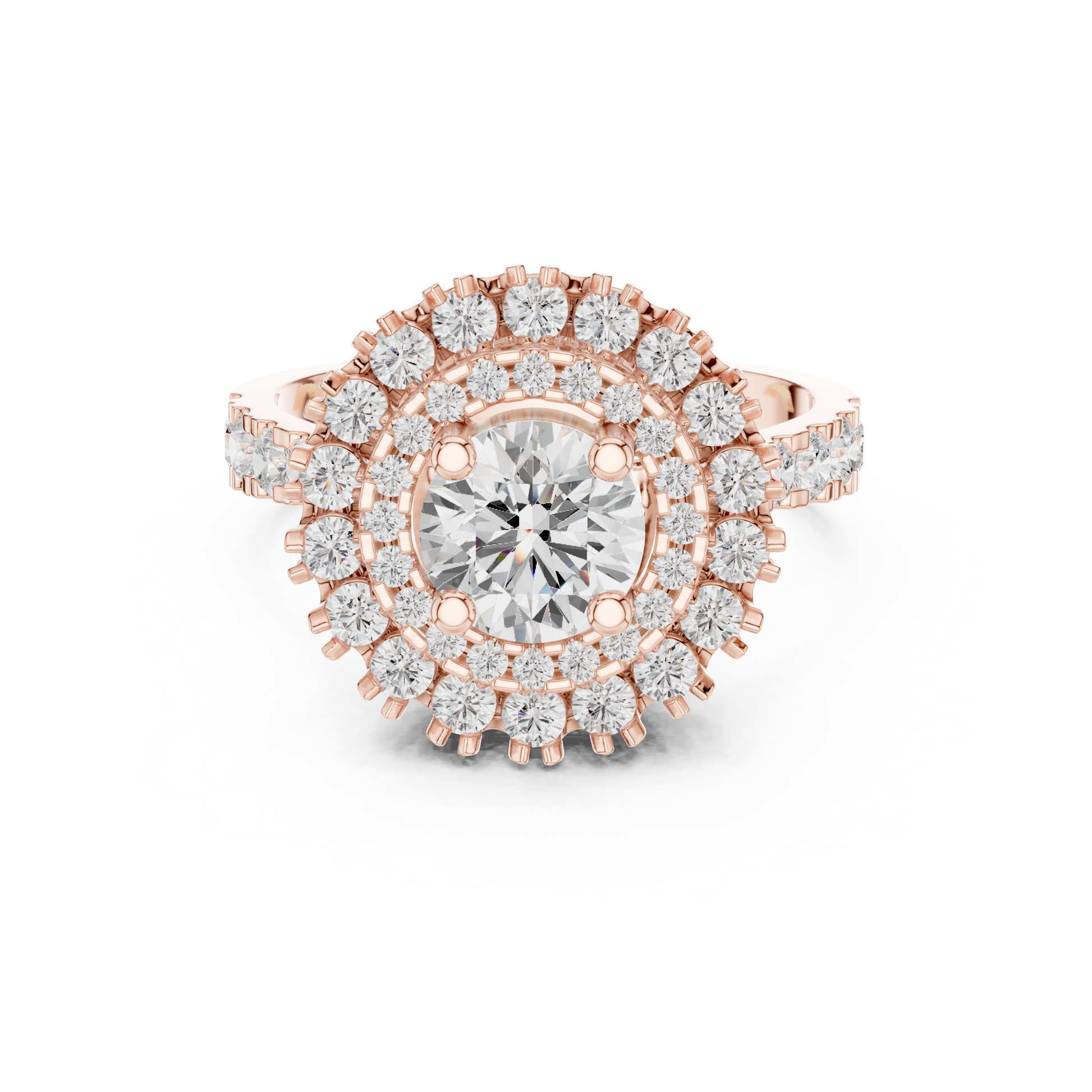 Bold brilliance meets refined craftsmanship in this stunning round diamond ring. A luminous round center stone is surrounded by a dramatic double halo, creating a radiant crown effect that amplifies sparkle from every angle. The pave set split shank adds depth and elegance, while the warm gold setting enhances the brilliance of each diamond. Designed to stand out, this ring is perfect for those who desire a statement engagement ring or a luxurious symbol of lasting love.