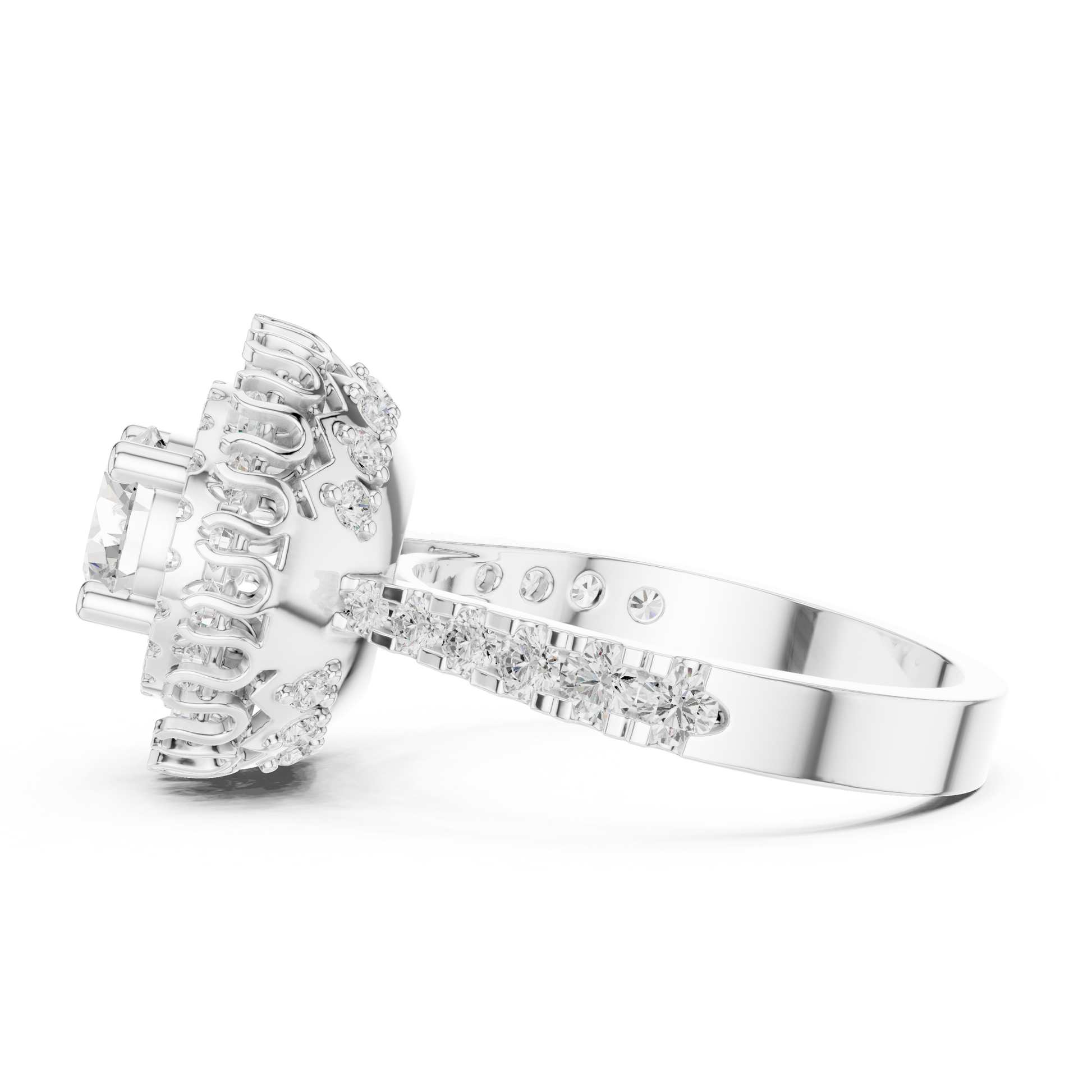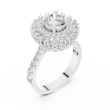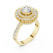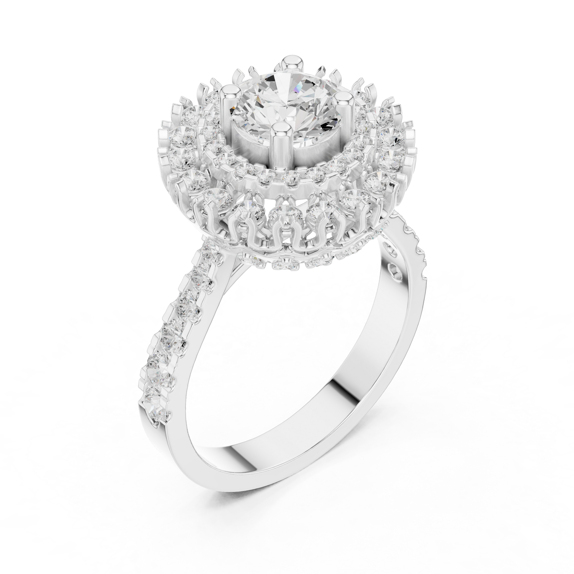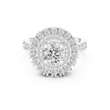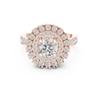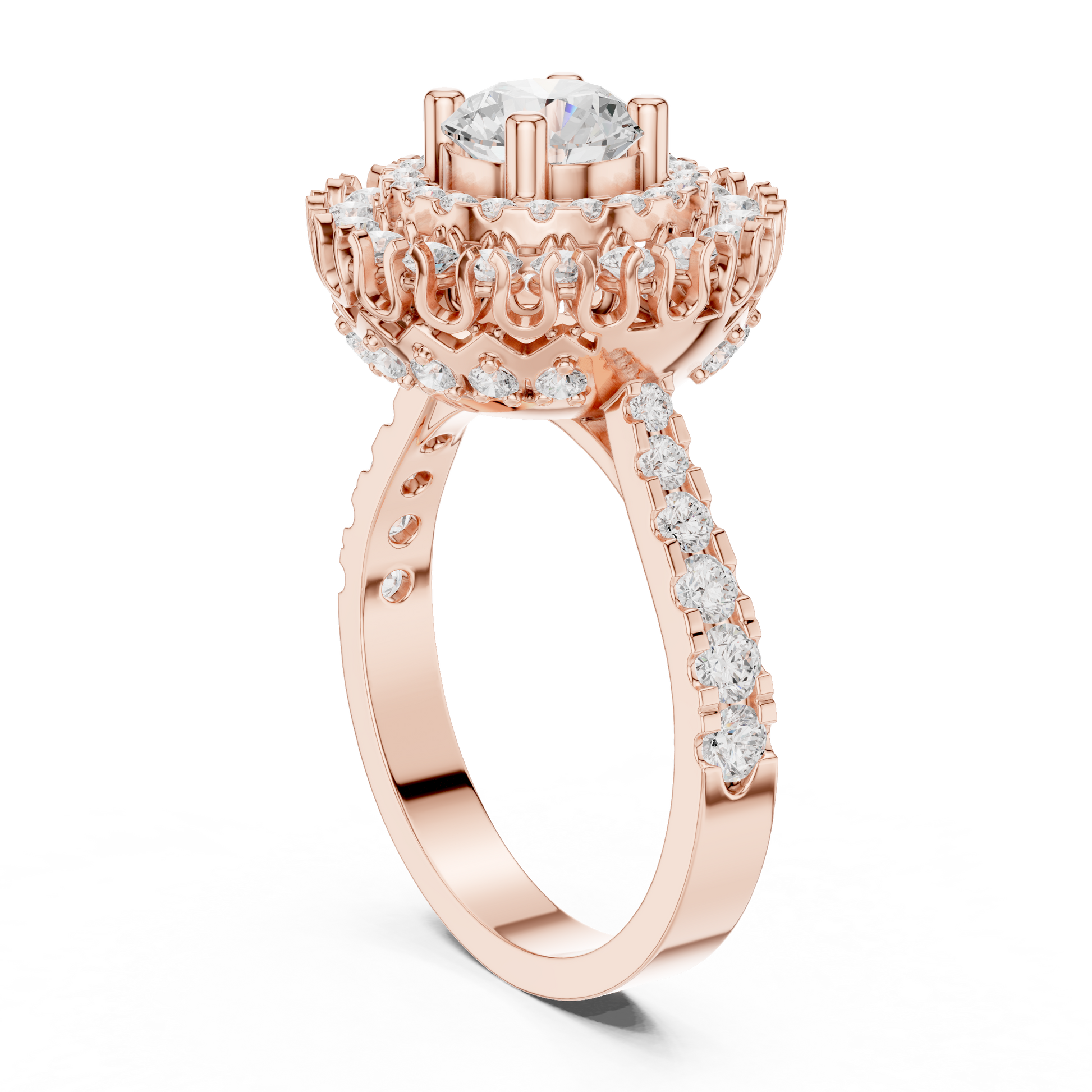 Bold brilliance meets refined craftsmanship in this stunning round diamond ring. A luminous round center stone is surrounded by a dramatic double halo, creating a radiant crown effect that amplifies sparkle from every angle. The pave set split shank adds depth and elegance, while the warm gold setting enhances the brilliance of each diamond. Designed to stand out, this ring is perfect for those who desire a statement engagement ring or a luxurious symbol of lasting love.