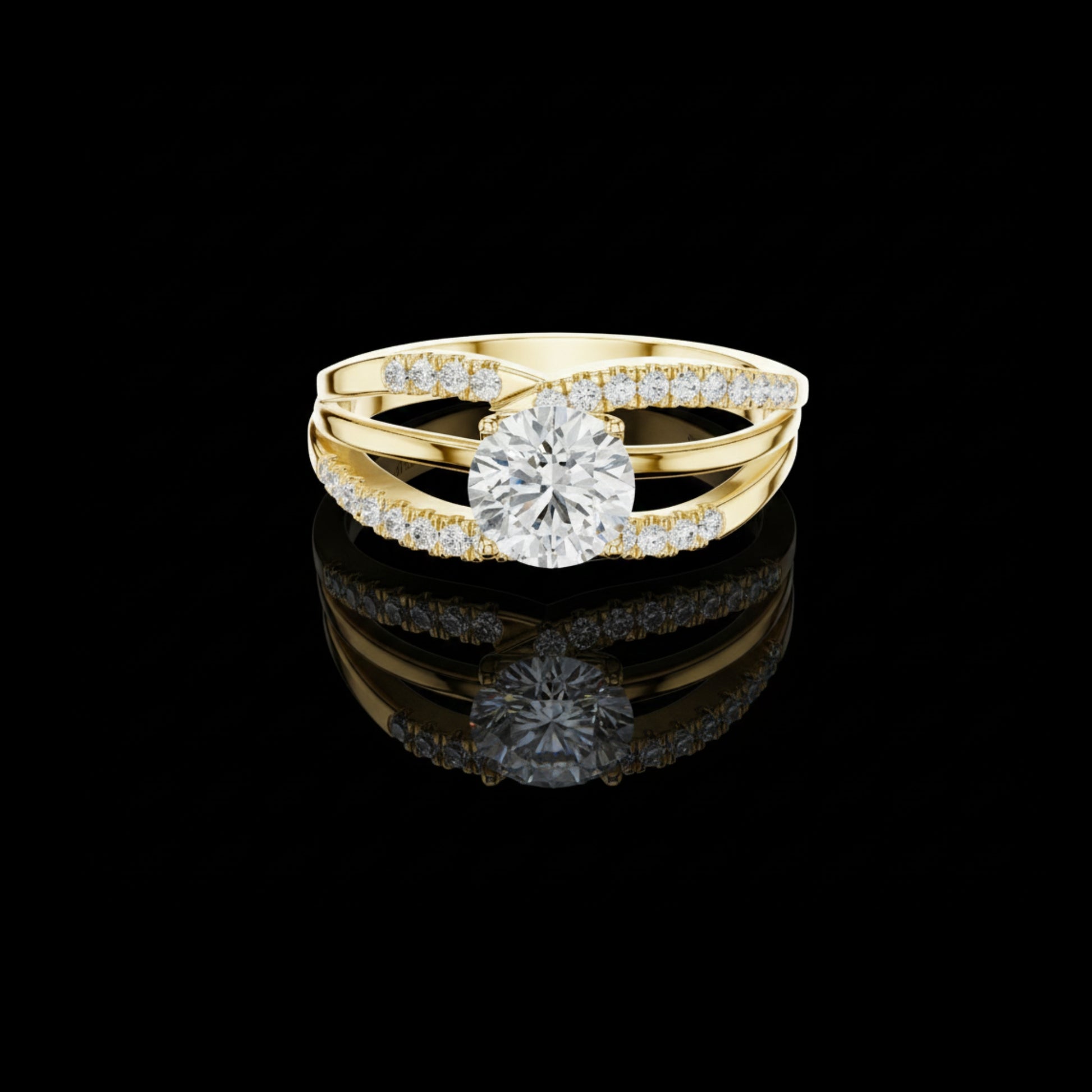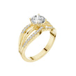 This stunning engagement ring features a brilliant round-cut center stone set atop a beautifully sculpted split-shank band. The double-layered gold band is adorned with shimmering pave diamonds, creating an elegant blend of sparkle, symmetry, and sophistication. Designed to catch light from every angle, this modern yet timeless ring makes a perfect statement for those who love bold brilliance and refined craftsmanship.