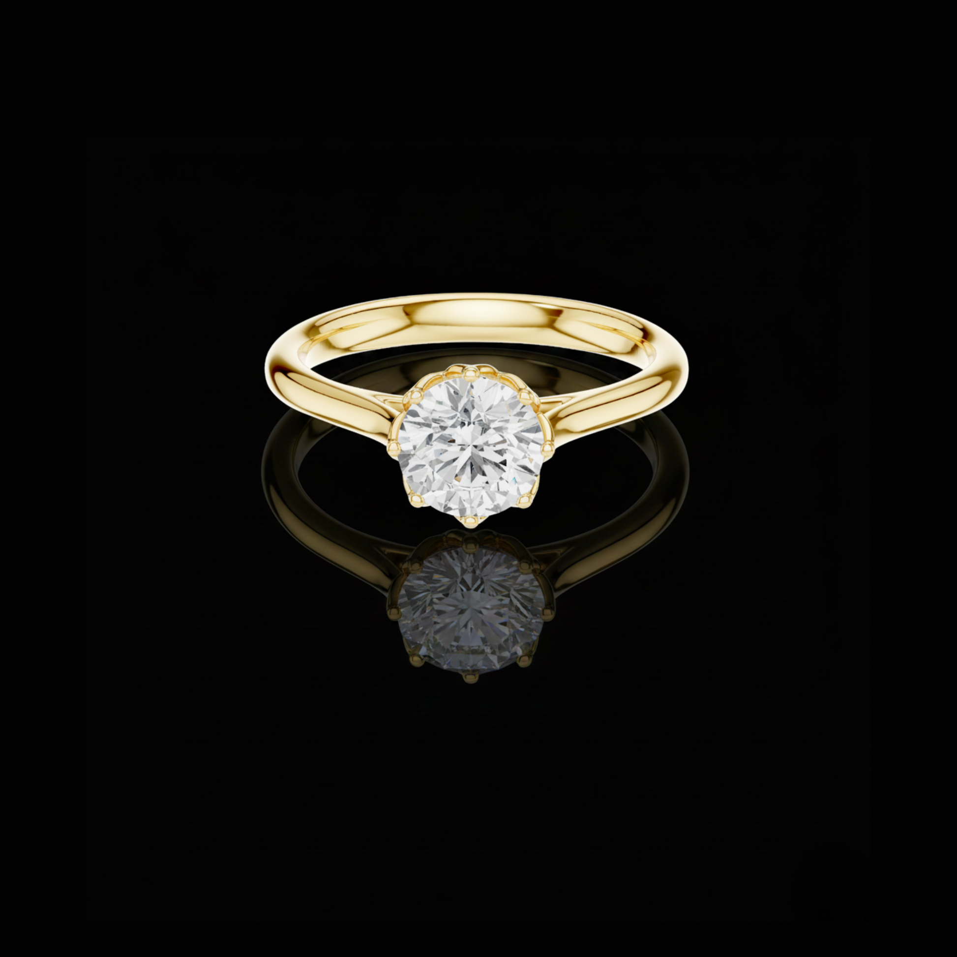 Experience the exquisite beauty of this floral-inspired solitaire engagement ring crafted in radiant gold by Ivevar Luxury. The design features a breathtaking round brilliant-cut center stone held securely by a daisy-petal crown setting, giving the ring a romantic and timeless botanical elegance. Its high-polish gold band, combined with the intricate flower basket design, creates a perfect harmony of sophistication and femininity.