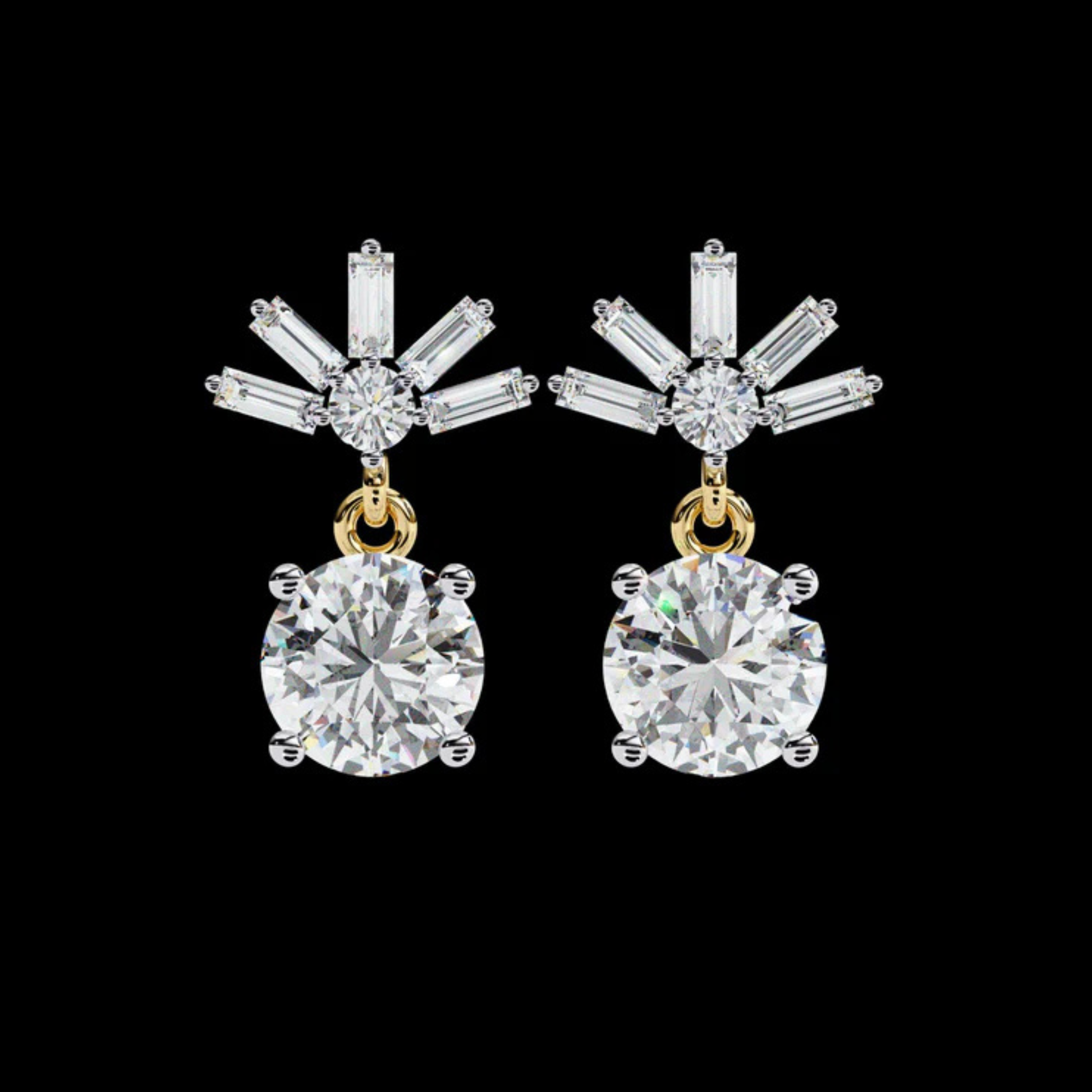 Embodying a perfect fusion of modern geometry and timeless sparkle, the Radiant Sunburst Diamond Drop Earrings in Gold are a true expression of refined brilliance. Each earring showcases a captivating array of baguette and round-cut diamonds arranged in a radiant sunburst design, delicately suspending a large round brilliant solitaire that captures and reflects light from every angle, making these earrings ideal for both red-carpet occasions and elegant evenings out.