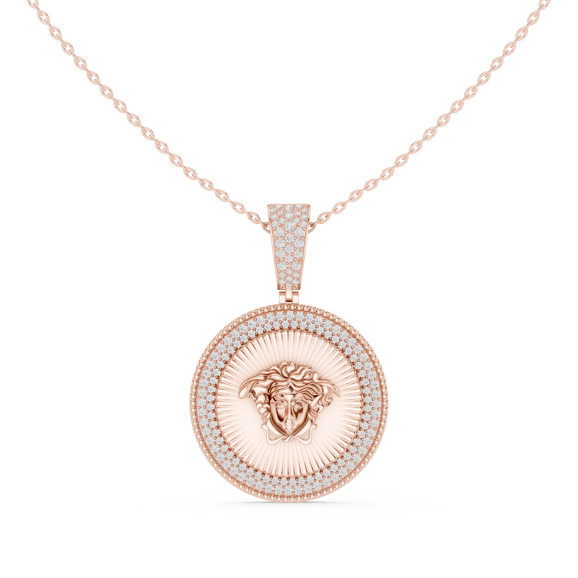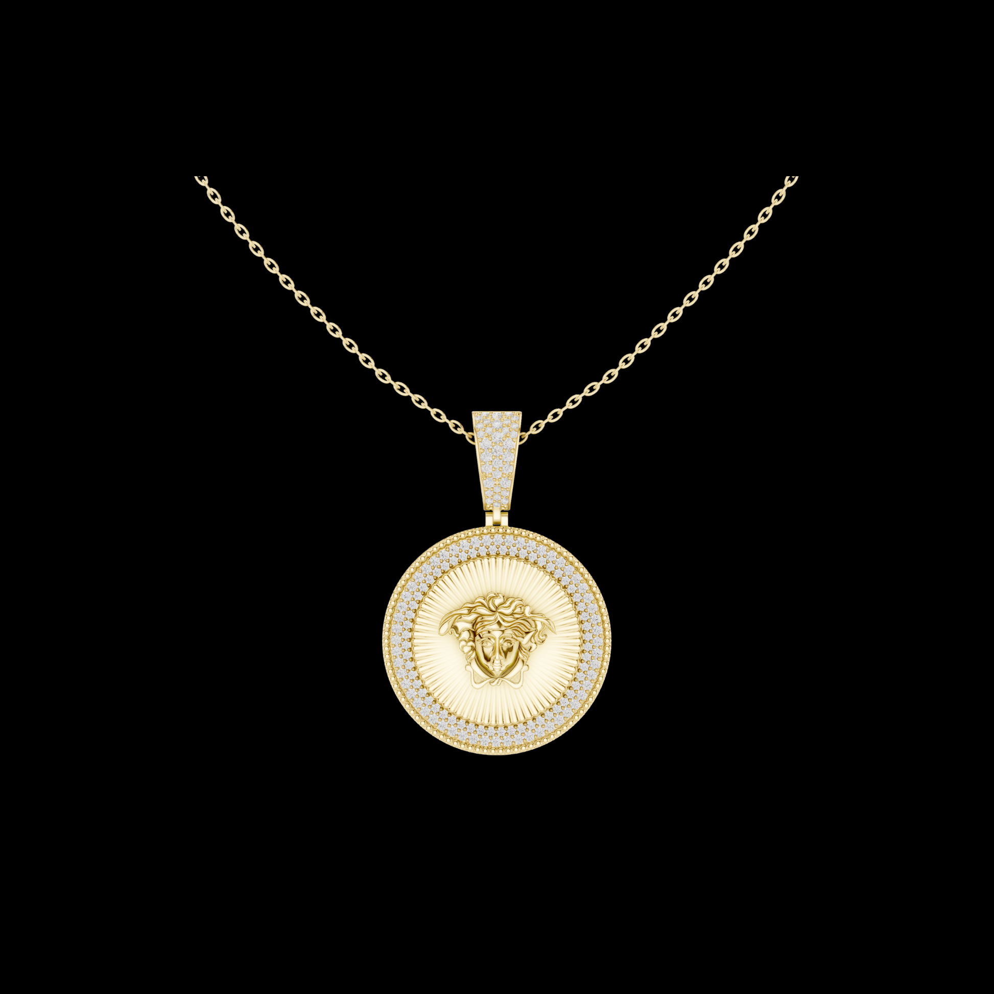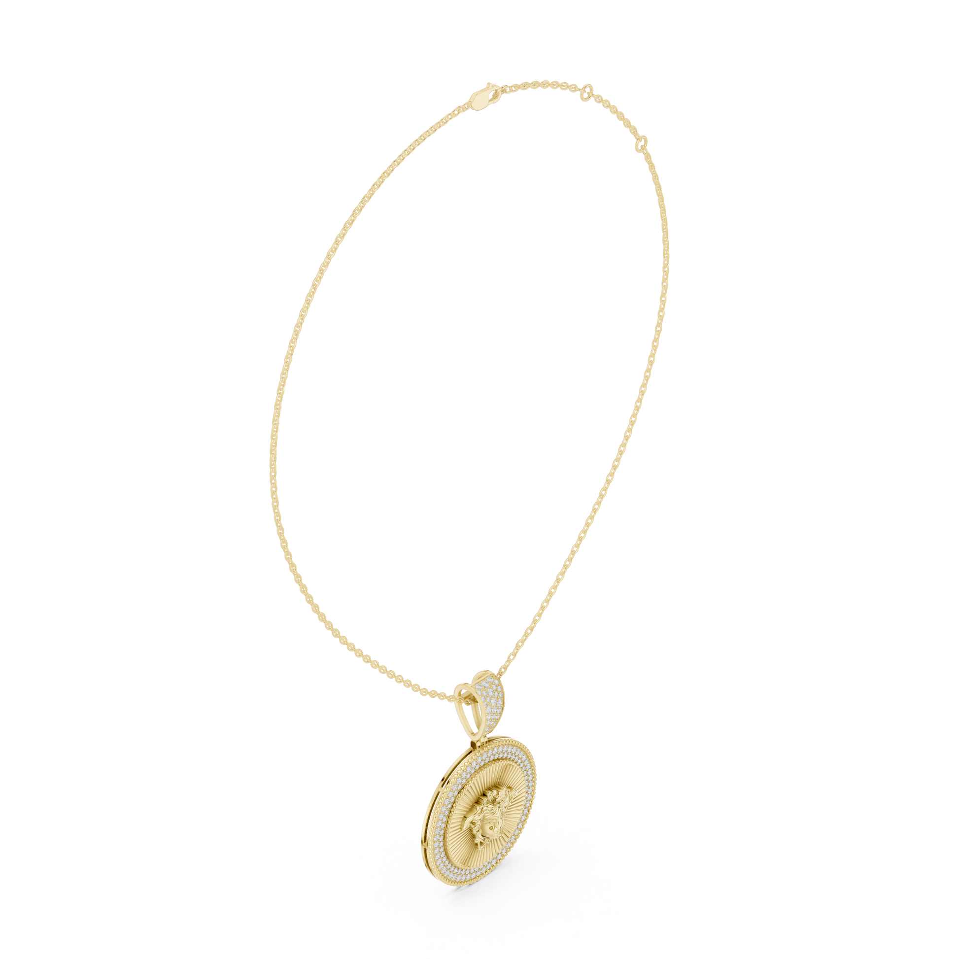 This exquisite Medusa face pendant is a bold expression of power and elegance, crafted in radiant gold with a detailed Medusa face at the center and a shimmering diamond border. The round medallion design features intricate texture work and a polished finish, giving it a striking luxury appeal from every angle. The diamond-studded bail and sturdy gold chain enhance both durability and brilliance, making it perfect for statement styling.