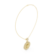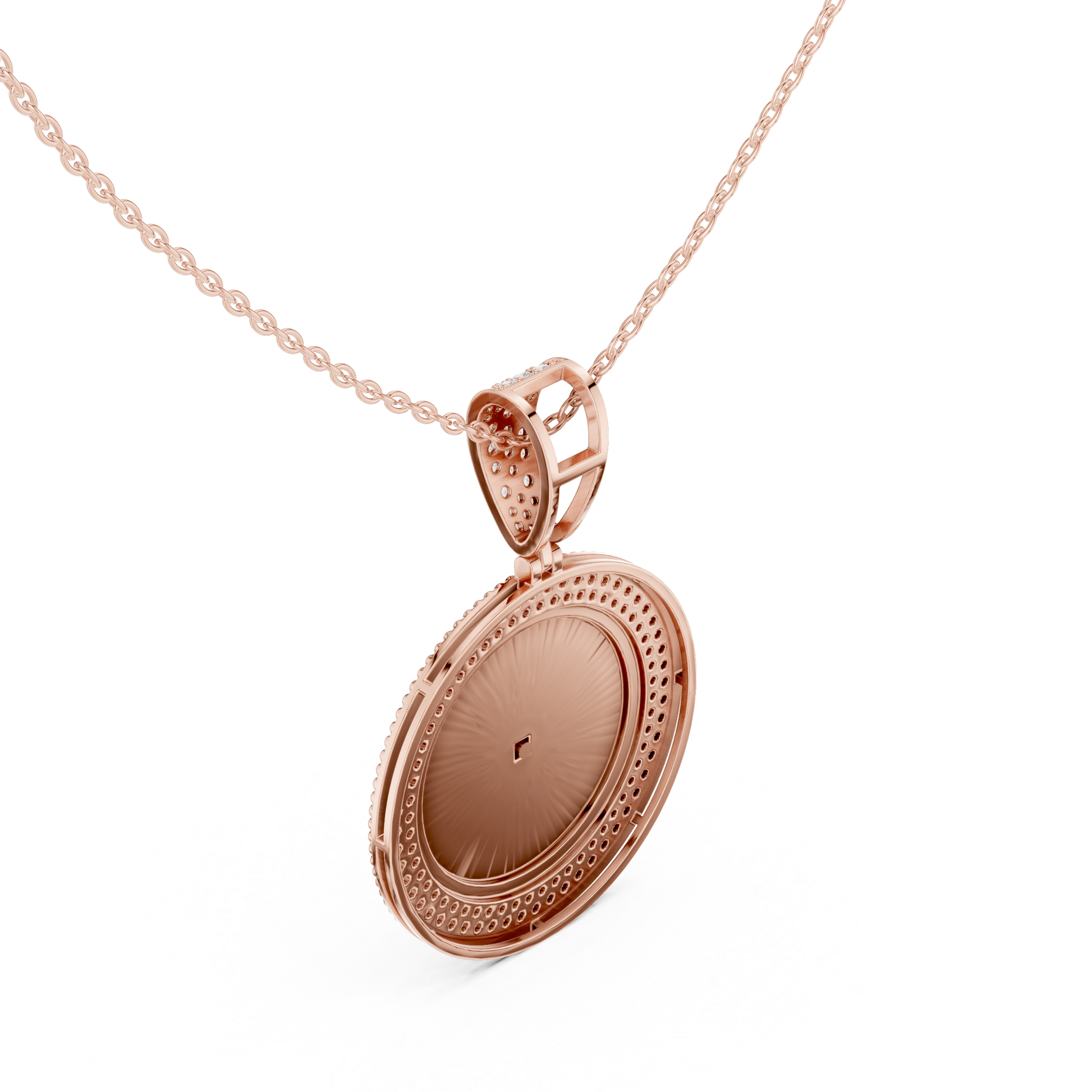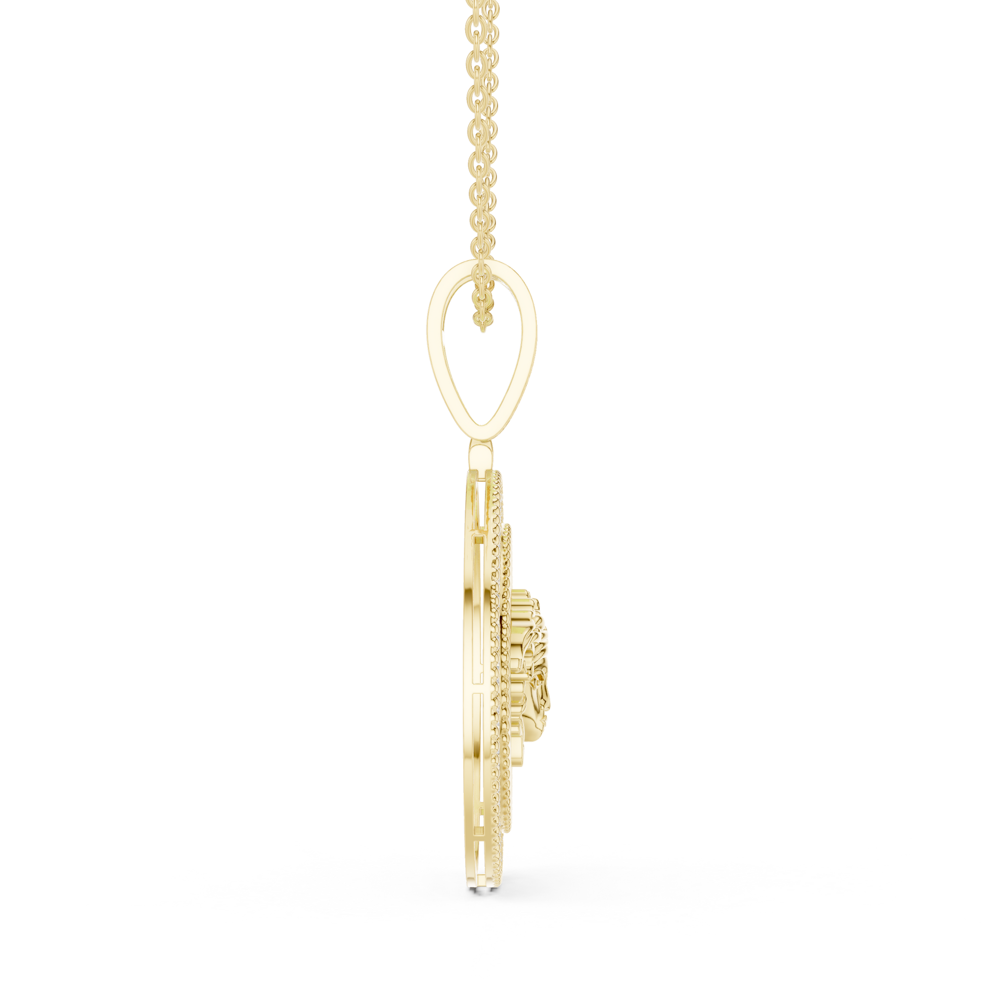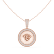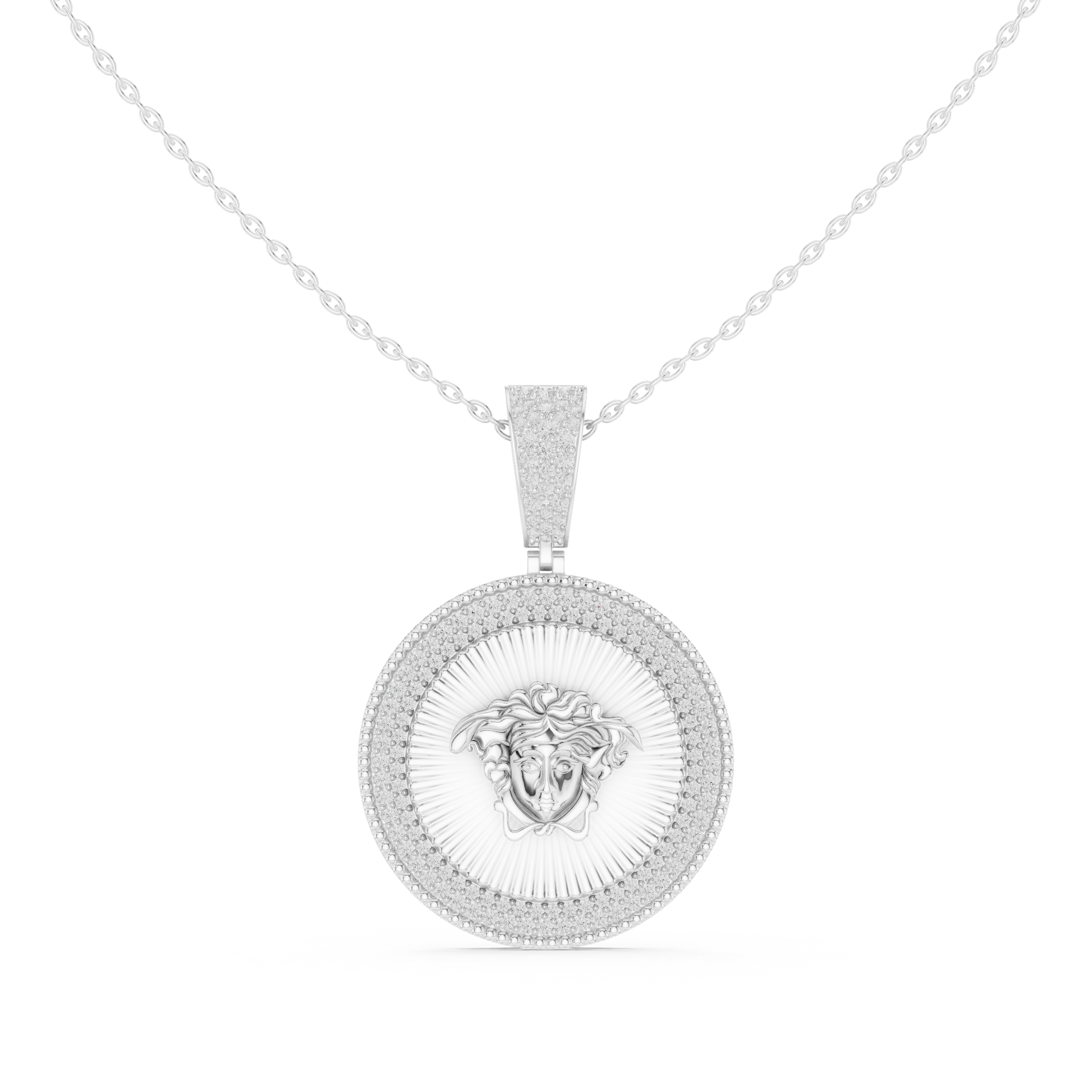 This exquisite Medusa face pendant is a bold expression of power and elegance, crafted in radiant gold with a detailed Medusa face at the center and a shimmering diamond border. The round medallion design features intricate texture work and a polished finish, giving it a striking luxury appeal from every angle. The diamond-studded bail and sturdy gold chain enhance both durability and brilliance, making it perfect for statement styling.