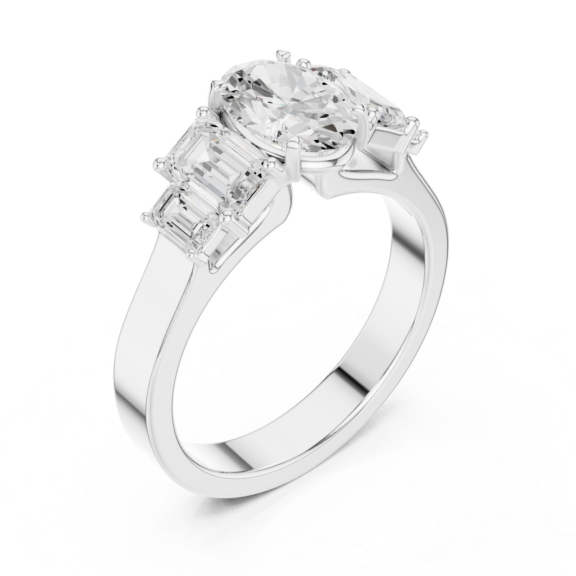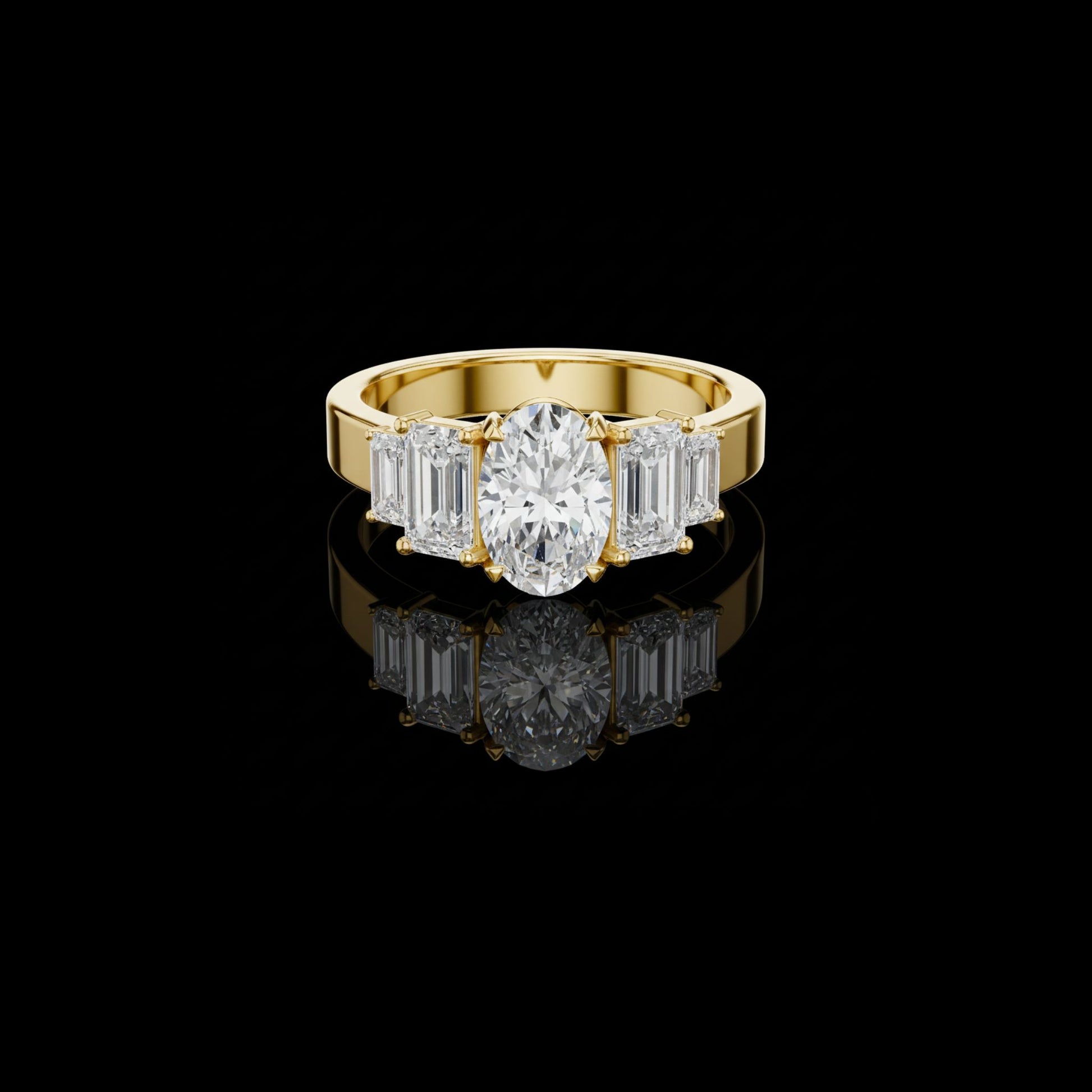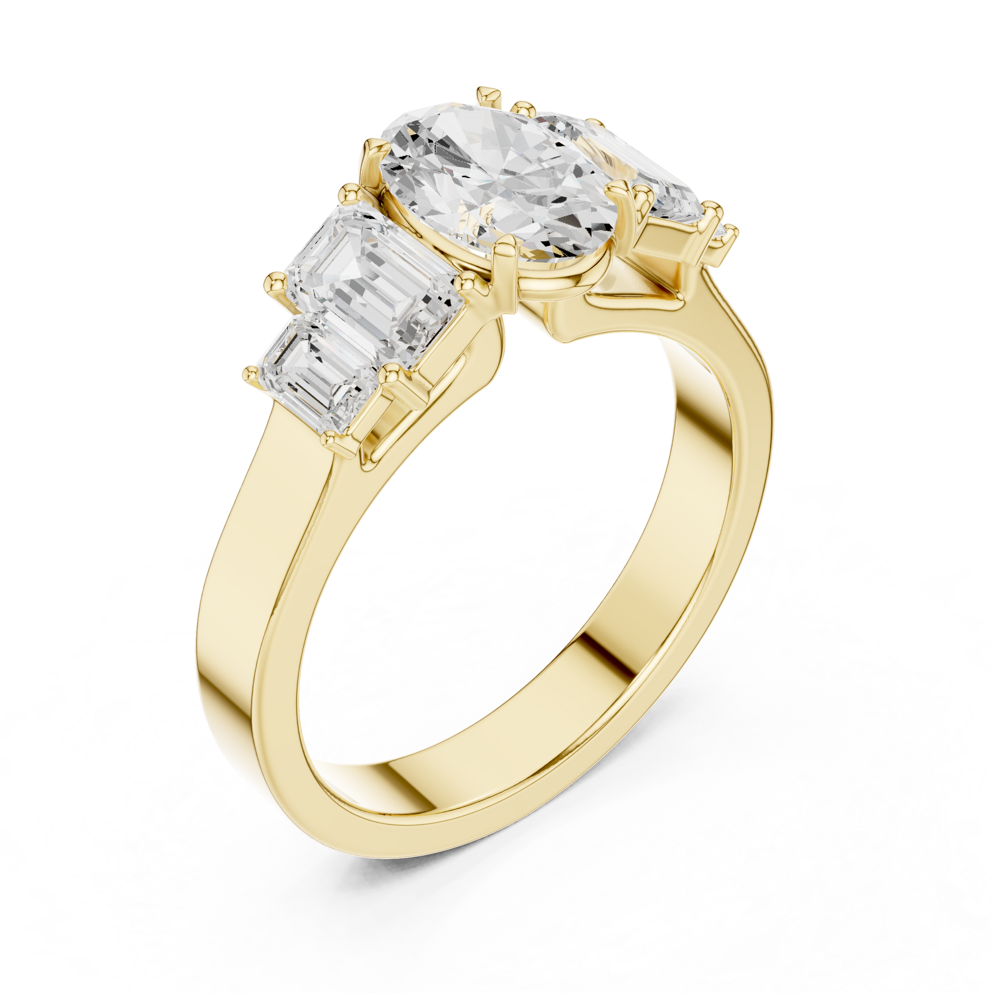 This luxurious ring highlights a brilliant Oval-Cut Center Diamond paired with four elegant Emerald-Cut Side Diamonds, creating a bold and radiant five-stone masterpiece. Set in premium Gold, the design balances modern symmetry with timeless sophistication. Perfect for those who desire maximum sparkle and a statement piece that stands out with every glance.