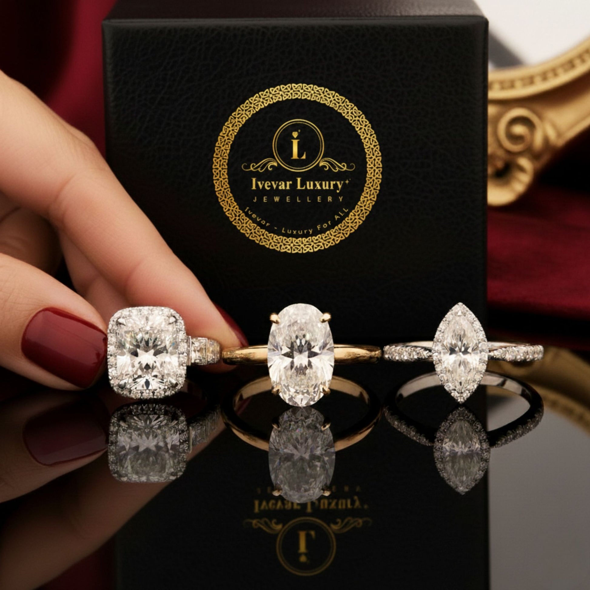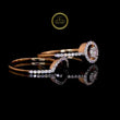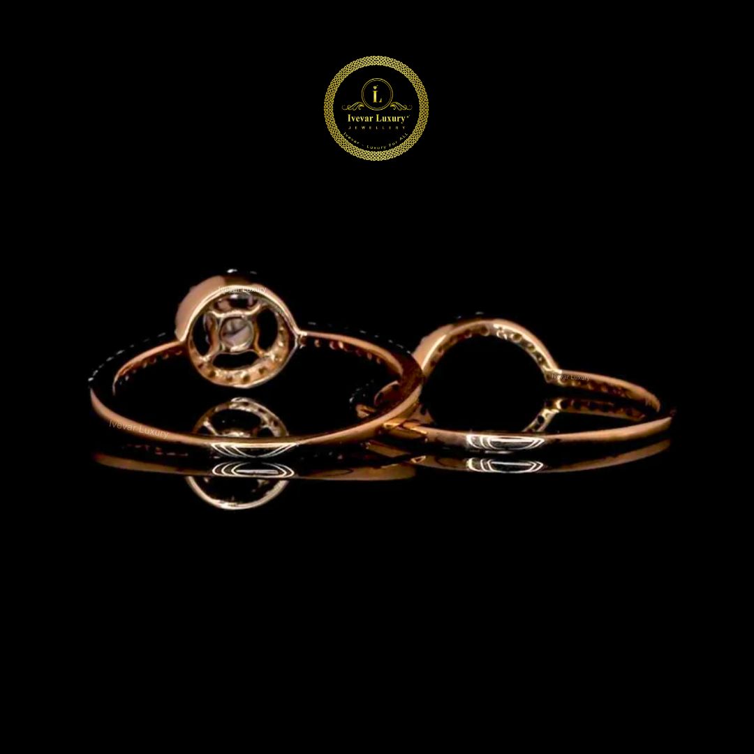 This stunning image showcases a luxurious two-piece diamond bridal set, likely crafted in rose gold. The featured piece is a round brilliant engagement ring with a prominent center stone surrounded by a dazzling halo of smaller pavé-set diamonds, enhancing its sparkle and size. The band is also adorned with diamonds for continuous brilliance. The accompanying piece is a perfectly contoured diamond wedding band designed to nestle snugly against the engagement ring by Ivevar.