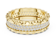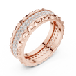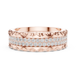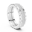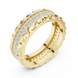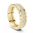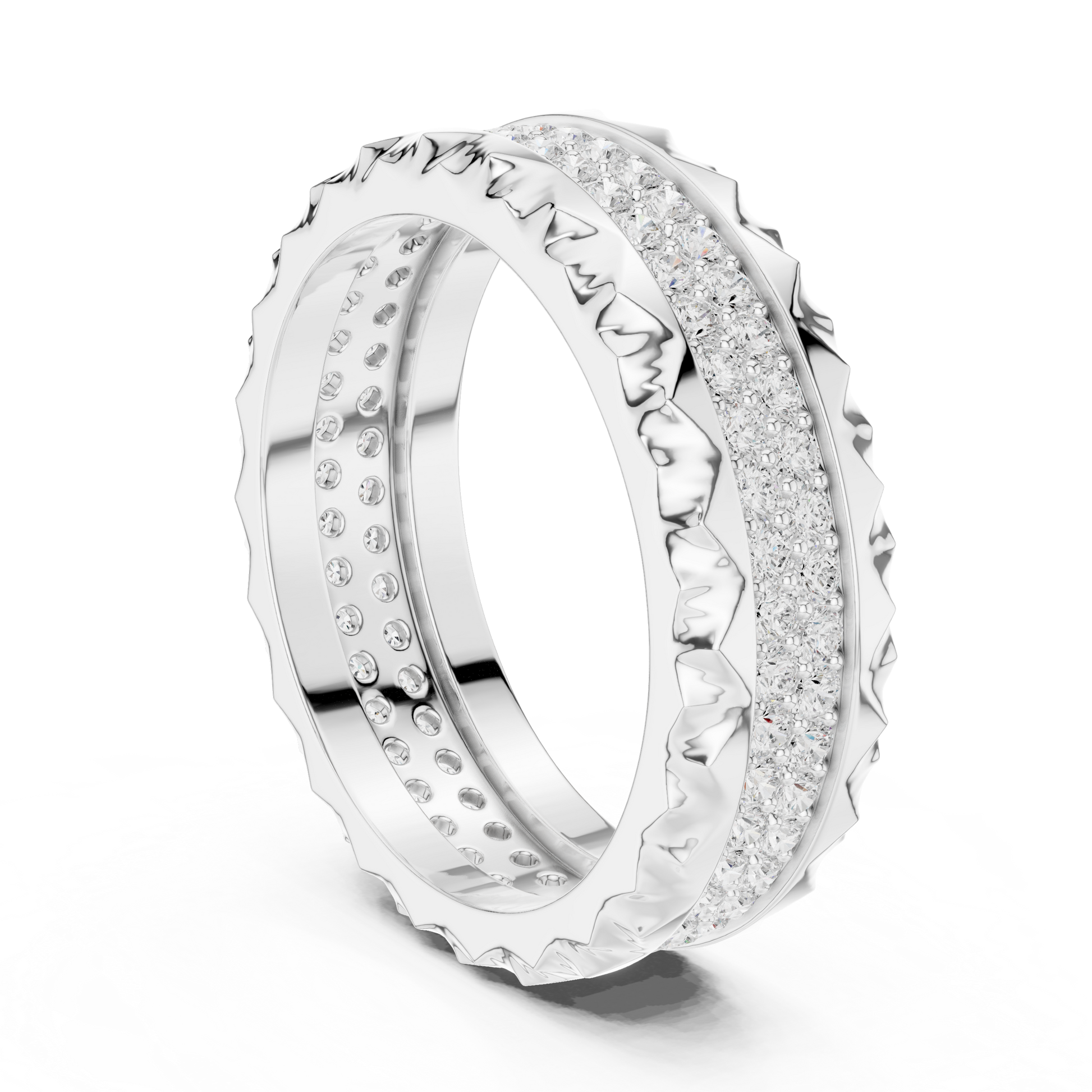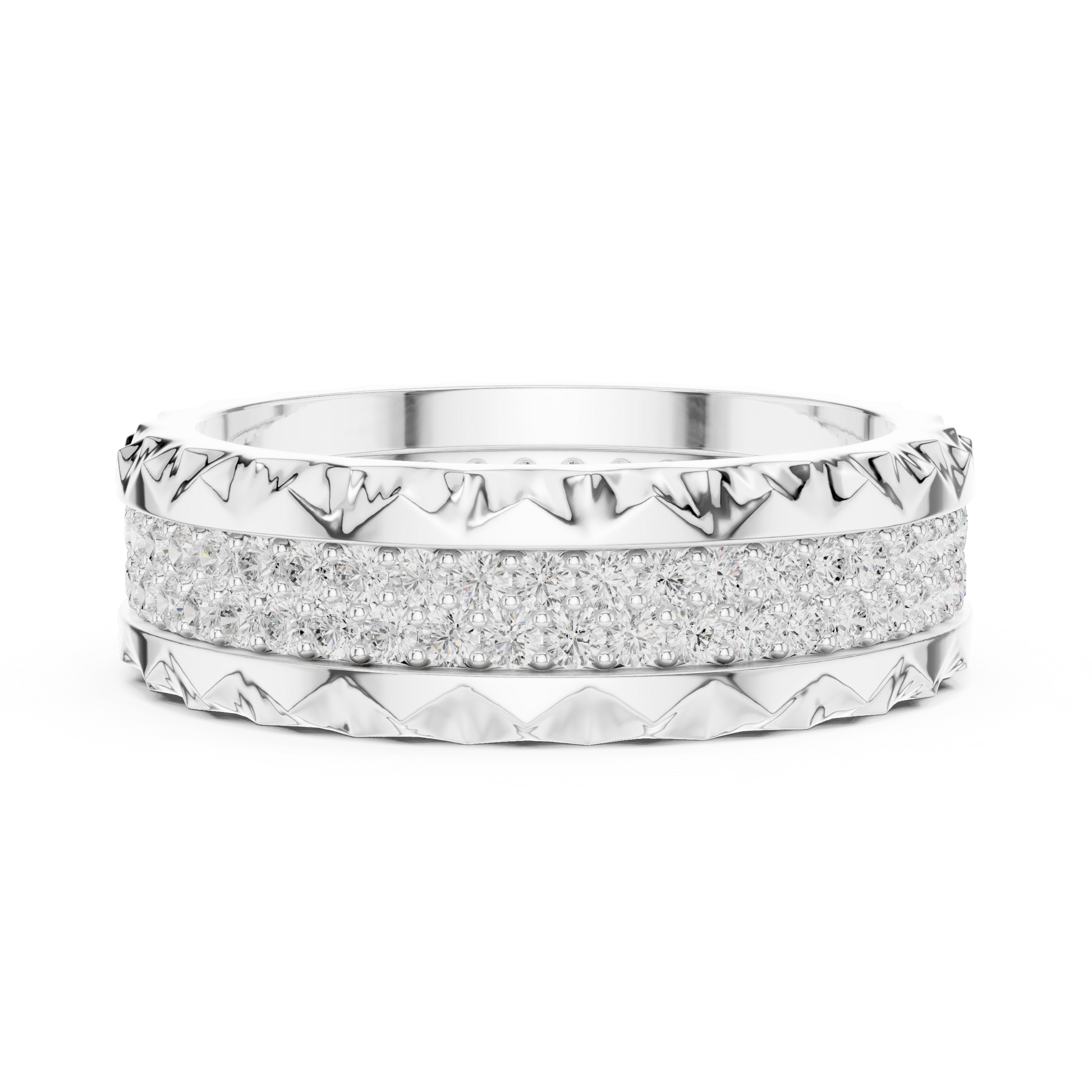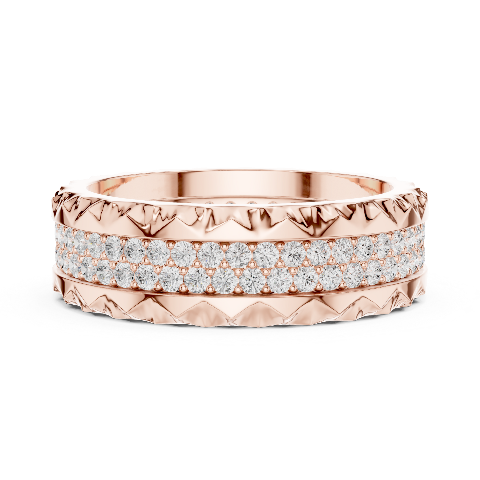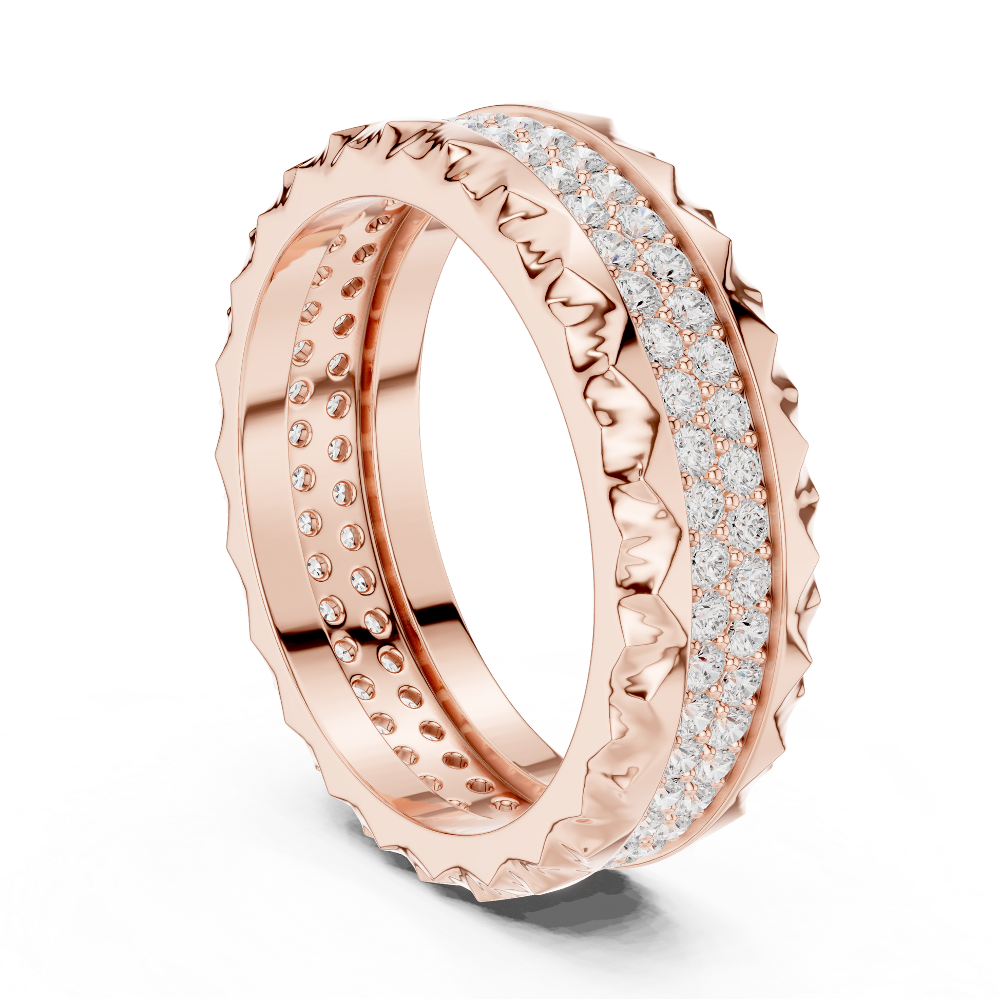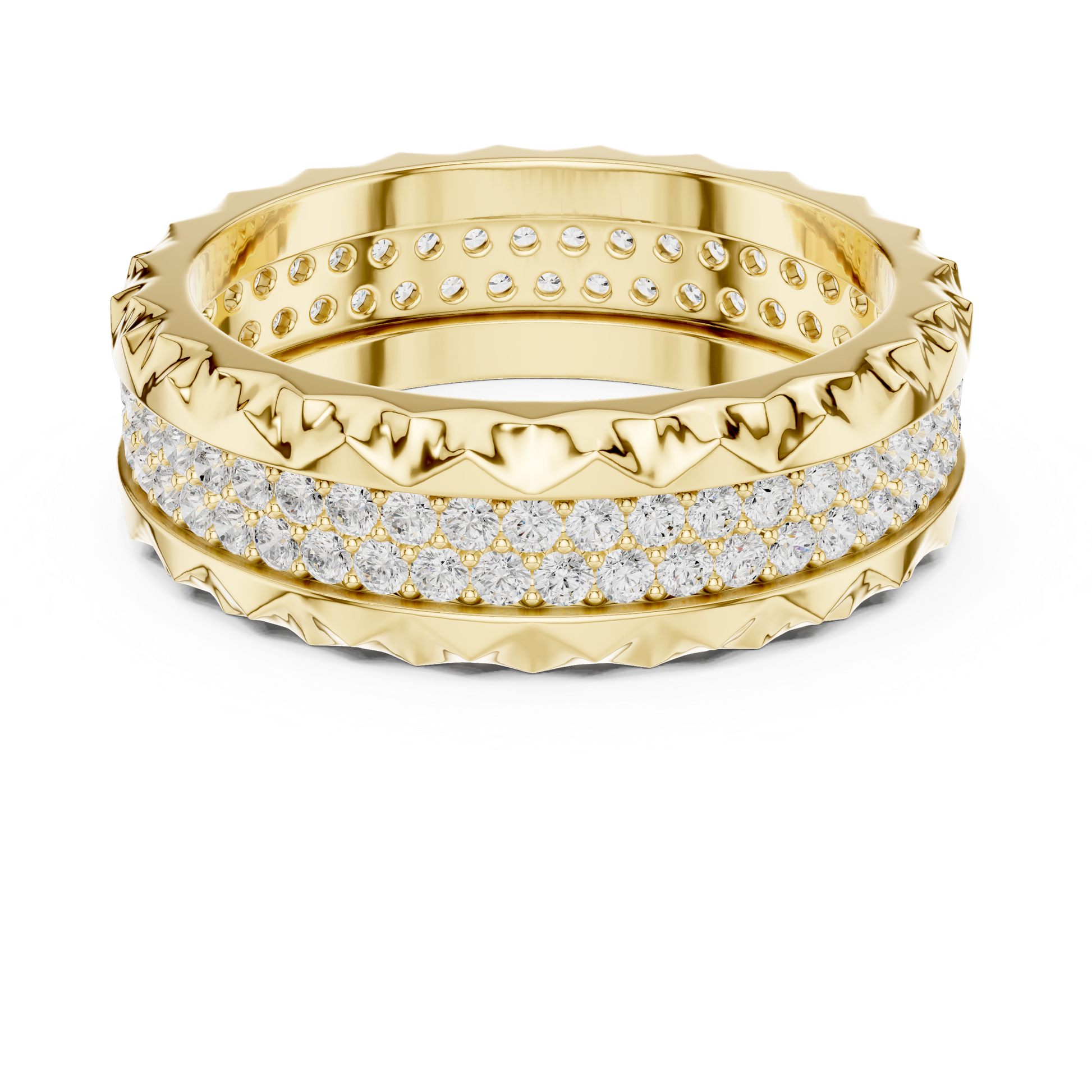 This striking ring features a radiant gold design with a distinctive hand-textured finish along the edges, framing a brilliant central row of pave-set round diamonds. The contrast between the organic, sculpted gold surfaces and the precise sparkle of the diamonds creates a bold yet refined look, while the eternity-style setting ensures continuous brilliance from every angle. Elegant on its own and powerful when stacked, this band blends modern luxury with timeless craftsmanship for a statement that feels both sophisticated and unique.
