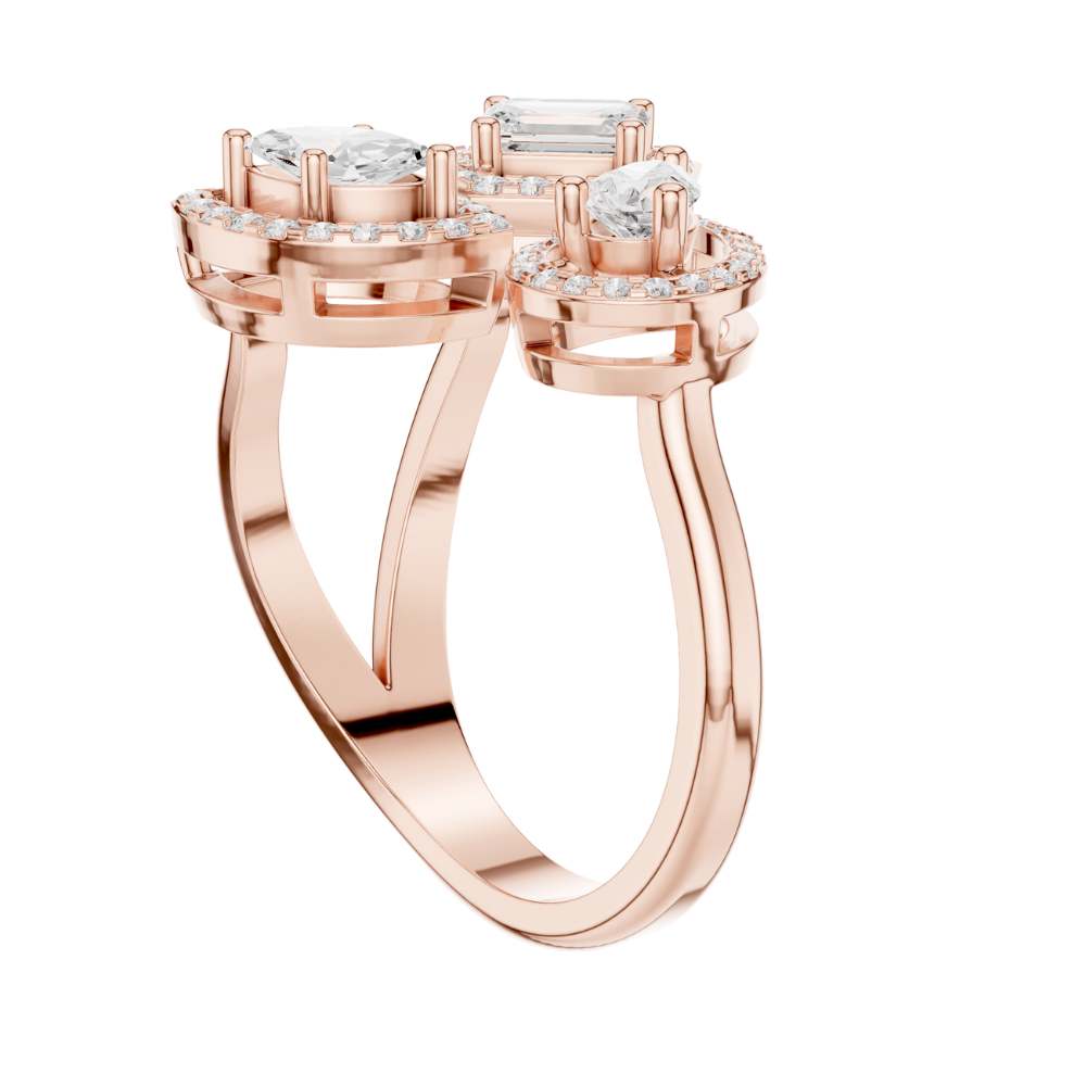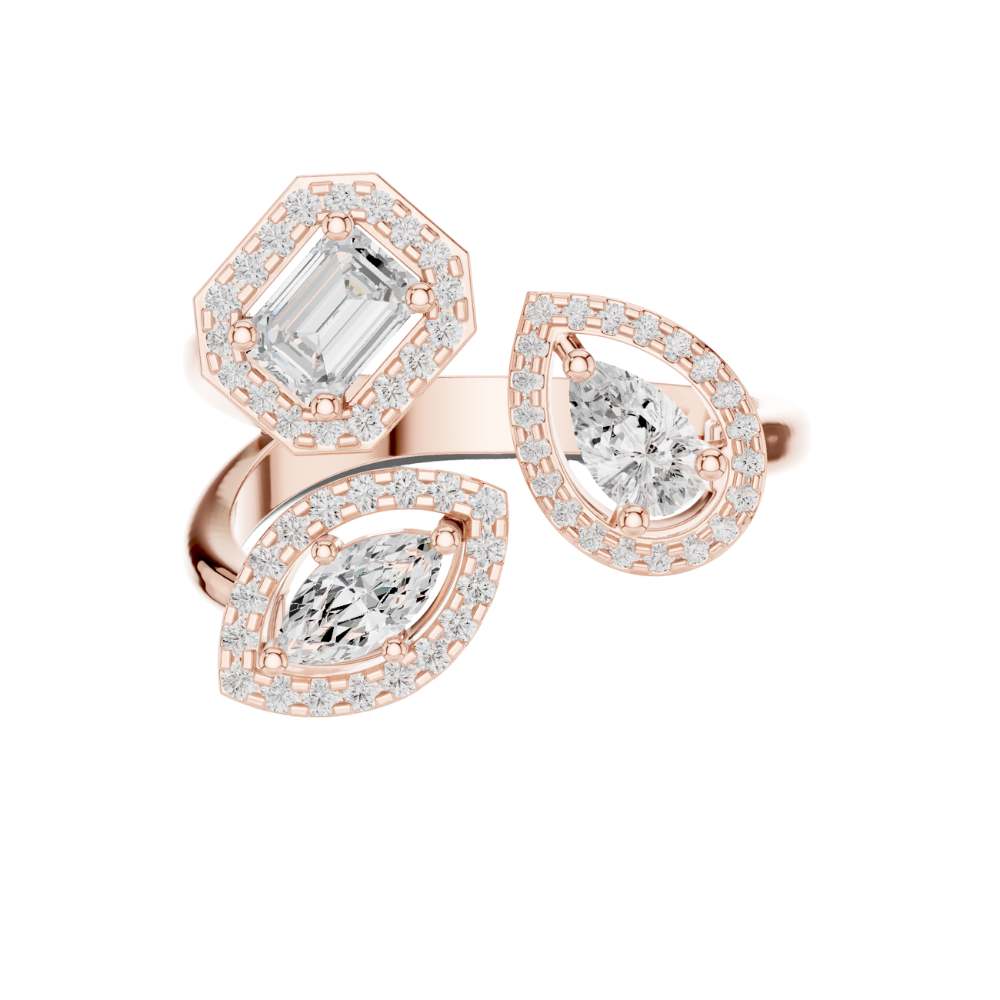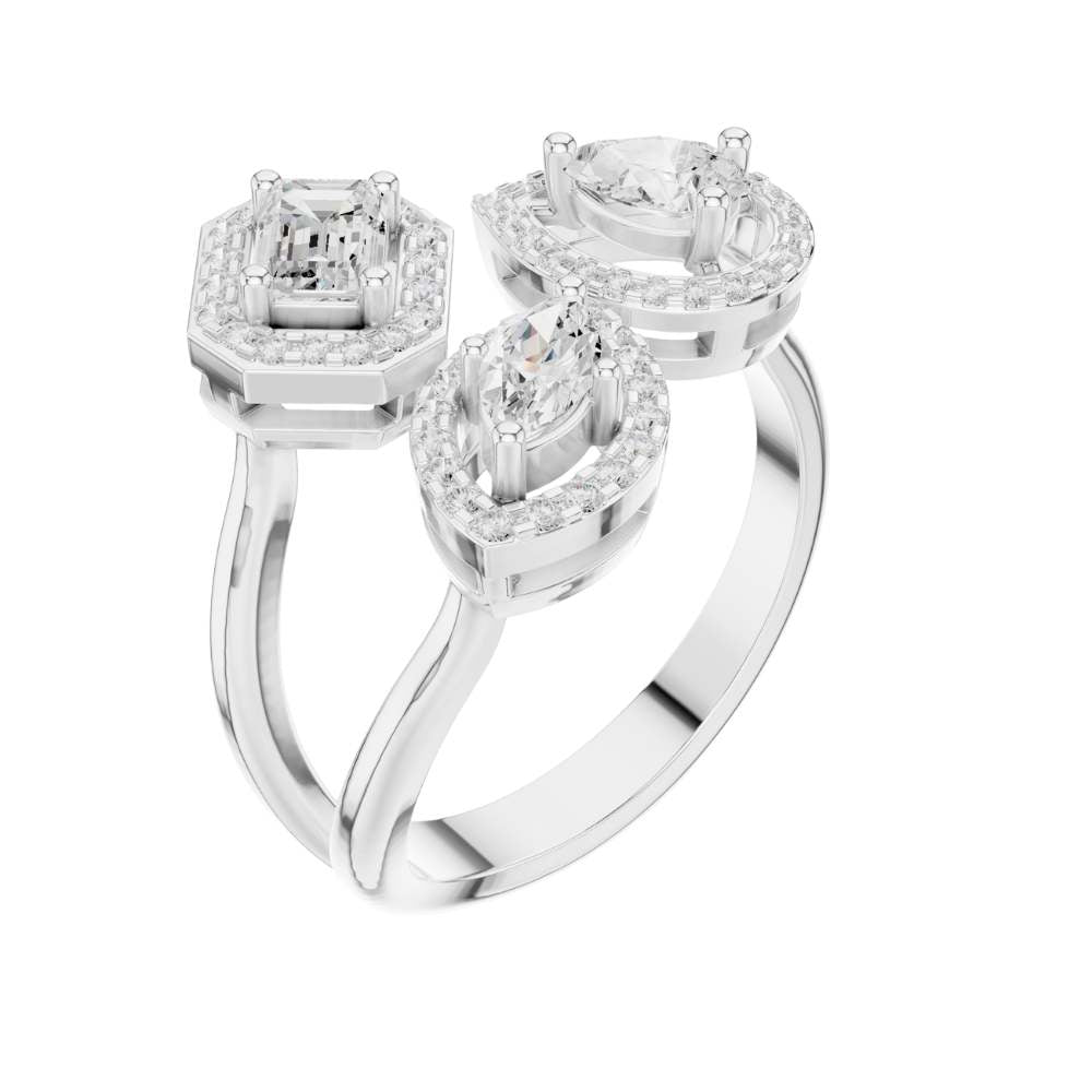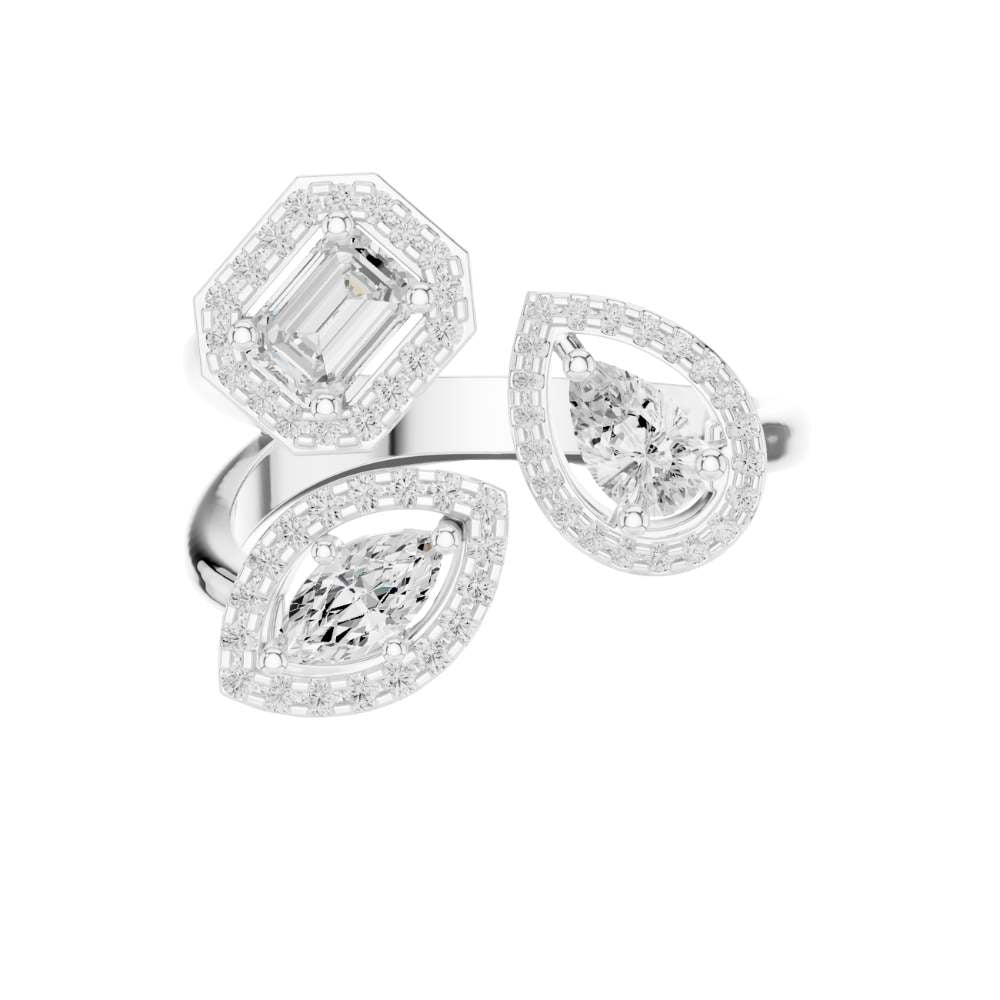 This striking ring showcases a modern trio of distinct diamond shapes—an emerald-cut, a pear-cut, and a marquise-cut—each framed by a delicate halo of brilliant pave diamonds. The open-bypass design creates an elegant sense of movement, allowing the stones to complement one another while adding dimension and sparkle from every angle. Bold yet refined, this piece blends contemporary artistry with timeless luxury, making it a captivating statement ring for any sophisticated collection.