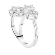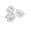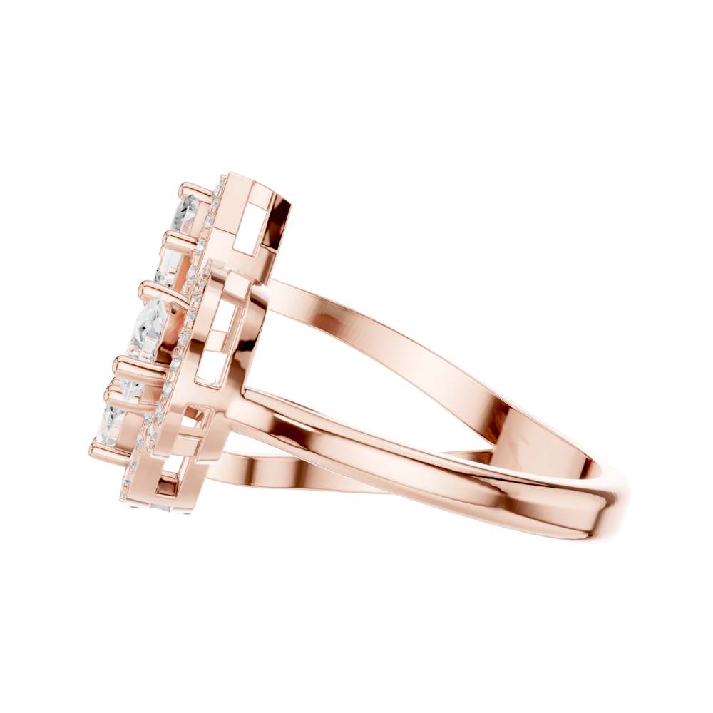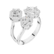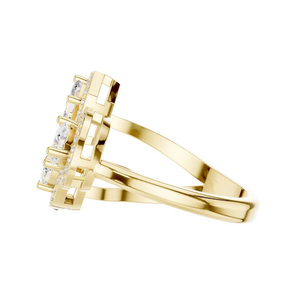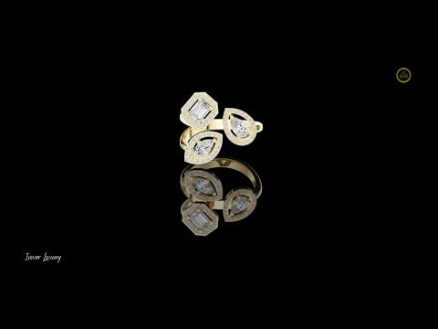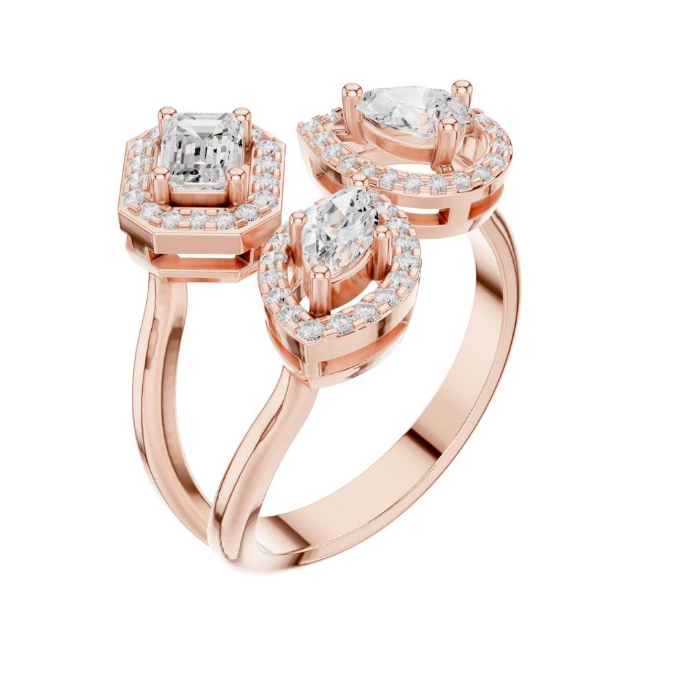 This striking ring showcases a modern trio of distinct diamond shapes—an emerald-cut, a pear-cut, and a marquise-cut—each framed by a delicate halo of brilliant pave diamonds. The open-bypass design creates an elegant sense of movement, allowing the stones to complement one another while adding dimension and sparkle from every angle. Bold yet refined, this piece blends contemporary artistry with timeless luxury, making it a captivating statement ring for any sophisticated collection.