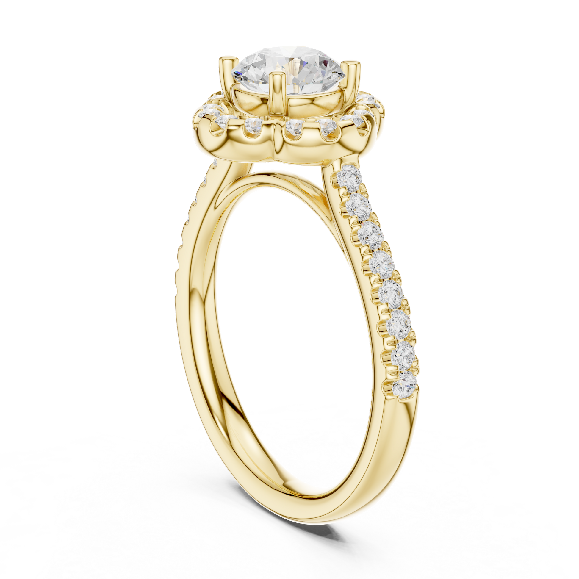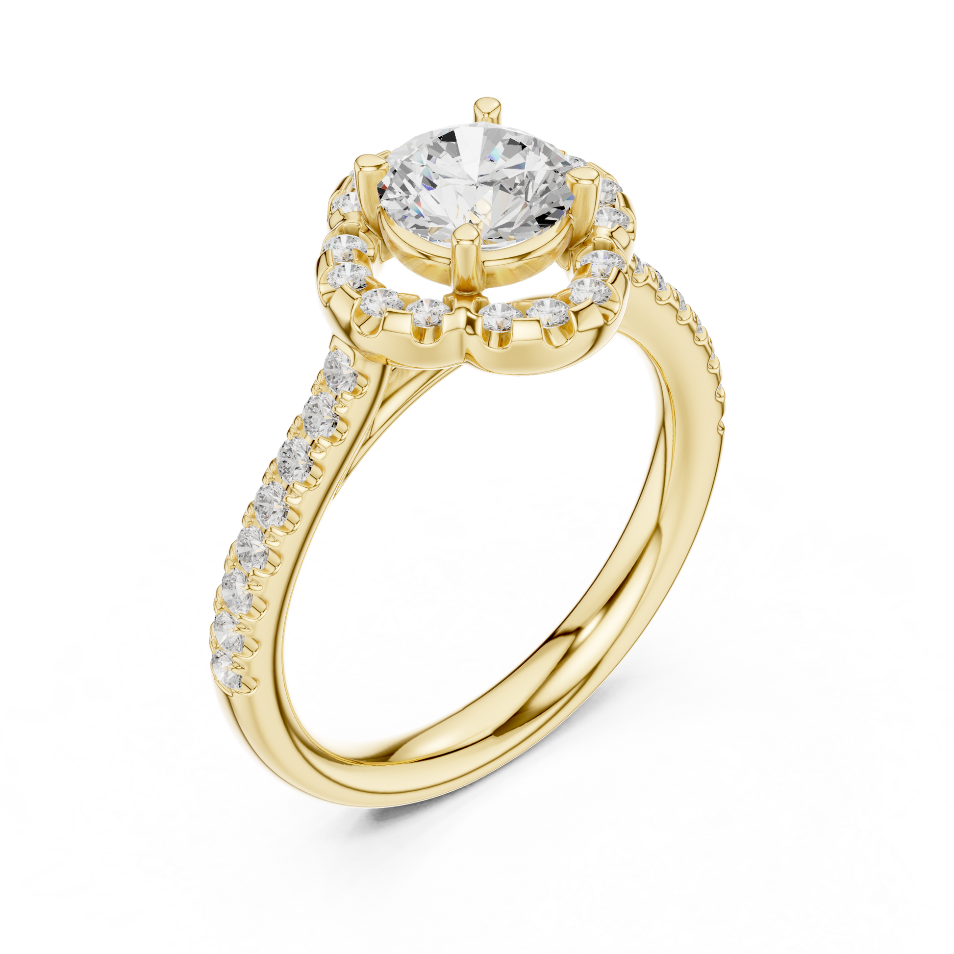 Experience the perfect blend of romance and brilliance with this captivating floral-halo diamond ring, masterfully crafted in glowing gold. A stunning round center diamond is surrounded by a petal-inspired halo of pavé stones, creating a luminous bloom of sparkle from every angle. The shimmering diamond-accented band adds an extra layer of radiance, making this ring a symbol of timeless love and feminine elegance. Ideal for engagements or anniversary celebrations, this breathtaking design delivers unmatched charm, beauty, and luxurious craftsmanship.