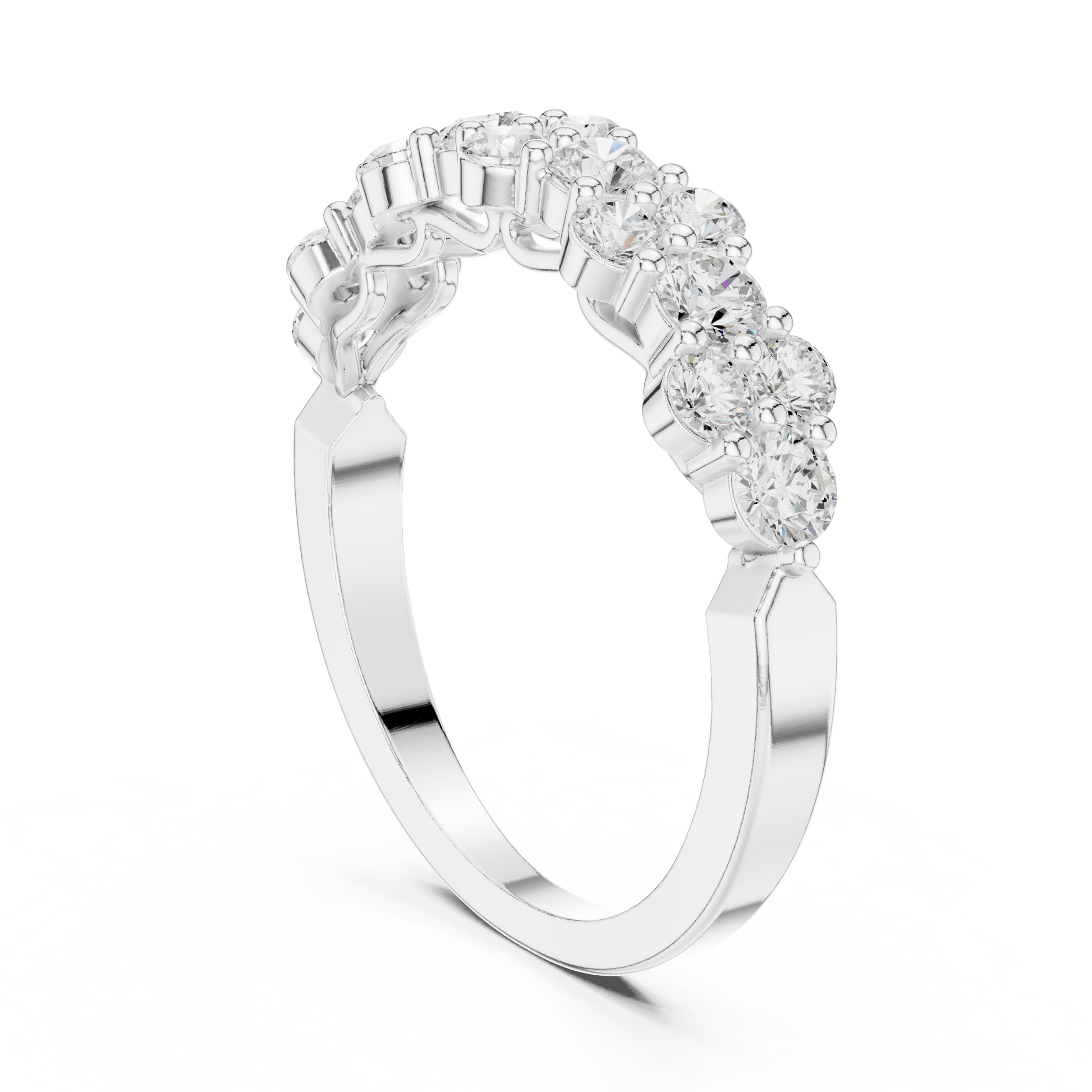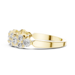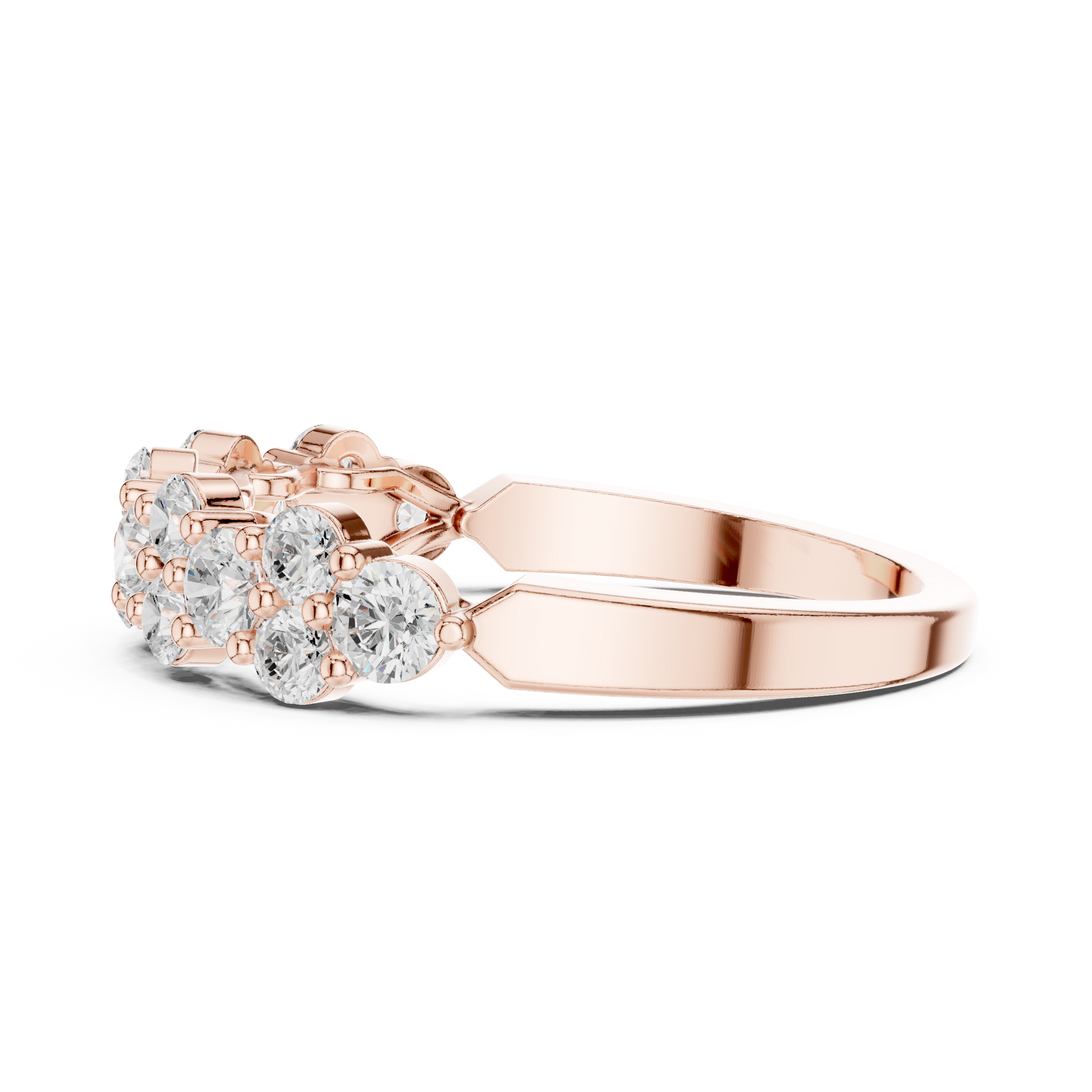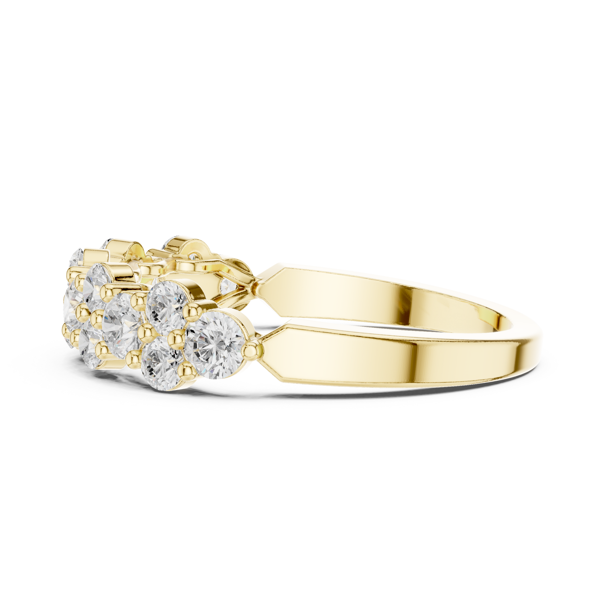 This elegant gold band features a stunning cluster of round brilliant diamonds arranged in a harmonious and eye-catching pattern. The prong-set diamonds create a delicate yet radiant effect, capturing light from every angle for exceptional sparkle. Perfect as a statement piece or a complementary stackable ring, this band offers a timeless blend of classic design and contemporary glamour, ideal for everyday wear or special occasions. The polished gold setting enhances the brilliance of the diamonds, adding warmth and sophistication to this exquisite piece.