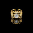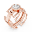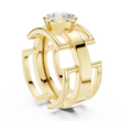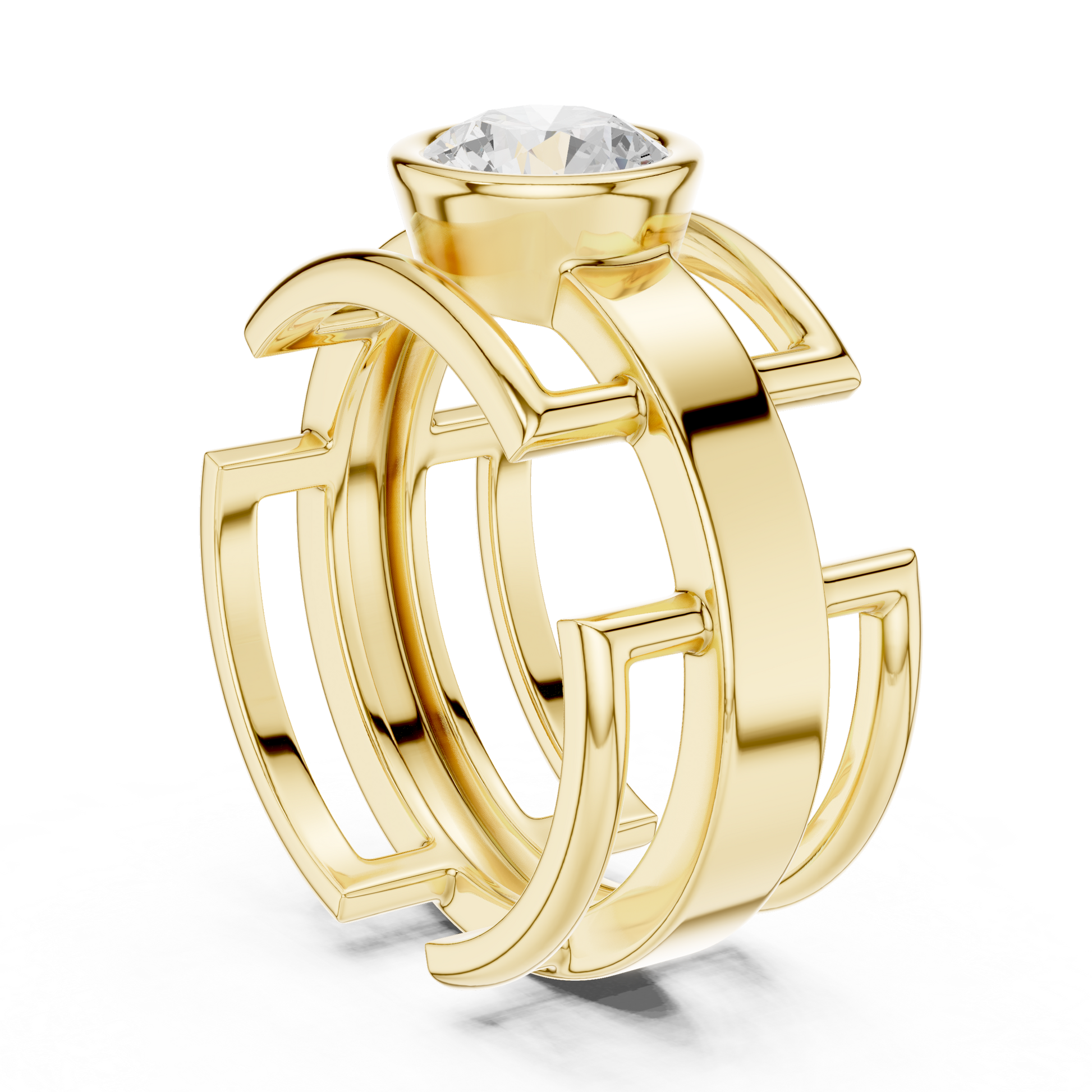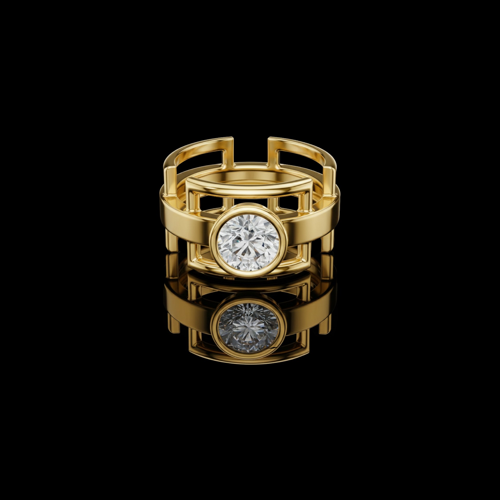 Crafted for those who appreciate bold design and refined craftsmanship, this exceptional ring showcases a radiant round-cut diamond secured within a sleek bezel setting, offering both strength and sophistication. The intricately structured gold band reveals an architectural open-frame design, creating depth, dimension, and visual intrigue from every angle.the luxurious construction enhances the diamond’s brilliance while delivering a confident, contemporary aesthetic.