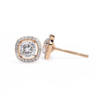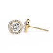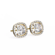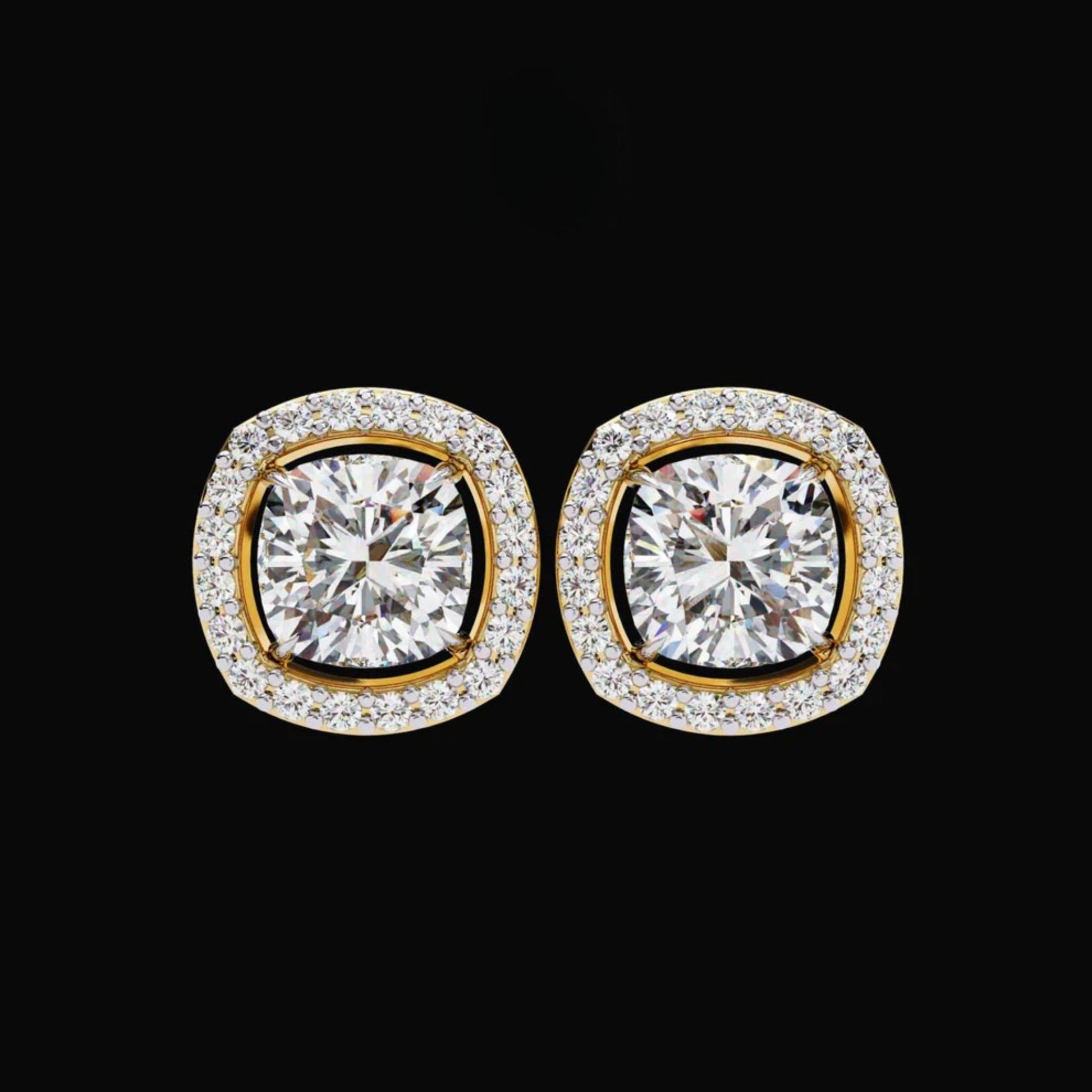 These elegant stud earrings feature dazzling cushion-cut center stones set in warm gold bezels, surrounded by a round-shaped halo of smaller sparkling diamonds that enhance their brilliance. The contrast between the radiant central stones and the delicate halo creates a timeless, luxurious look, while the symmetrical design adds sophistication and refined charm. Perfect for both everyday elegance and special occasions, these earrings exude classic glamour with a modern touch.