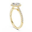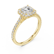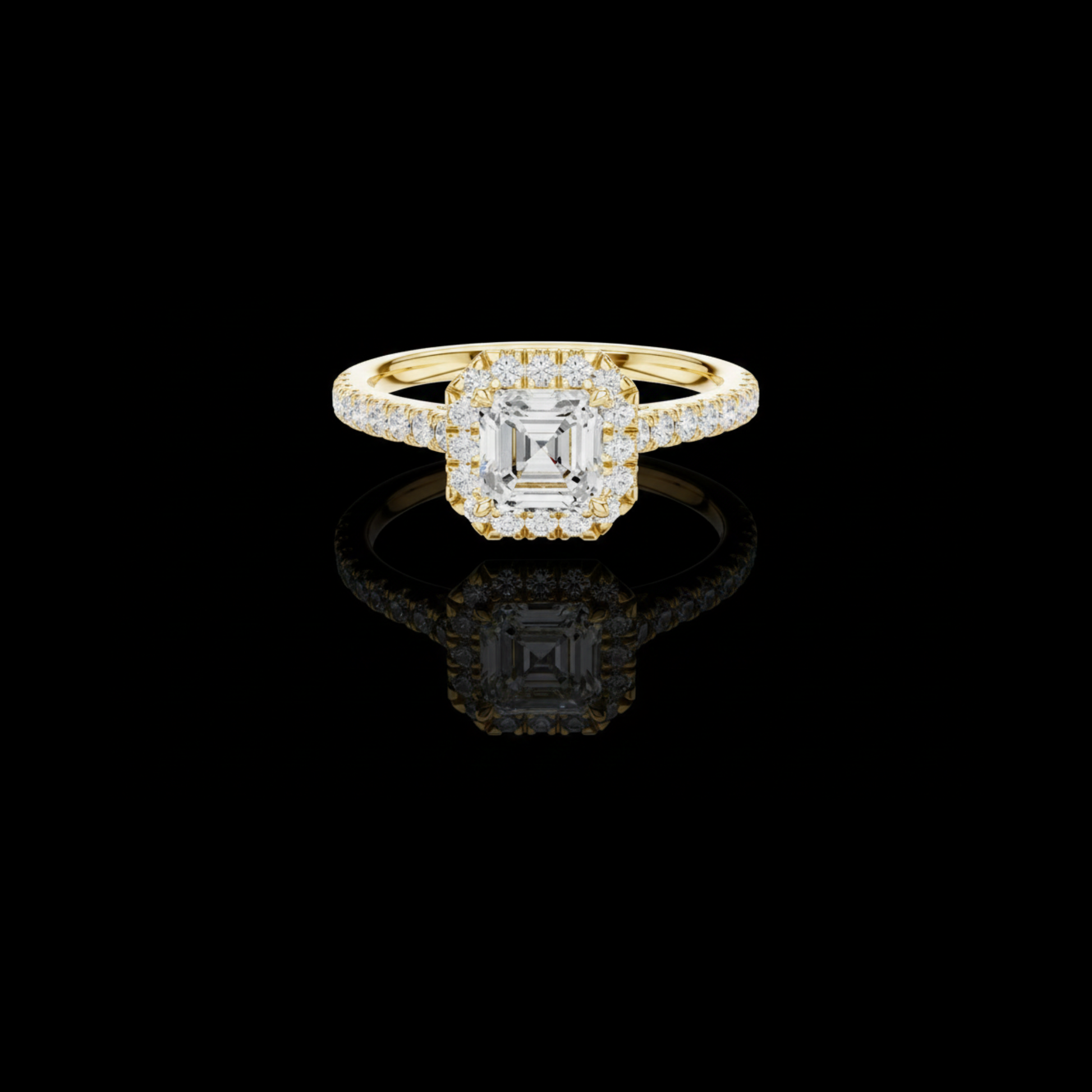 This exquisite engagement ring showcases a striking Asscher-cut diamond at its center, celebrated for its crisp geometry and mesmerizing step-cut brilliance. Framed by a delicate halo of round brilliant diamonds, the centerpiece is enhanced with added depth, sparkle, and vintage-inspired elegance. The slim yellow gold band is adorned with pave-set diamonds that extend halfway around the shank, creating a refined shimmer from every angle by Ivevar.